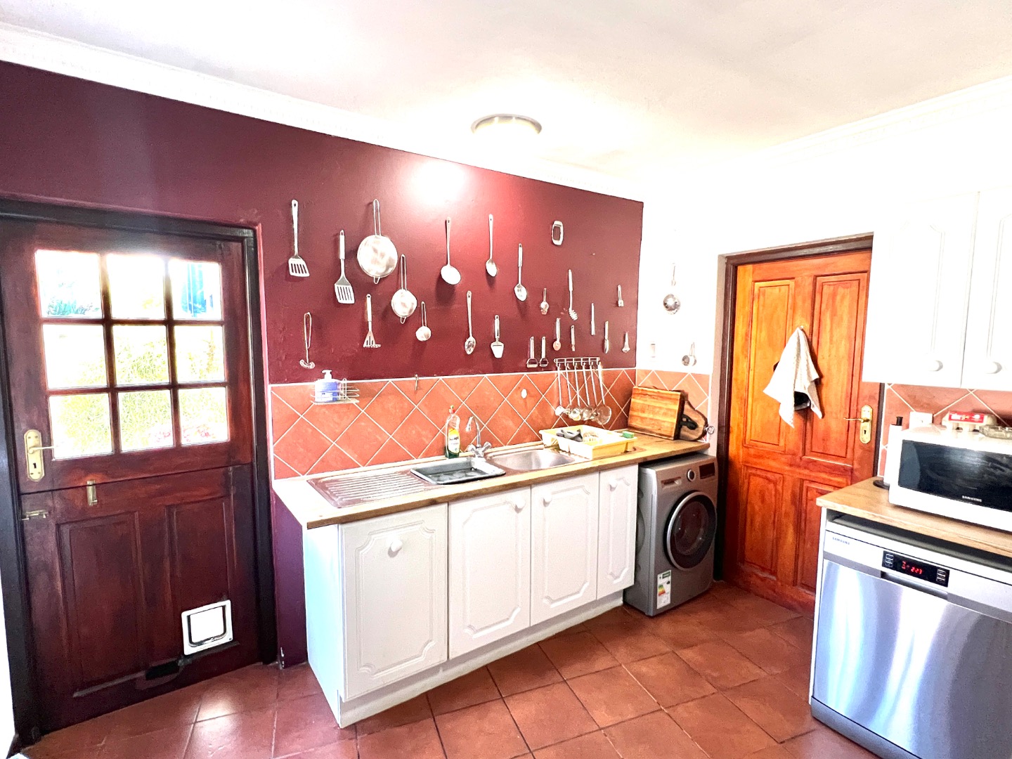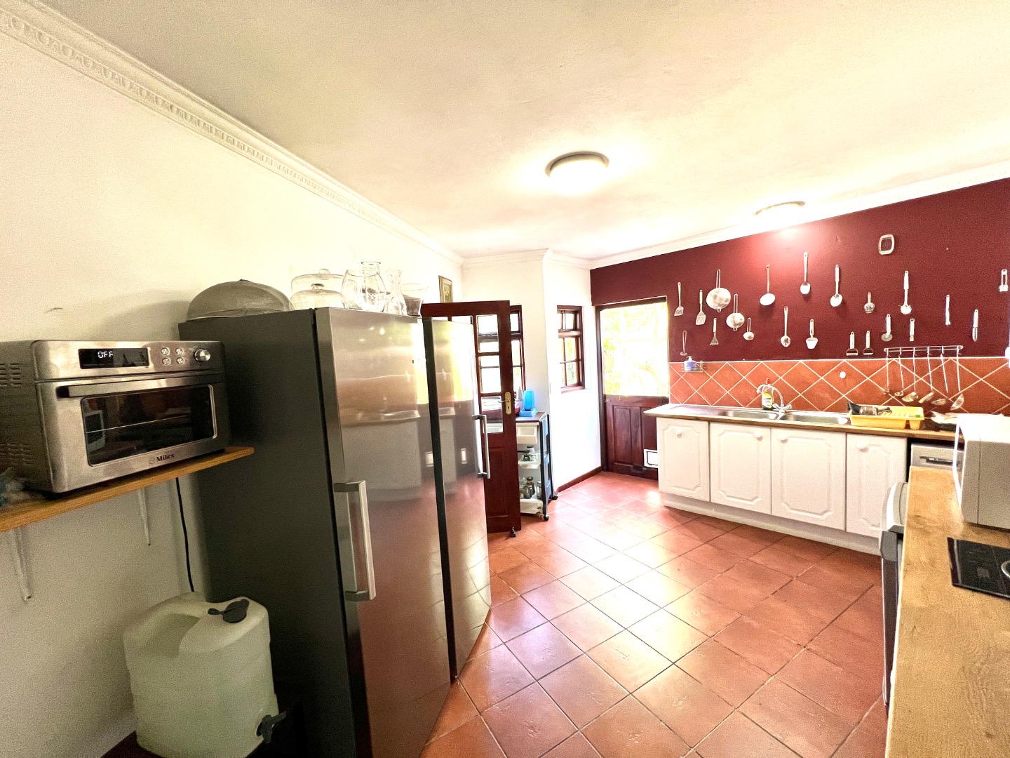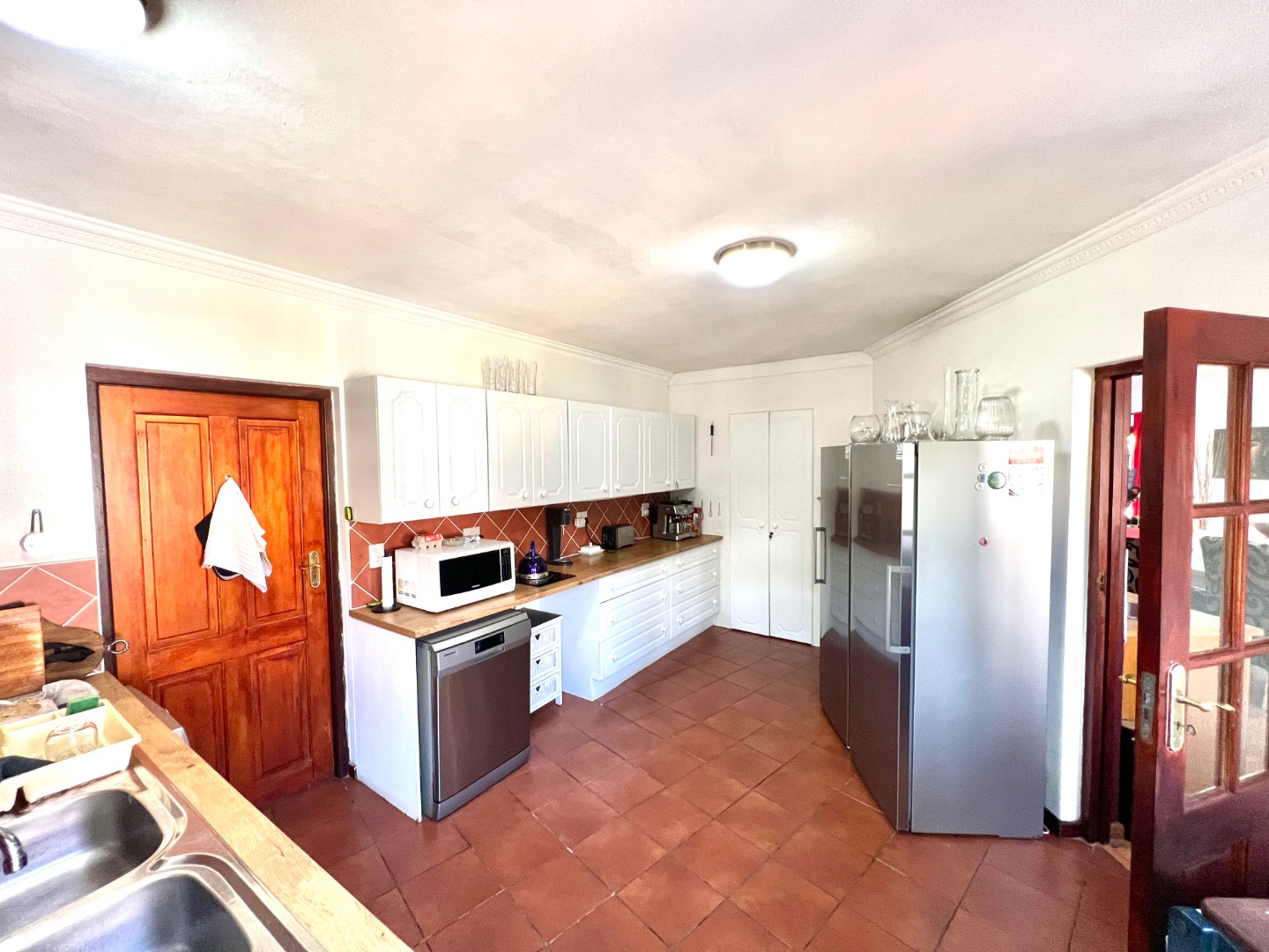 - A warm, farm-style kitchen, Gas Stove & electric Oven, serene garden views, flowing into a scullery with walk-in pantry, ample space for all your appliances, and direct access to the double garage.