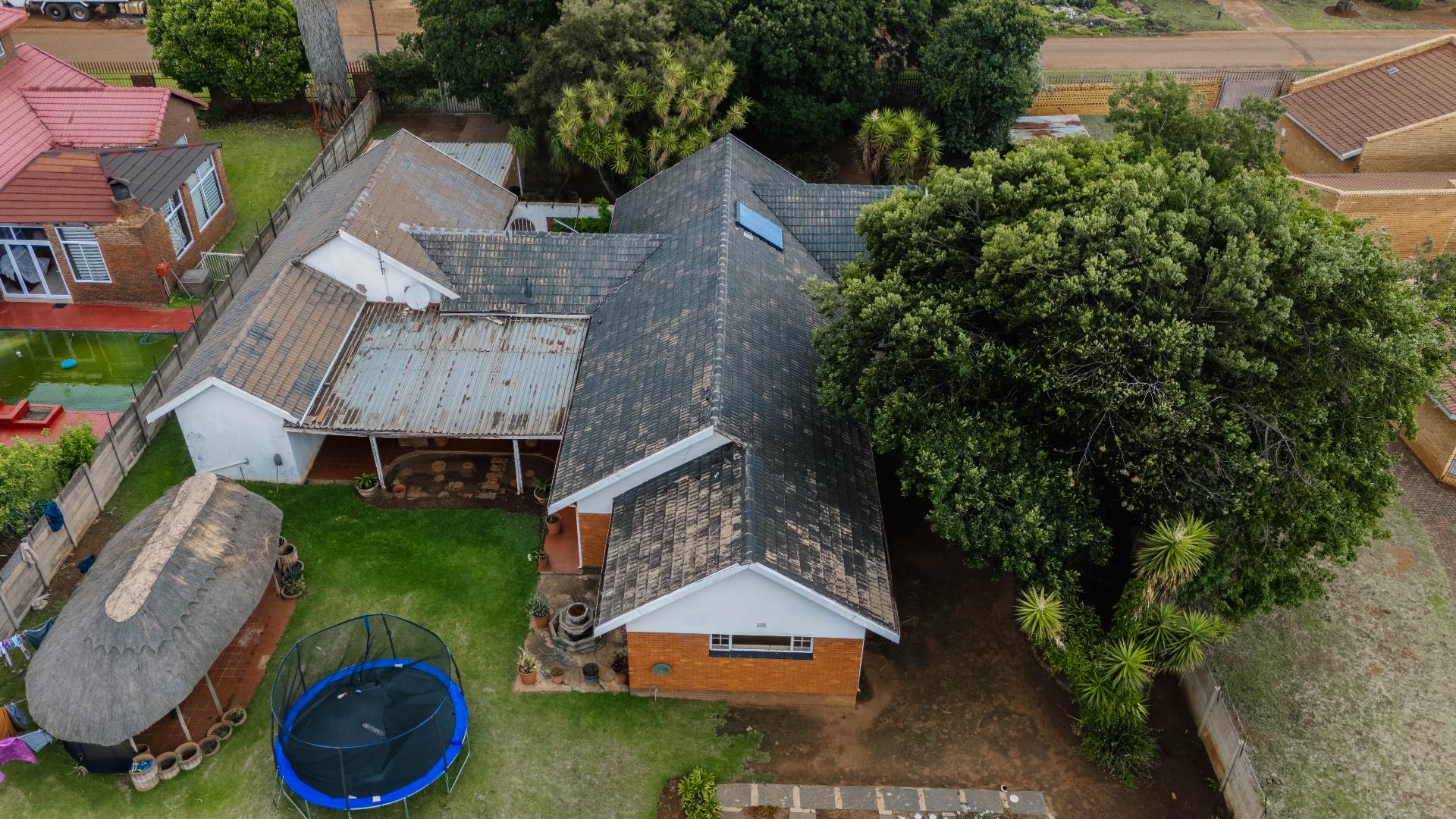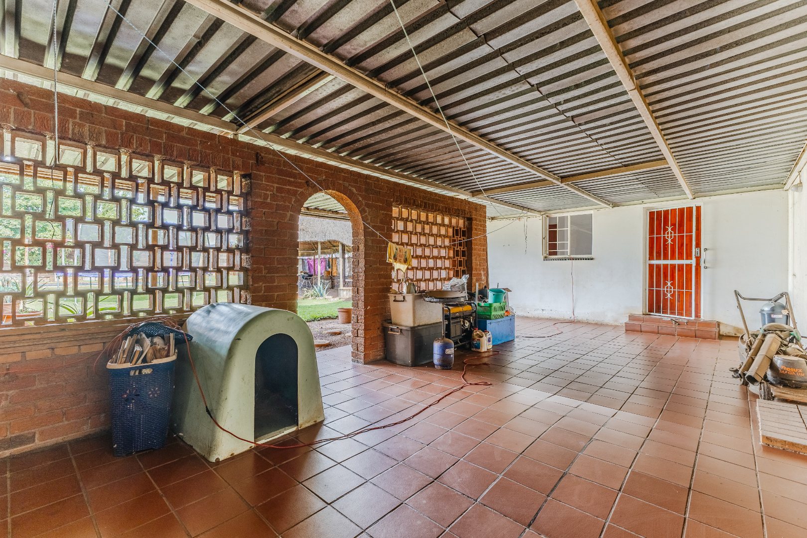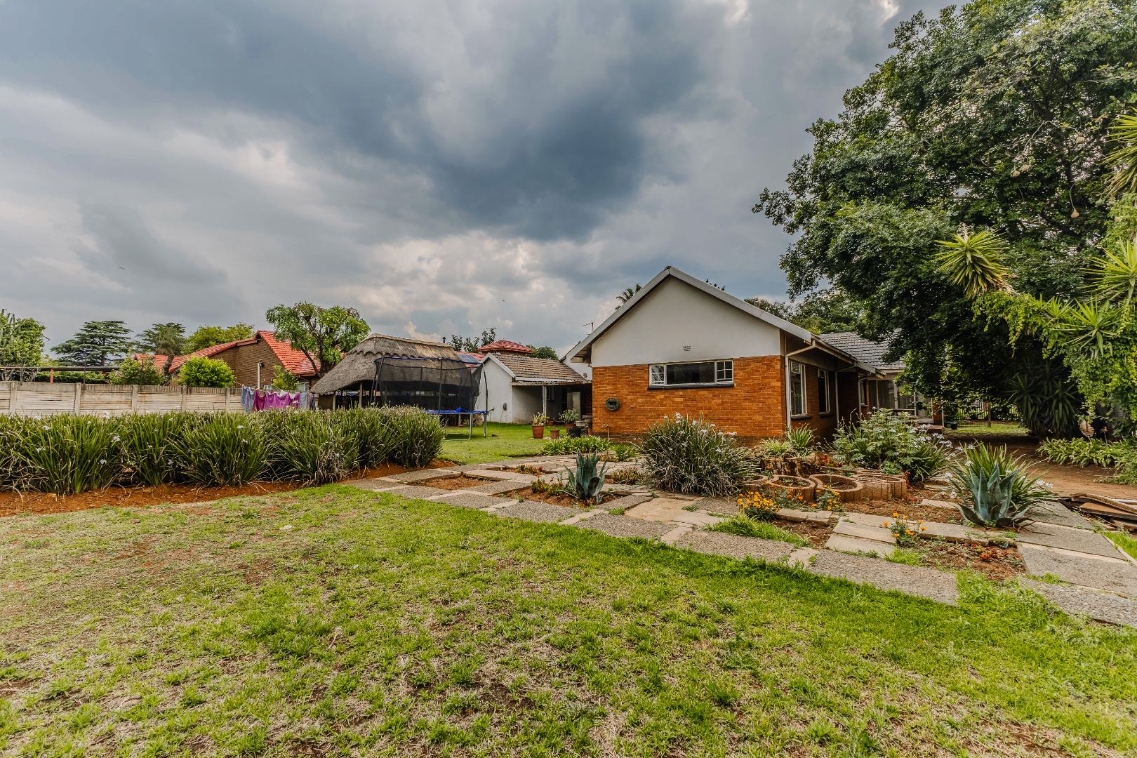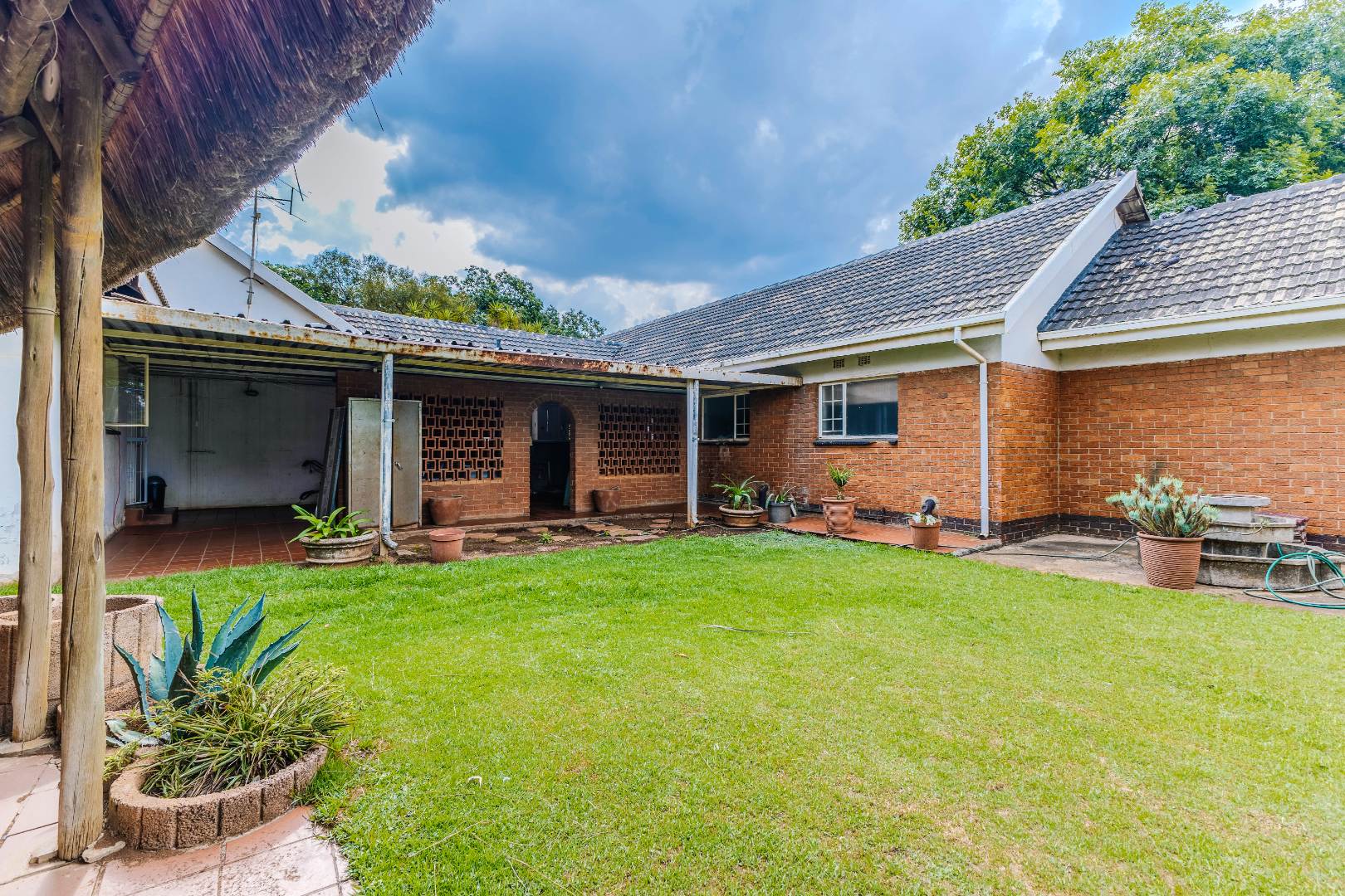 Outdoor living is a highlight, with a vast green lawn, a private swimming pool, and a unique thatch-roofed lapa, ideal for year-round entertainment and relaxation. Mature trees provide natural shade and privacy, creating a serene environment. The property is further enhanced by an irrigation system and a borehole, ensuring a lush garden with ease.