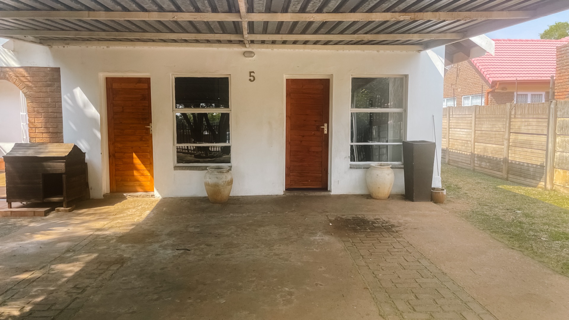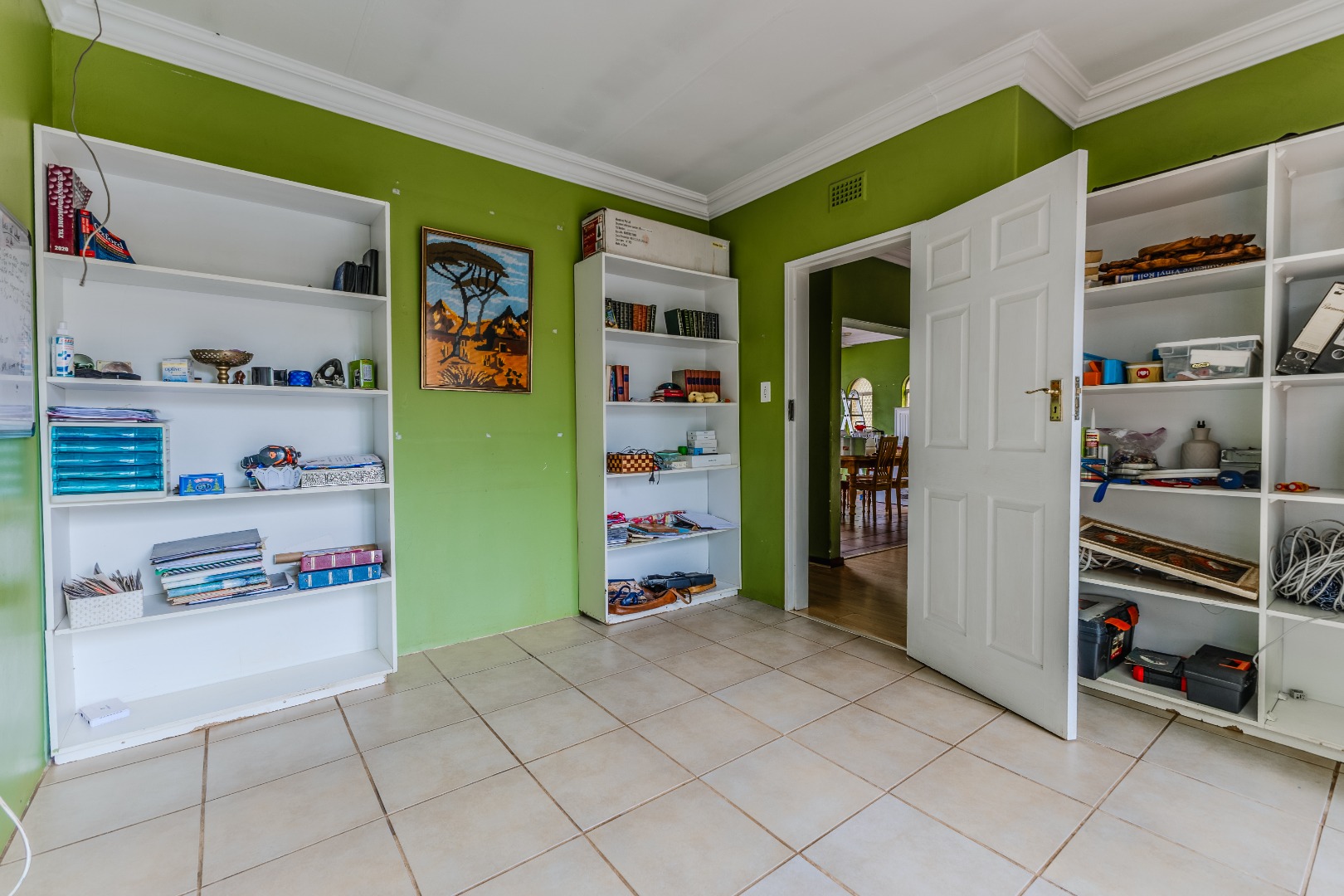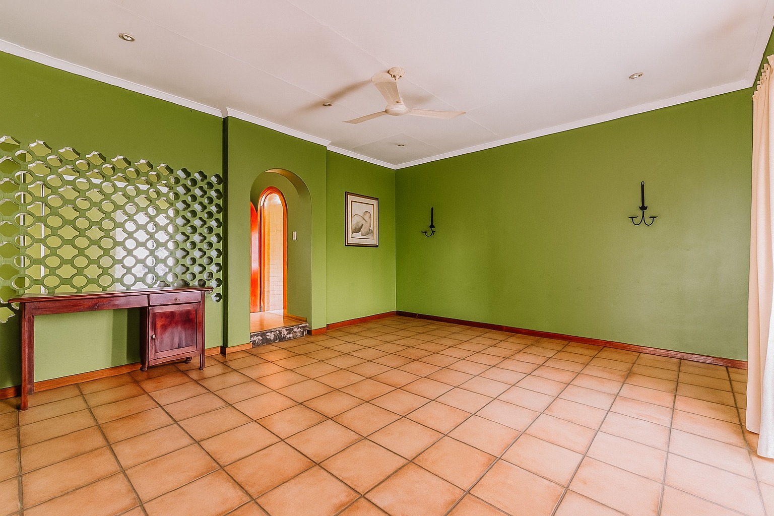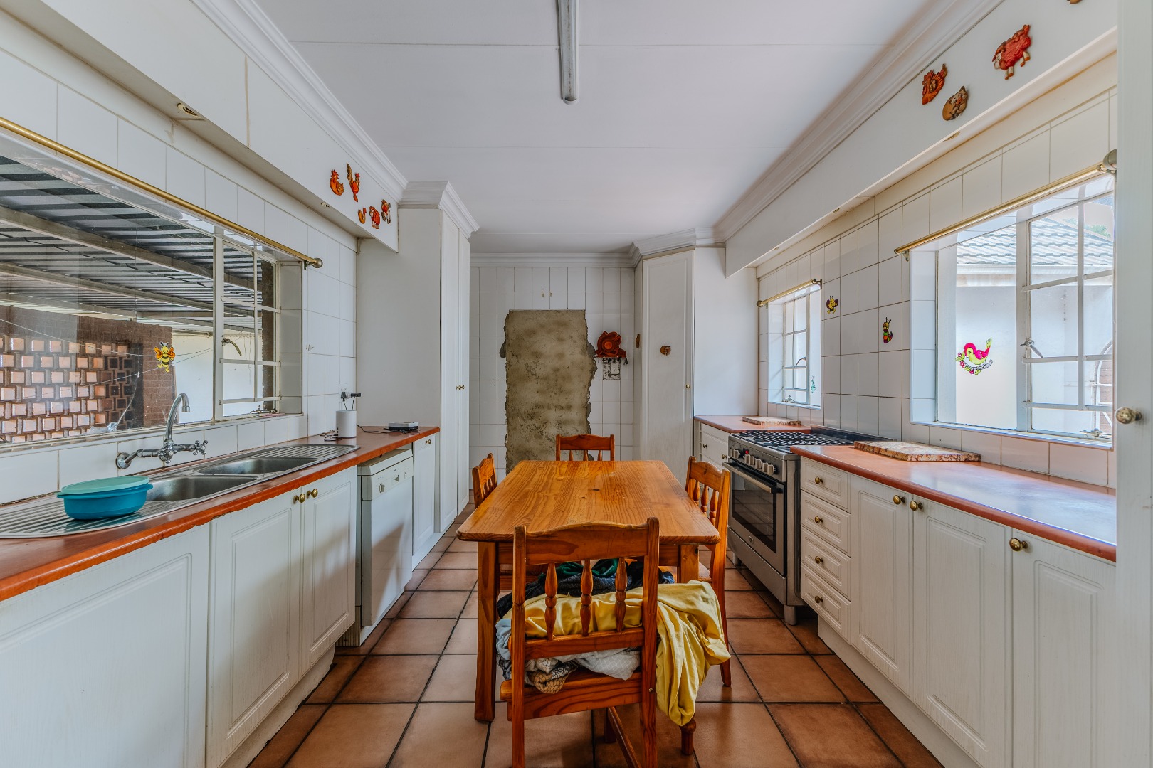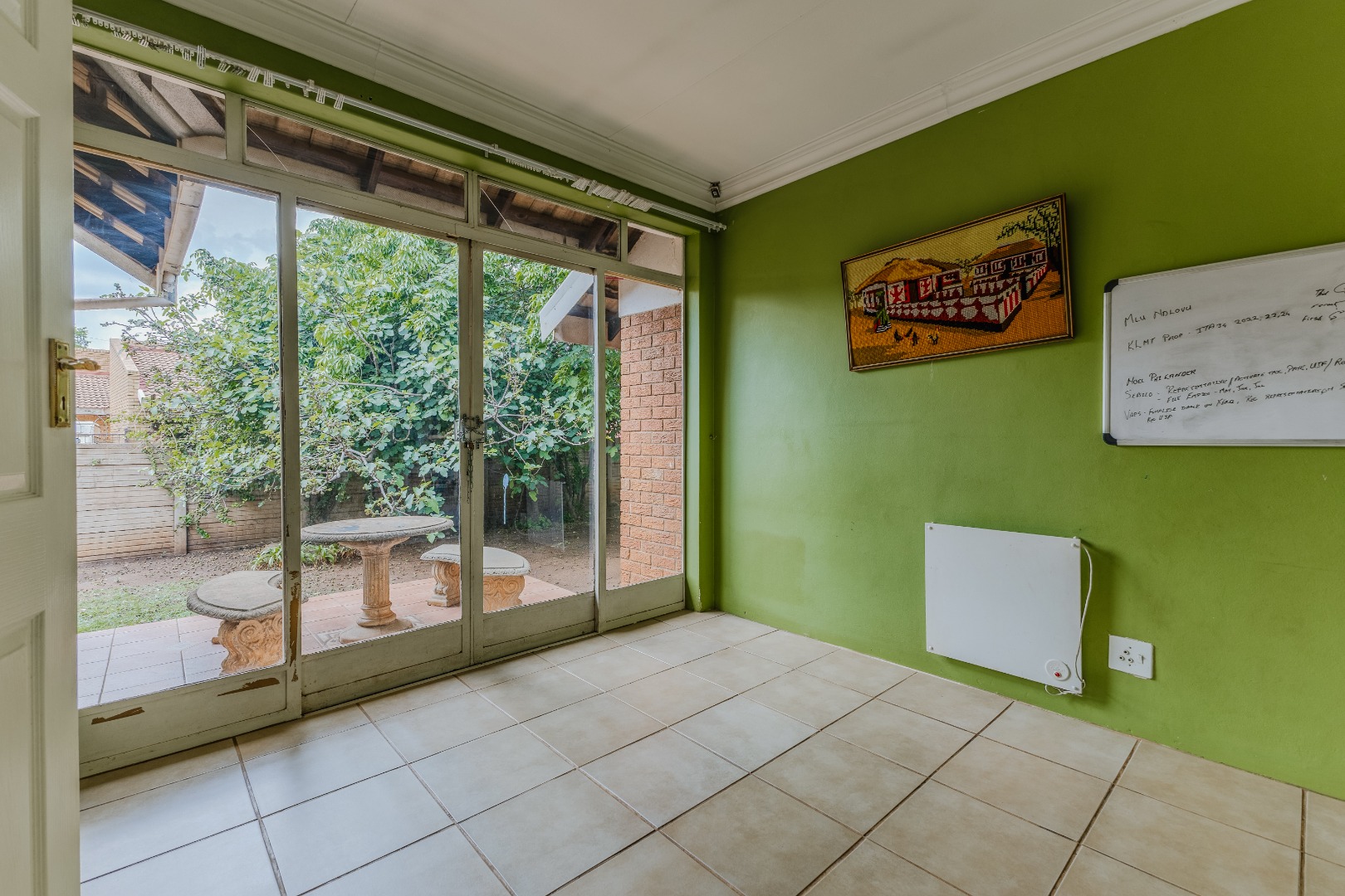 Outdoor living is a highlight, with a vast green lawn, a private swimming pool, and a unique thatch-roofed lapa, ideal for year-round entertainment and relaxation. Mature trees provide natural shade and privacy, creating a serene environment. The property is further enhanced by an irrigation system and a borehole, ensuring a lush garden with ease.