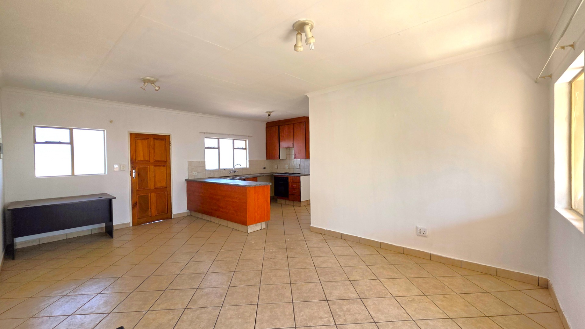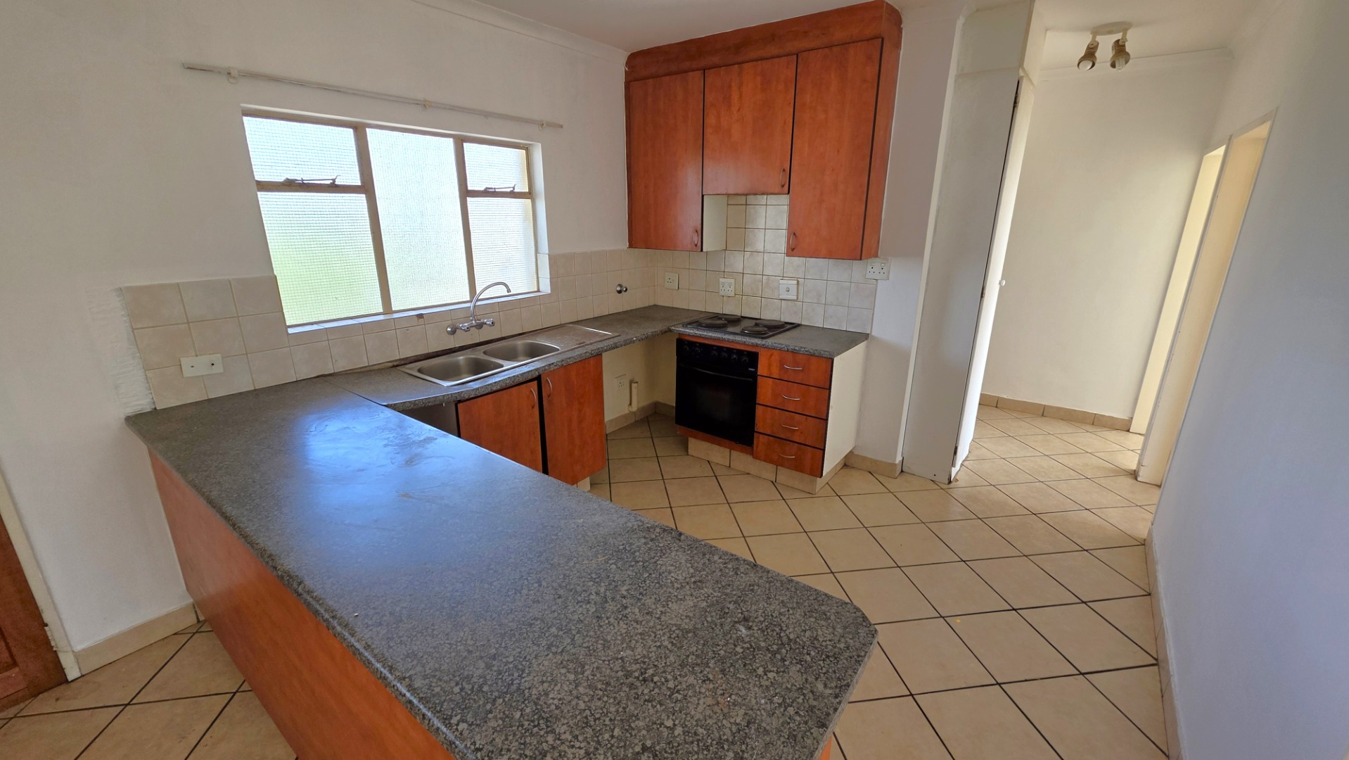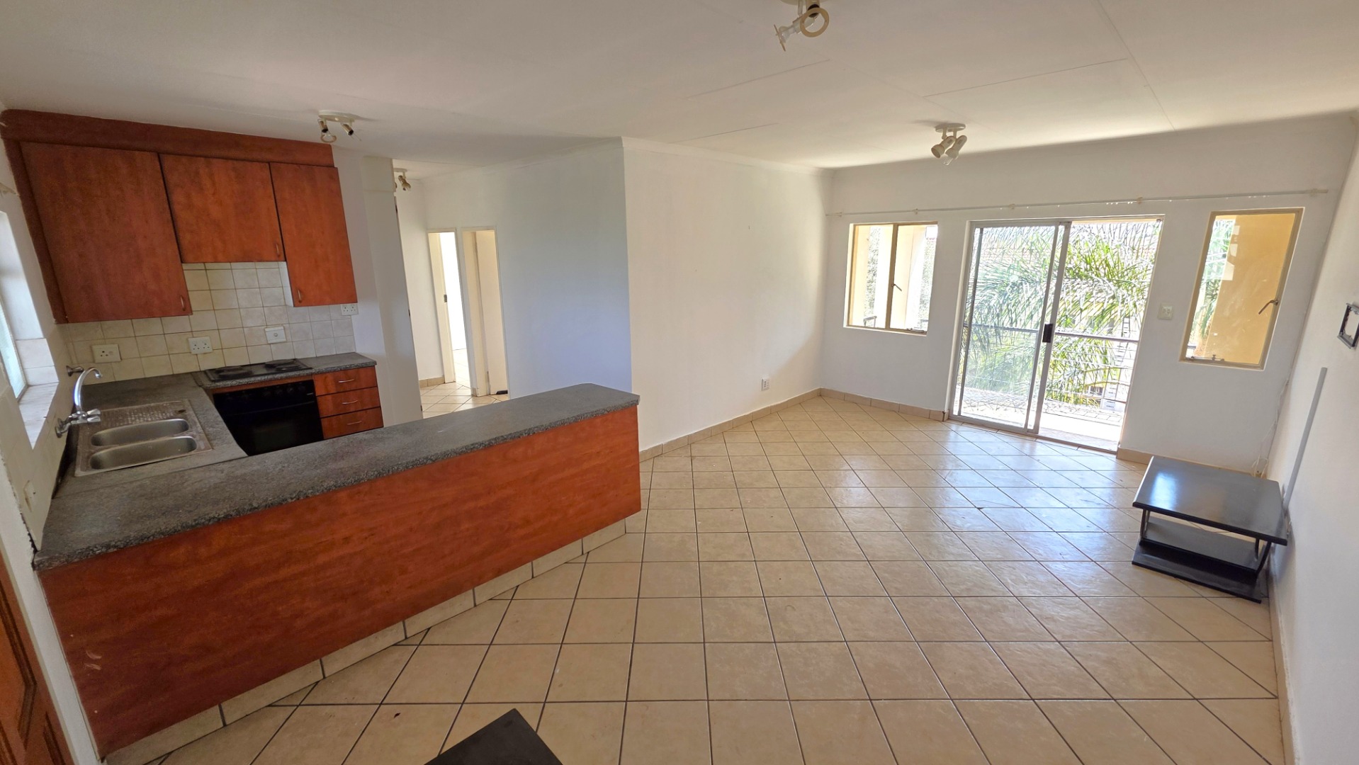 The apartment features two spacious bedrooms fitted with built-in cupboards, including a main bedroom with an en-suite bathroom. The open-plan layout seamlessly connects the kitchen and lounge, with ample space to accommodate a dining area and a double-door fridge, creating a functional and welcoming living environment.