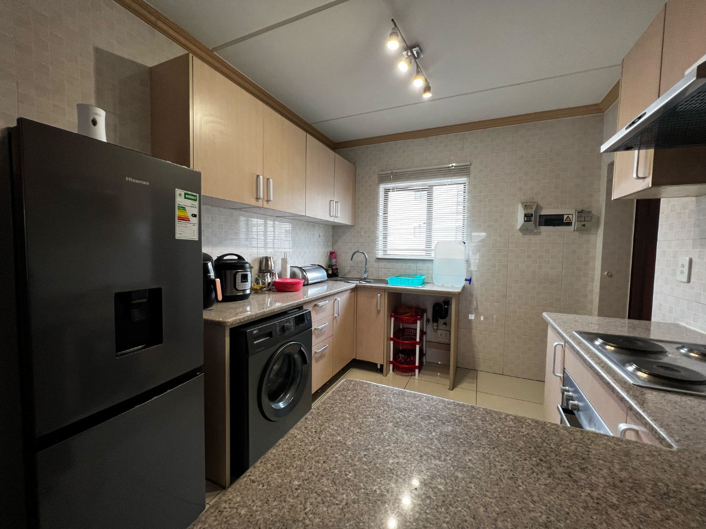 Designed with functionality in mind, the unit offers an open-plan kitchen with ample cupboard space, sleek countertops, and room for appliances, seamlessly connecting to a bright and airy living area. Large windows and a private patio/balcony create a welcoming atmosphere and allow natural light to flow throughout the space.
