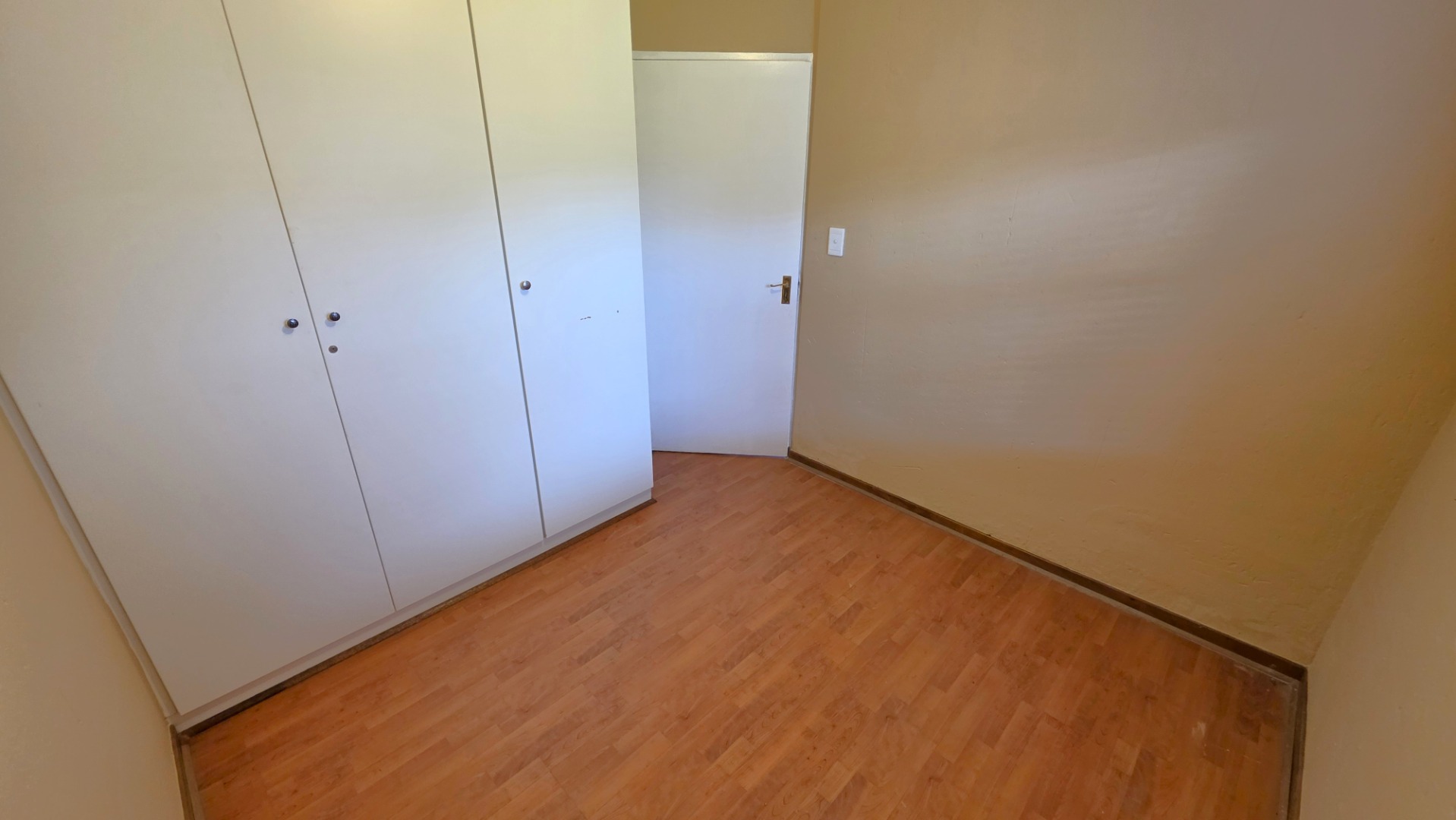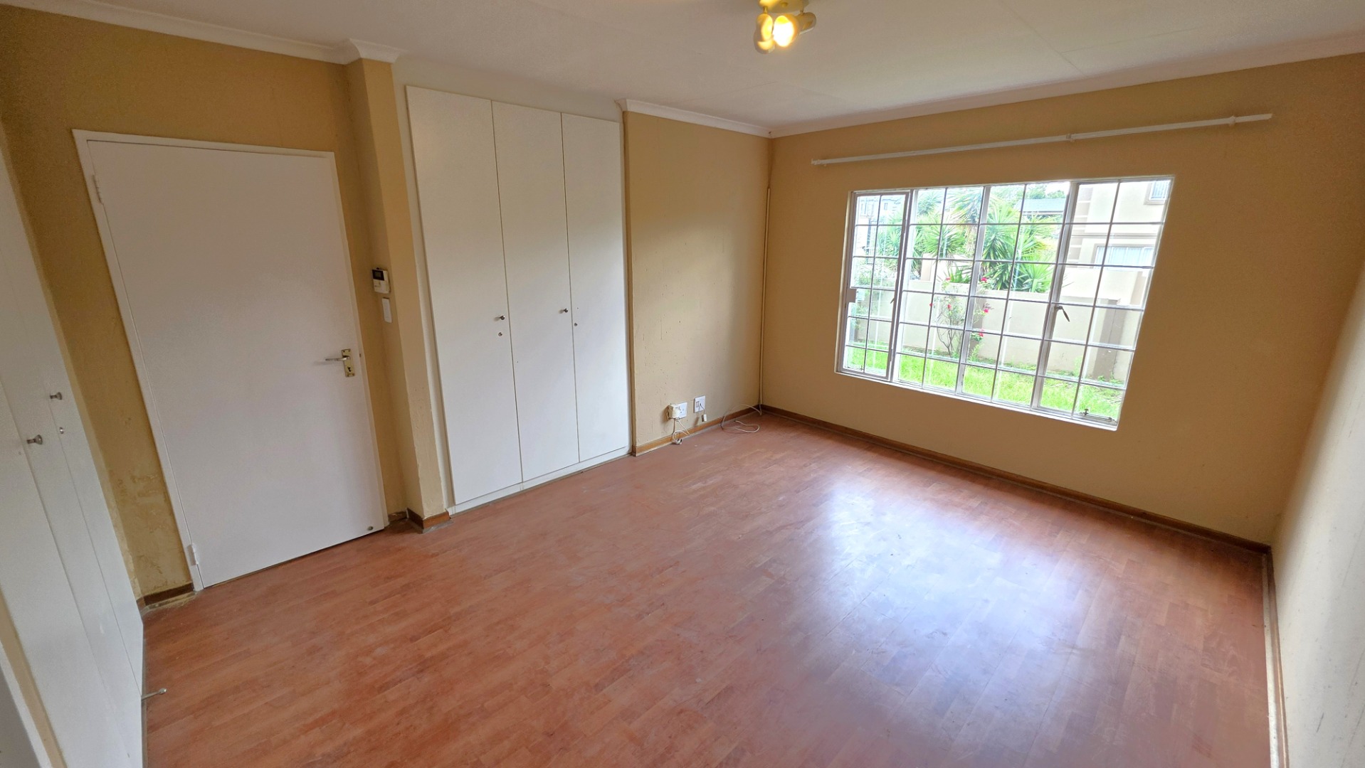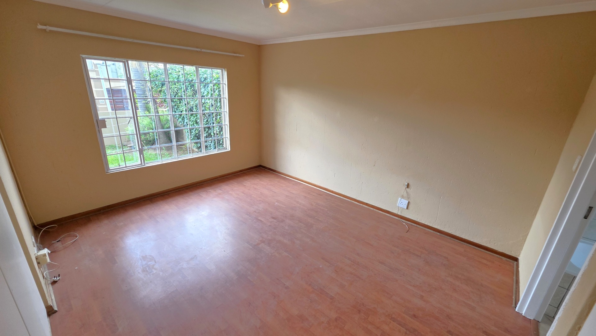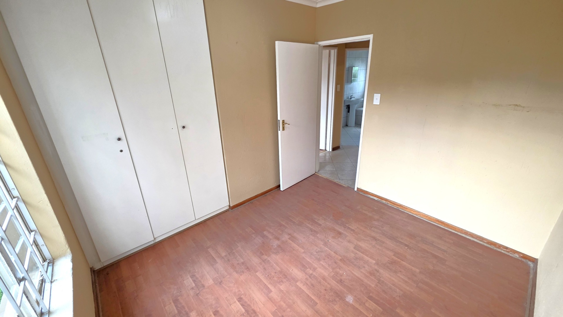 The home features three bedrooms with laminated flooring throughout. The main bedroom is spacious and includes an en-suite bathroom, while the other two bedrooms share a full bathroom.