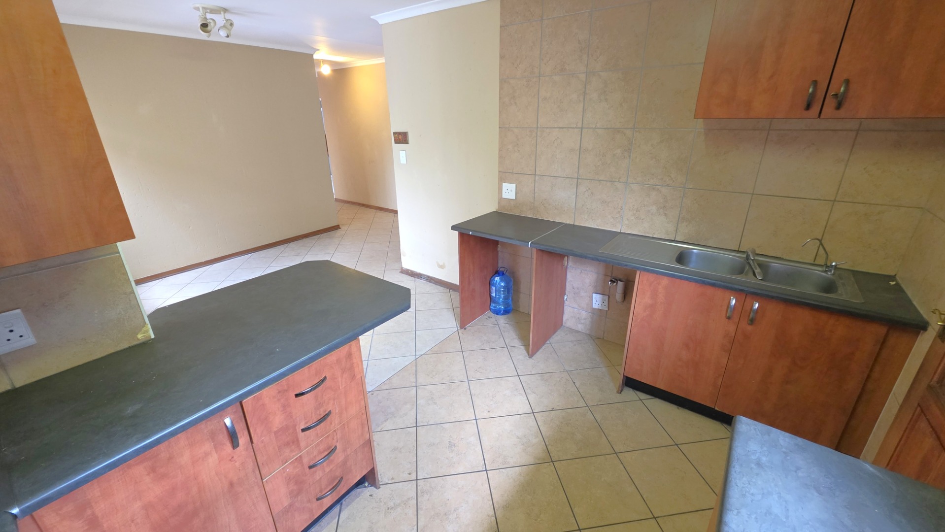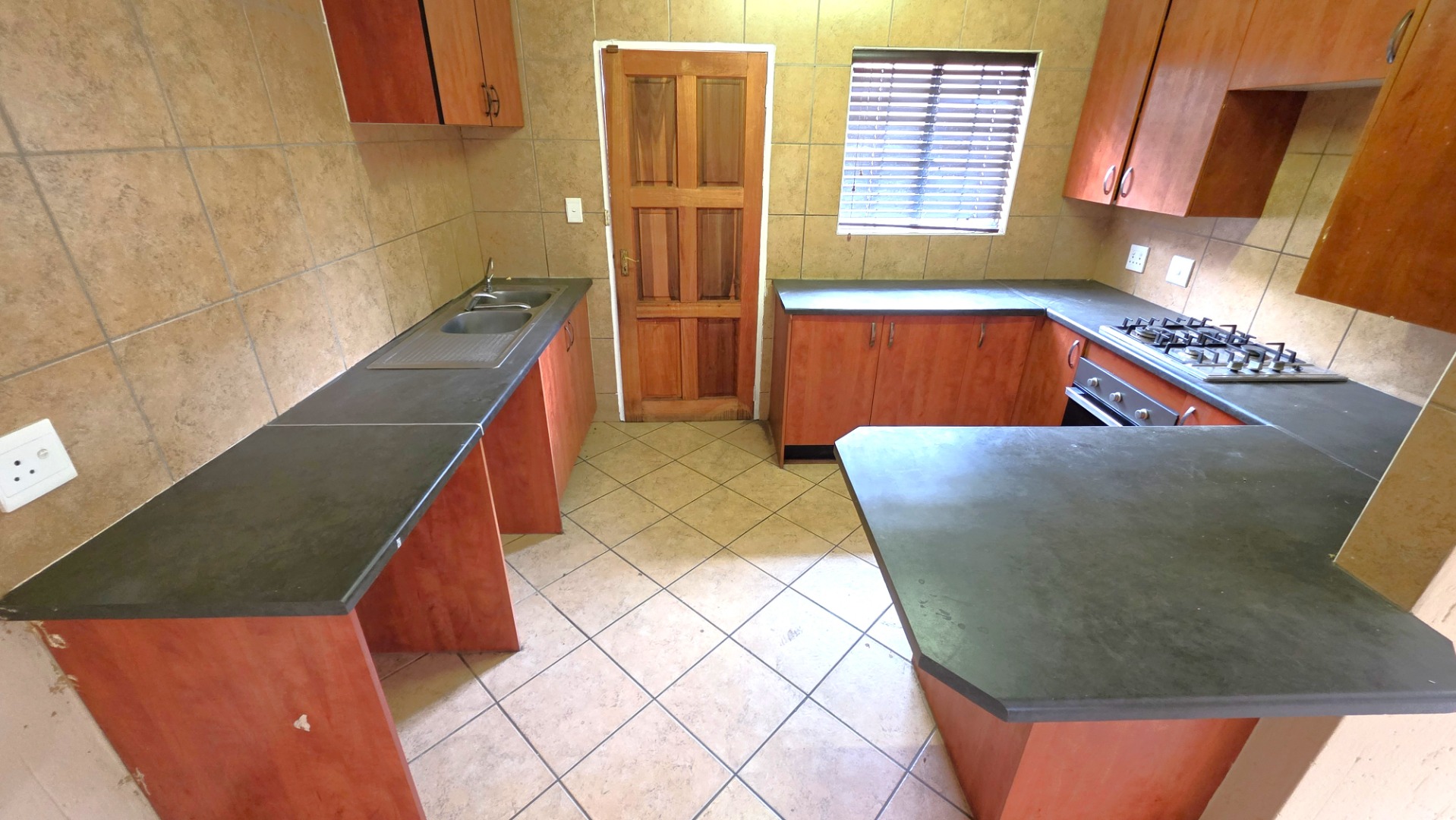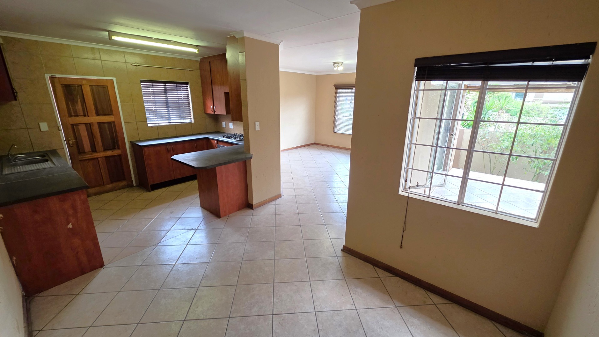 The kitchen is fitted with built-in cupboards and a gas hob, and flows seamlessly into the open-plan lounge and dining area—perfect for comfortable family living and entertaining.