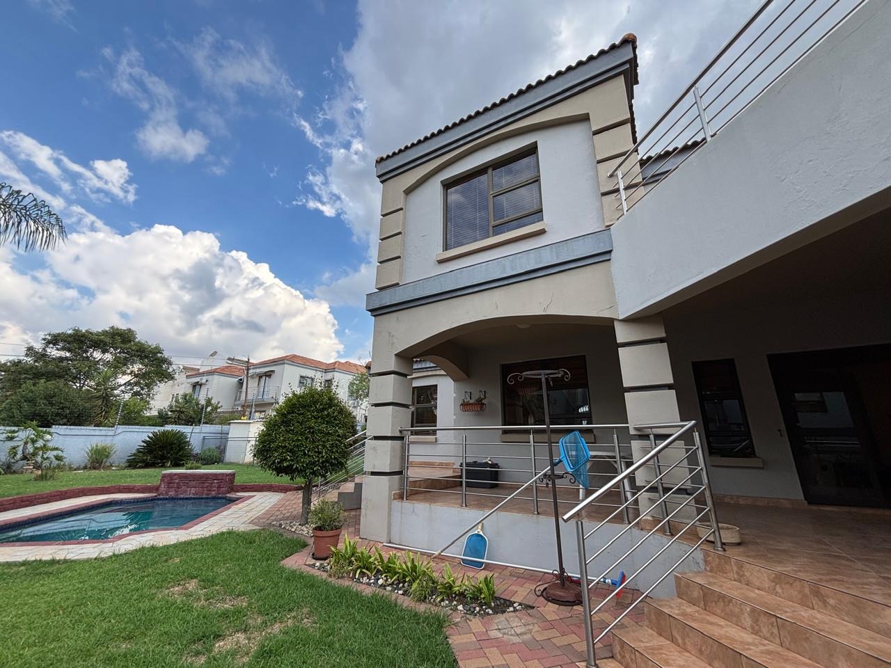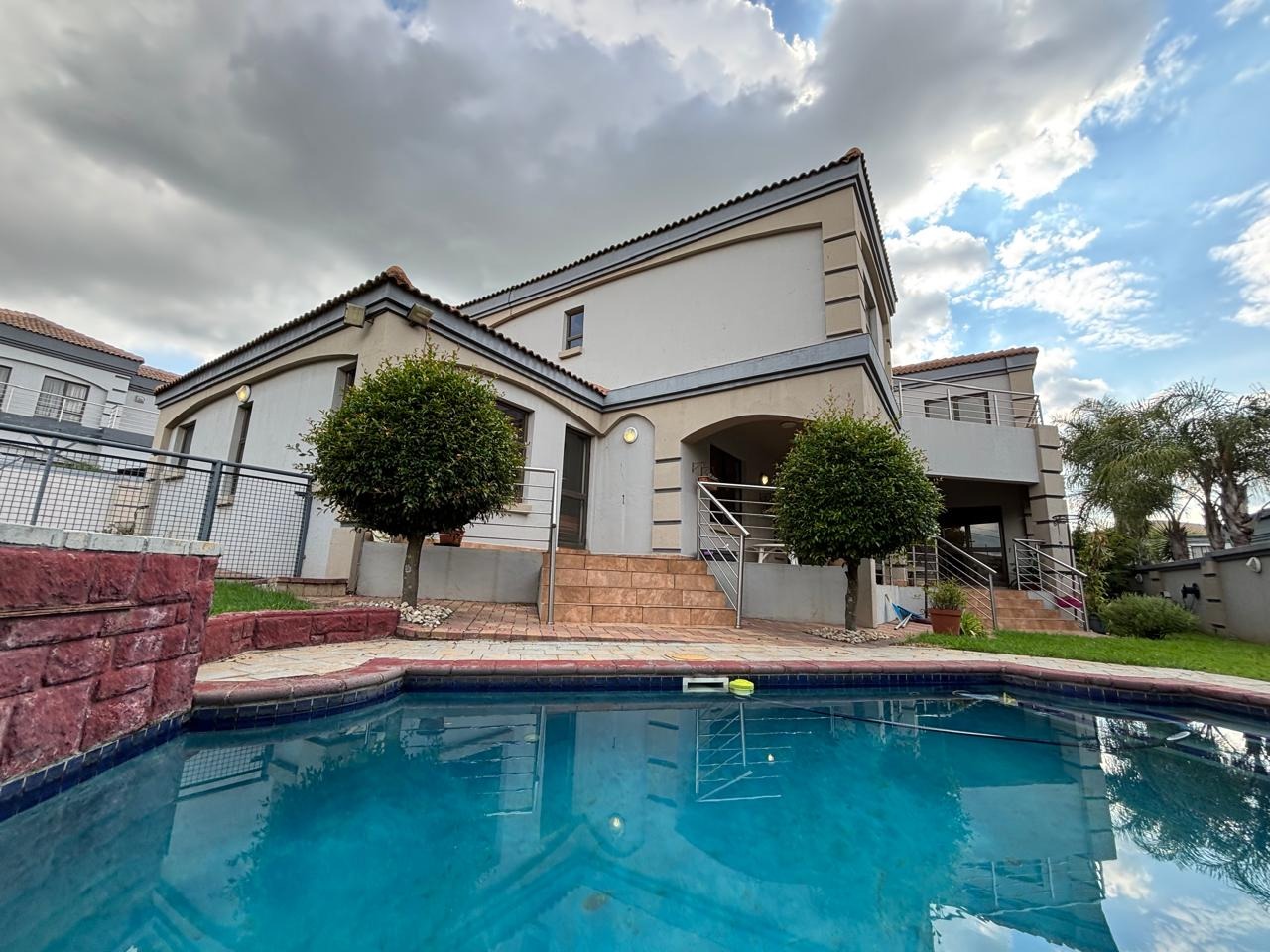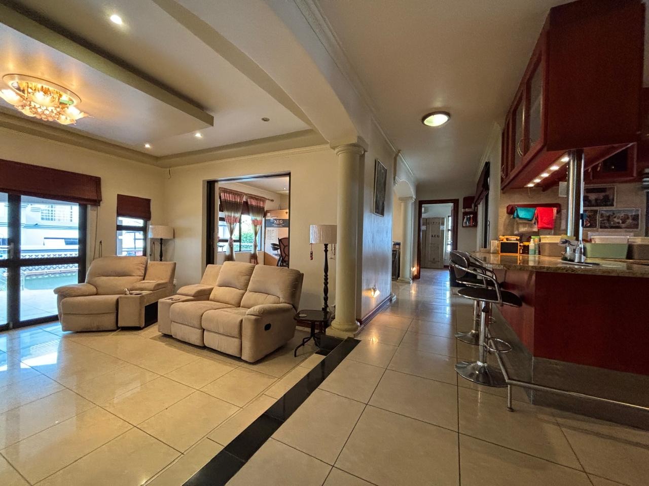 Discover this expansive 4-bedroom, 4.5-bathroom residence spanning 486 sqm in Savannah Hills Estate, Midrand. It features three lounges, a dining room, and a family TV room, all with tiled flooring and natural light. The spacious kitchen offers extensive cabinetry, granite-style countertops, a breakfast bar, and a pantry. A dedicated study is also present. Outdoors, a large tiled patio, private garden, and swimming pool await. This pet-friendly property includes a triple garage and ensures peace of mind with 24-hour security and access gates within the estate.