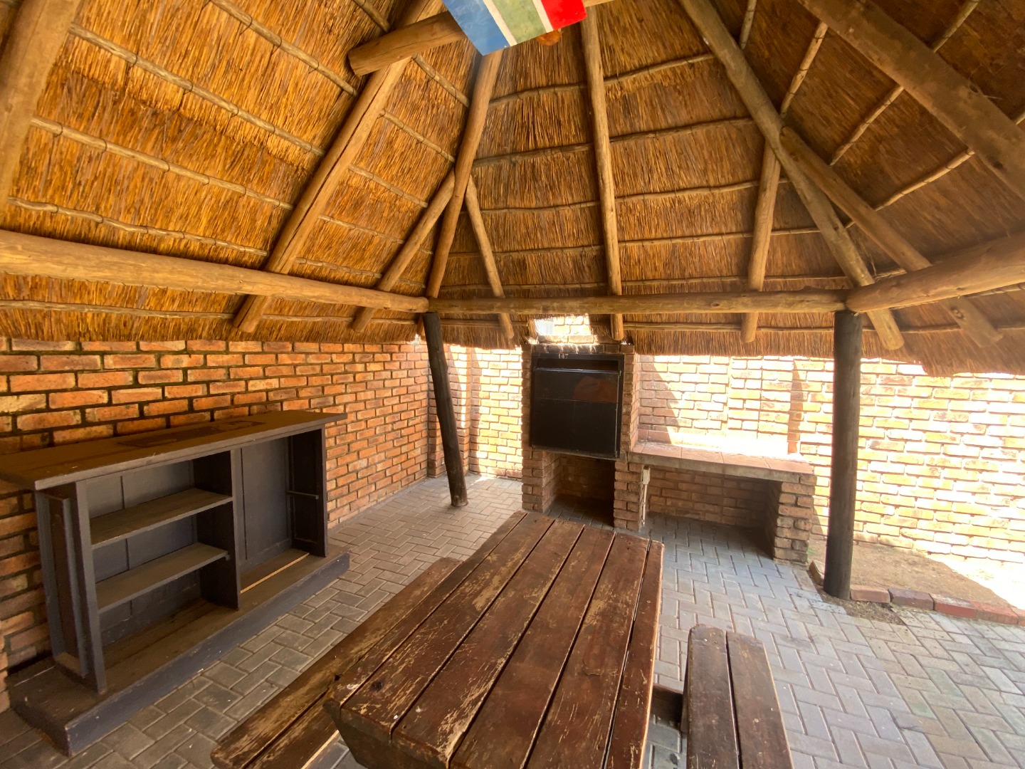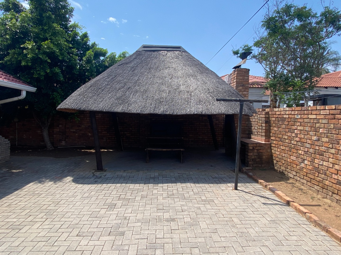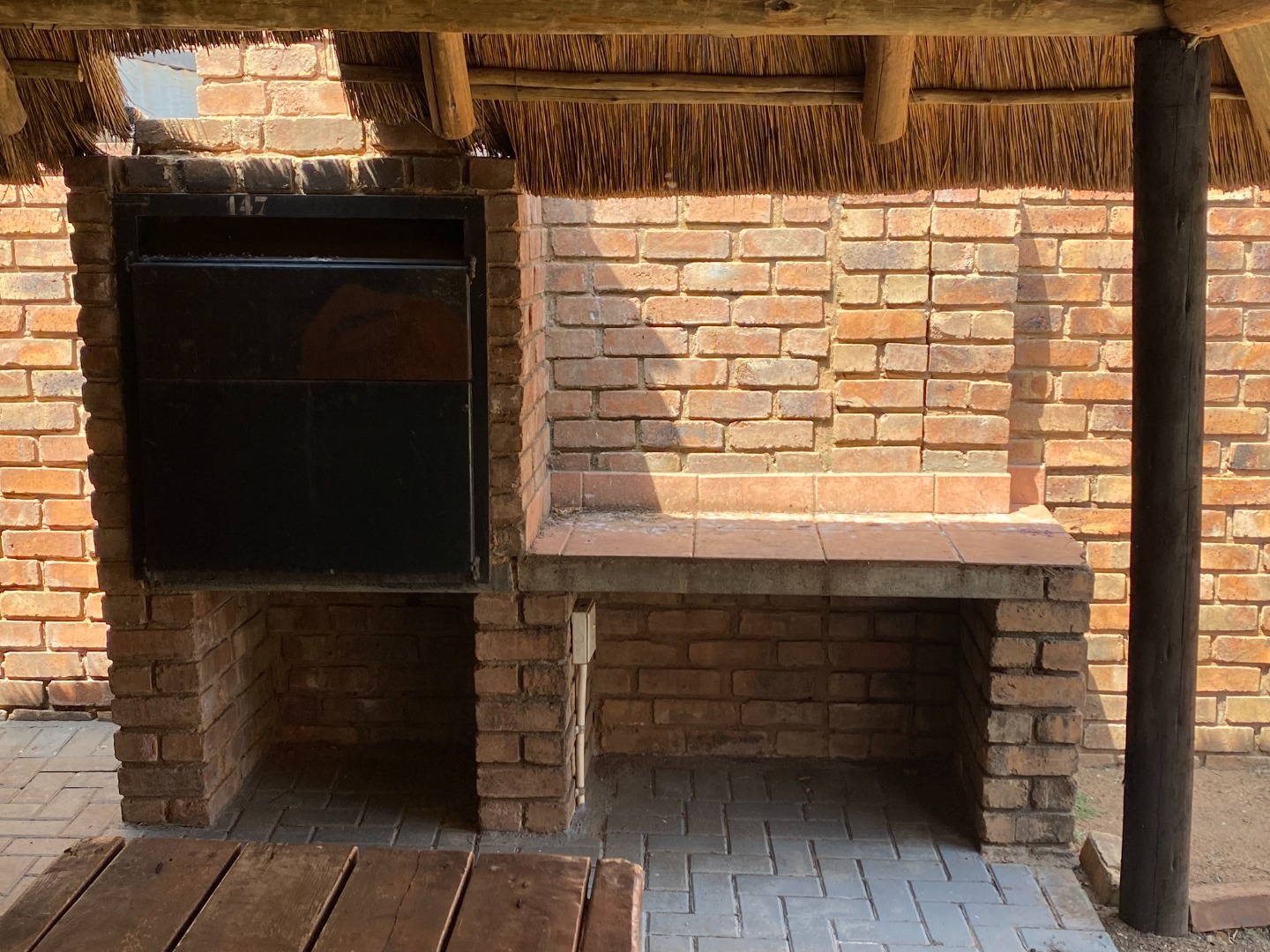 The backdoor opens to the back garden to a thatched lapa with built-in braai. The floor of the lapa is paved.