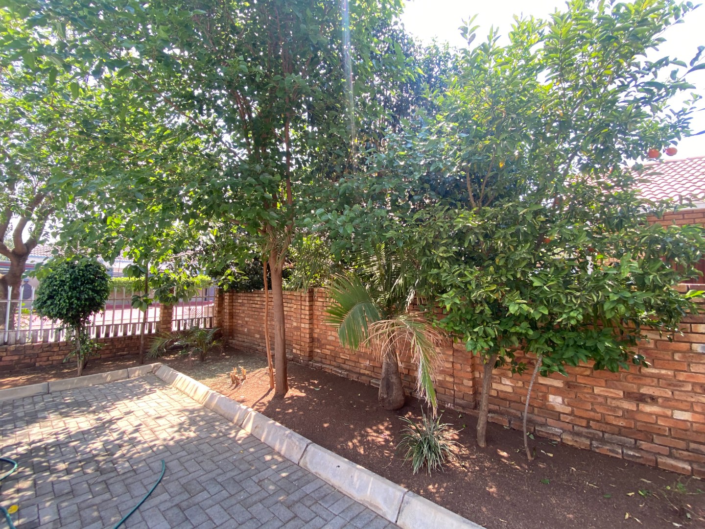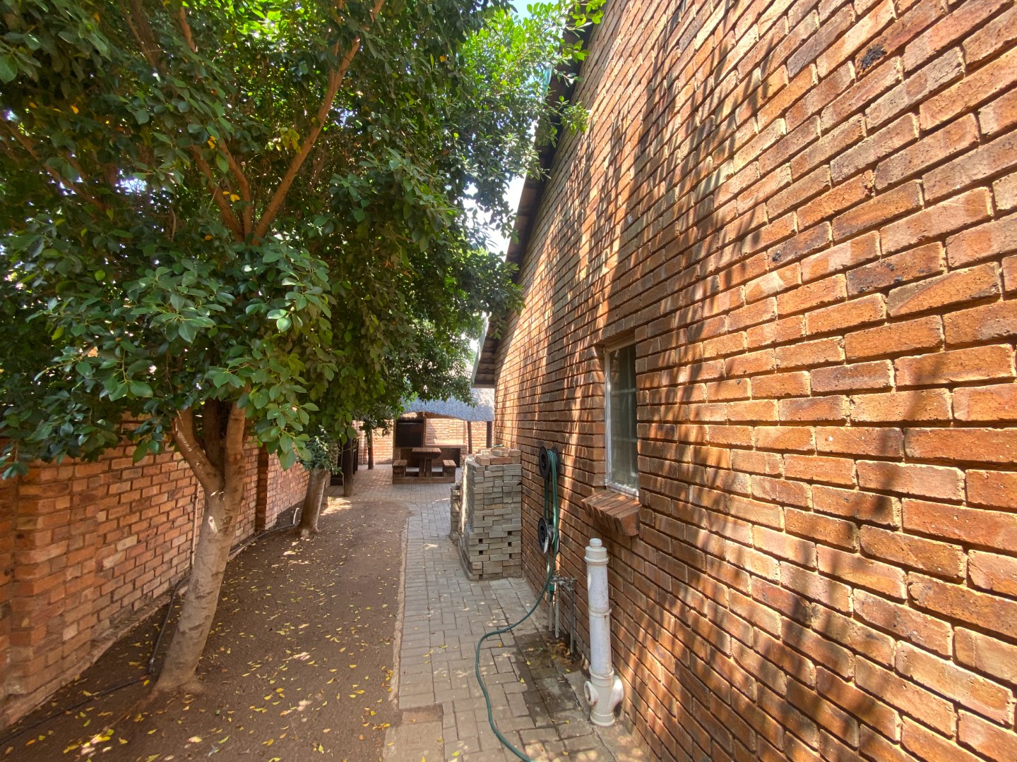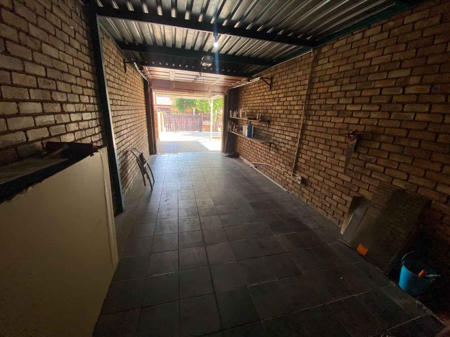 The backdoor opens to the back garden to a thatched lapa with built-in braai. The floor of the lapa is paved.