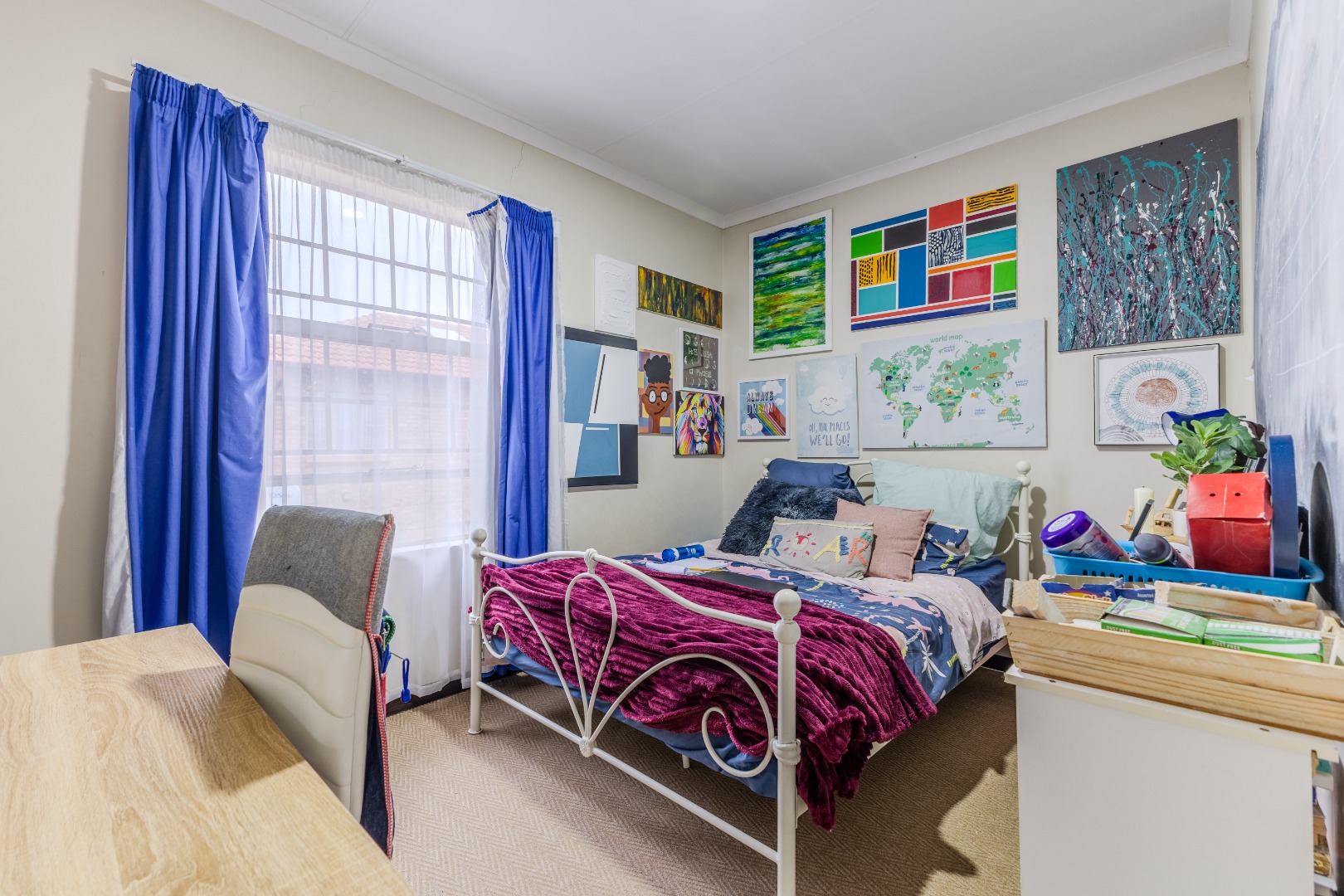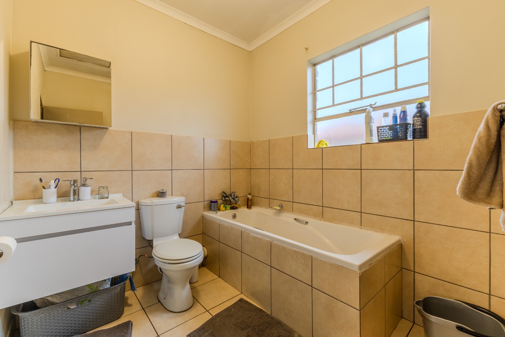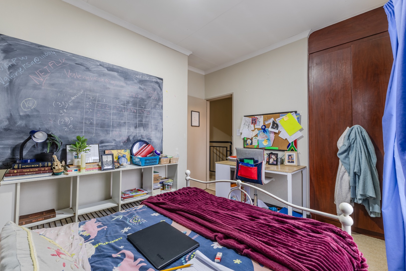Upstairs, three well-proportioned bedrooms provide comfortable private retreats. The main bedroom benefits from an en-suite bathroom, while a second bathroom serves the additional bedrooms. All bedrooms are carpeted for added warmth and comfort, featuring ample natural light from windows, some of which are fitted with security bars for enhanced safety. Built-in wardrobes offer practical storage solutions.