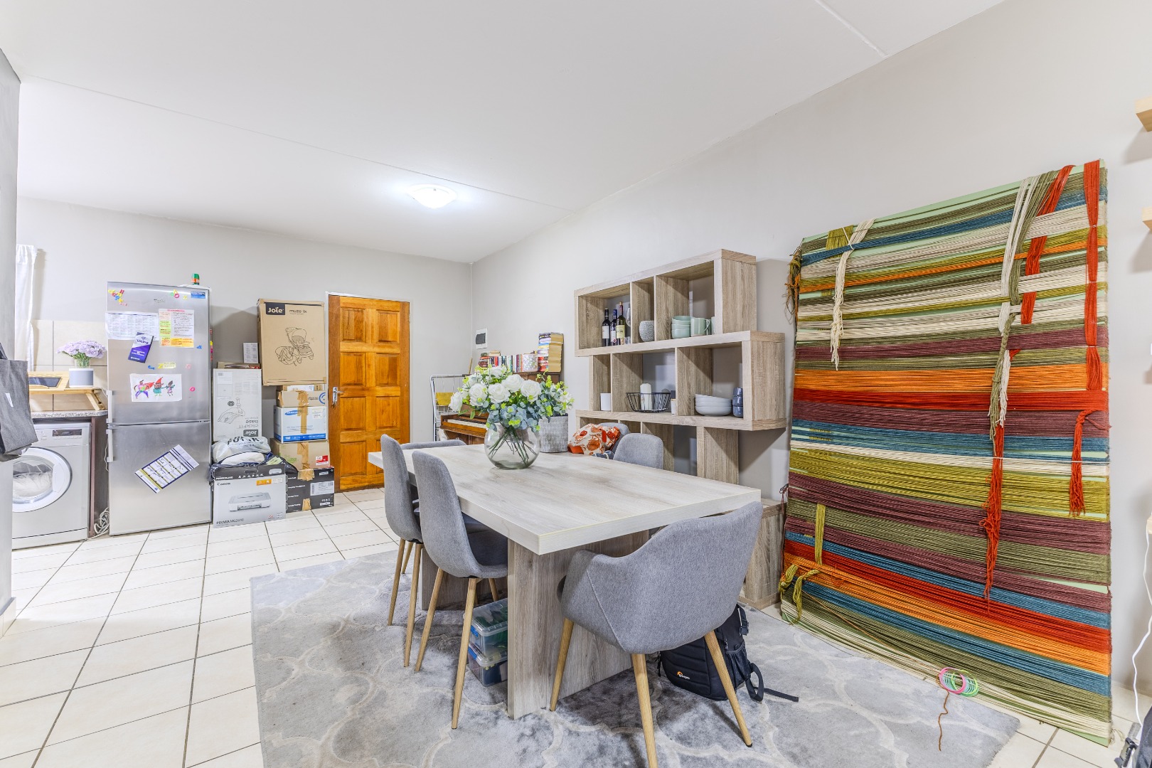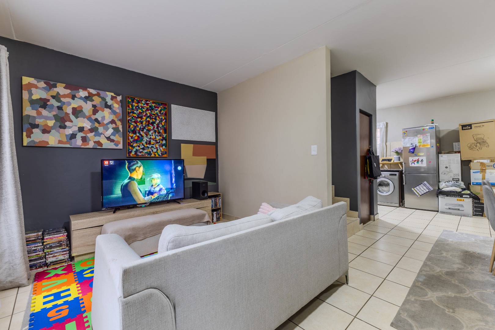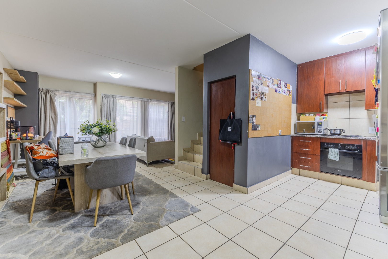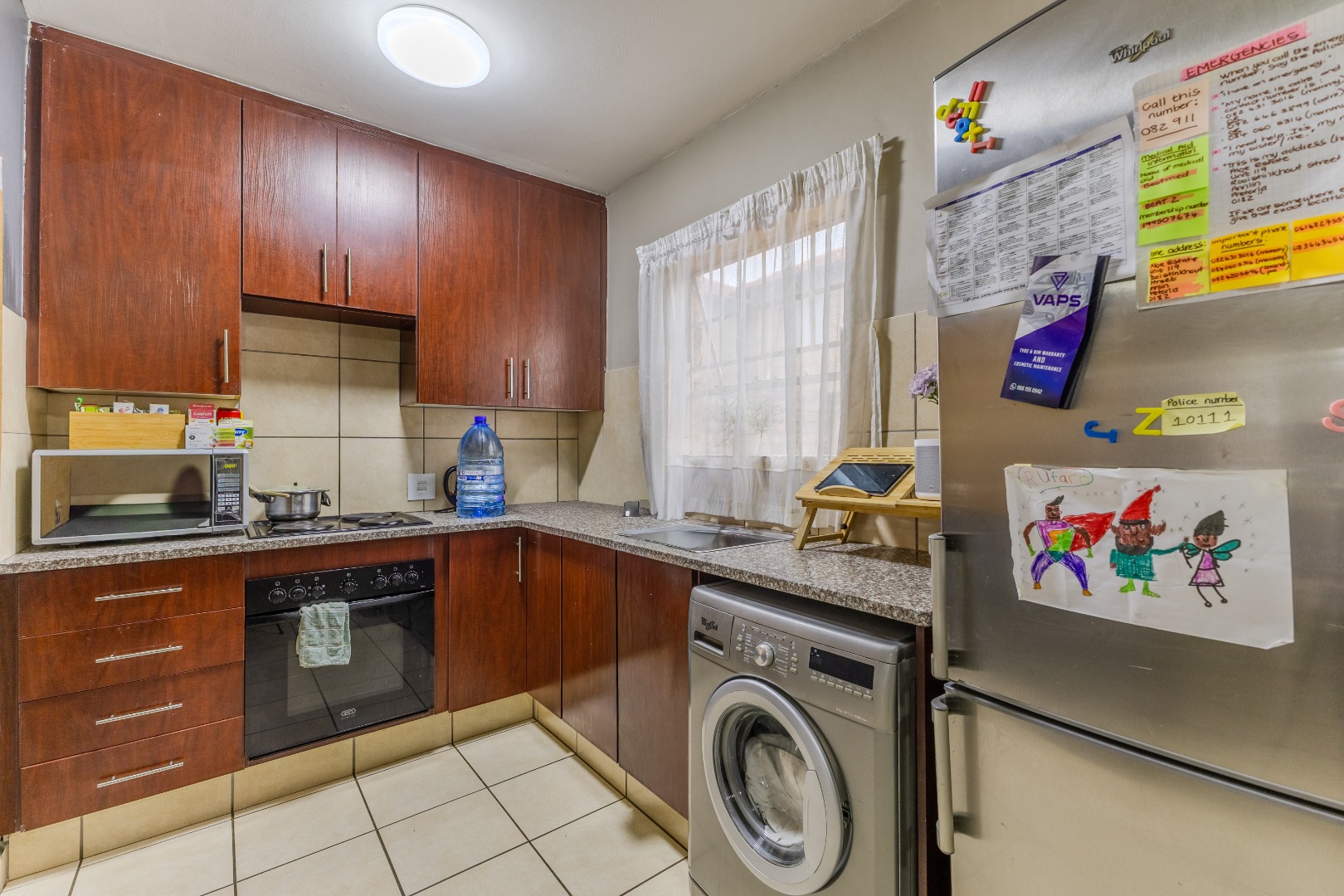 The interior features an open-plan layout that seamlessly connects the living, dining, and kitchen areas, fostering a sense of spaciousness and flow. The functional U-shaped kitchen is equipped with dark wood cabinetry, granite-look countertops, an integrated oven and hob, and designated spaces for a washing machine, microwave, and large fridge. Tiled flooring throughout the main living areas ensures easy maintenance and a clean aesthetic.