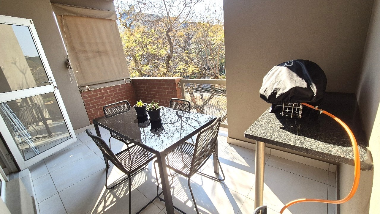 Open-plan living and bedroom area leading onto a spacious balcony with granite tops