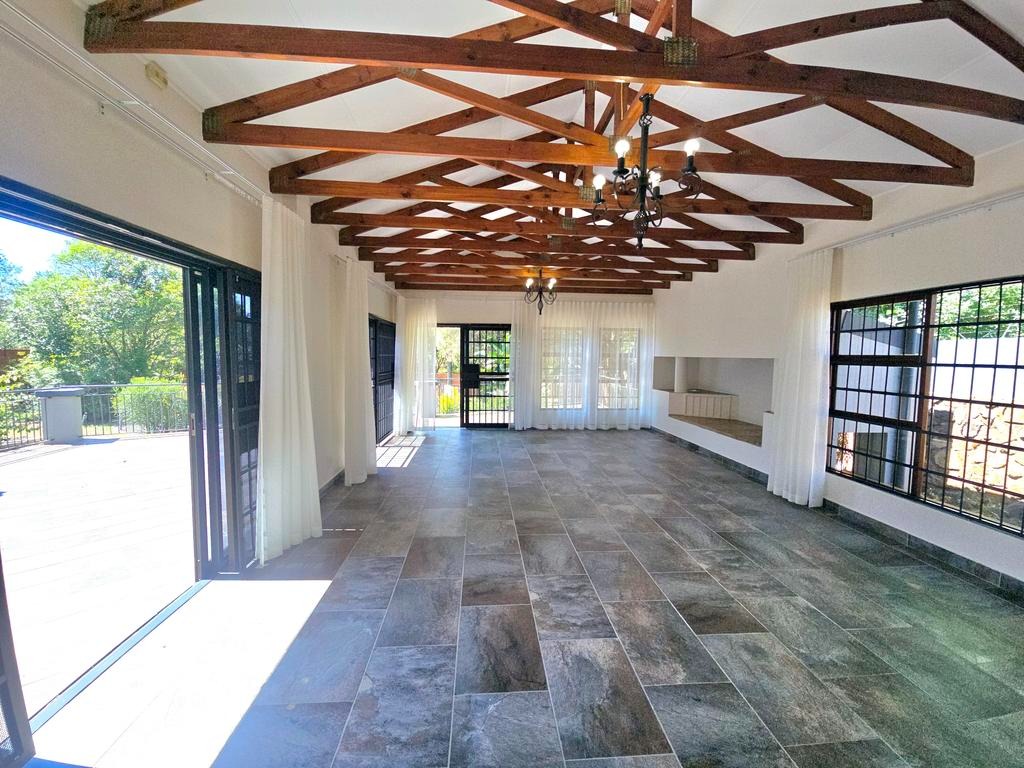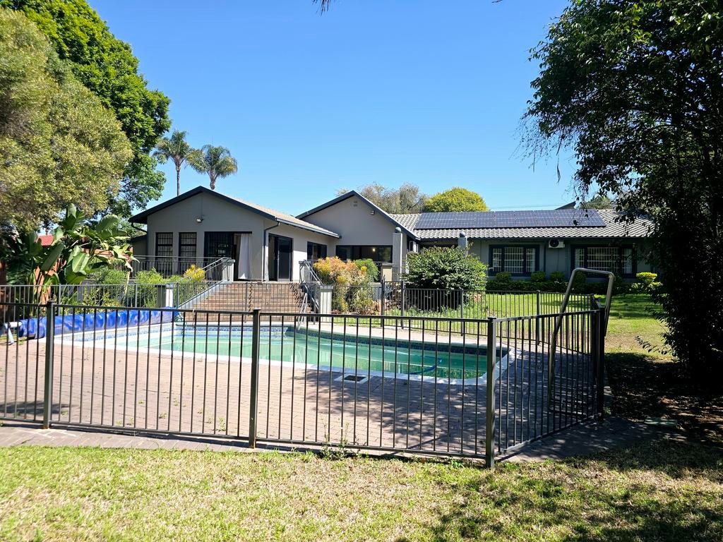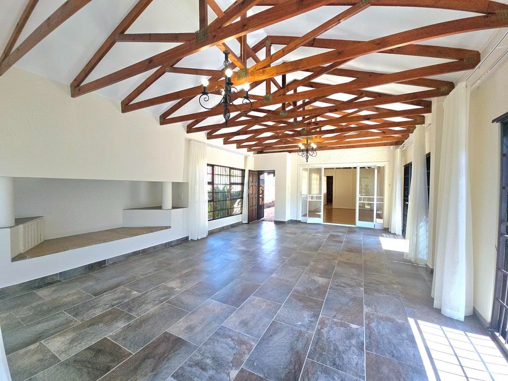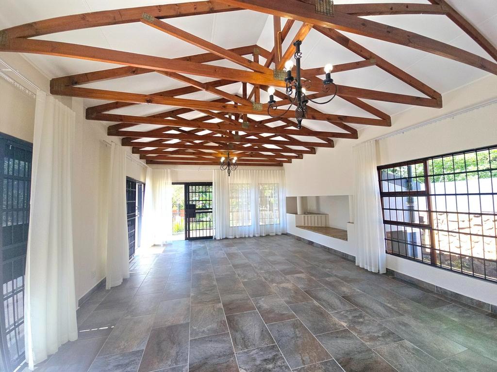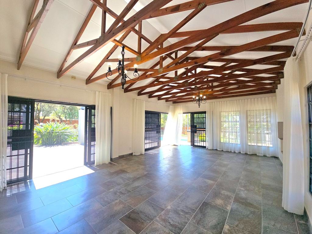 This expansive 4-bedroom, 4-bathroom residence, with three en-suite, offers generous living in the desirable suburban area of Ashlea Gardens, Pretoria. Spanning a substantial 384 sqm under roof on a 1980 sqm erf, this home is designed for comfort and functionality. The interior boasts two spacious lounges and a distinct dining area, providing ample room for both relaxation and entertaining. A large entertainment area opening to a large patio overlooking the pool. High vaulted ceilings with exposed wooden beams creates an inviting atmosphere, complemented by abundant natural light from large windows and sliding doors. Air conditioning ensures year-round comfort.