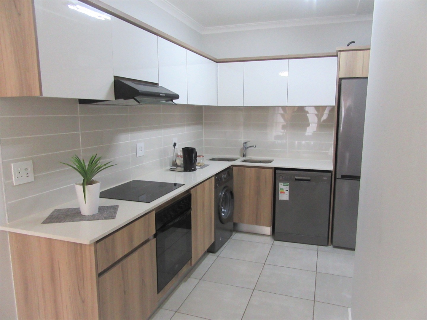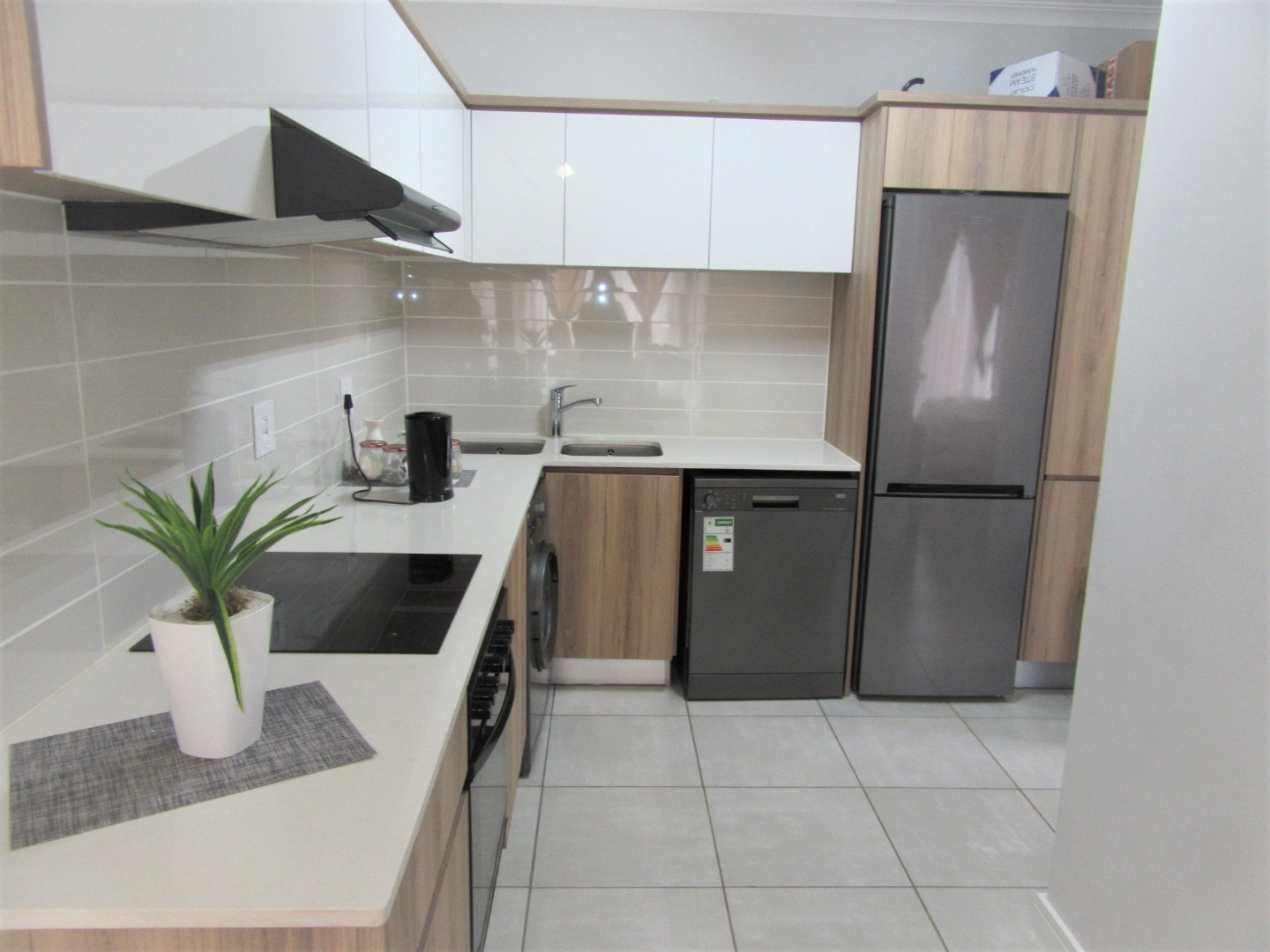 Modern open-plan kitchen with high-end appliances: fridge, washing machine, and dishwasher