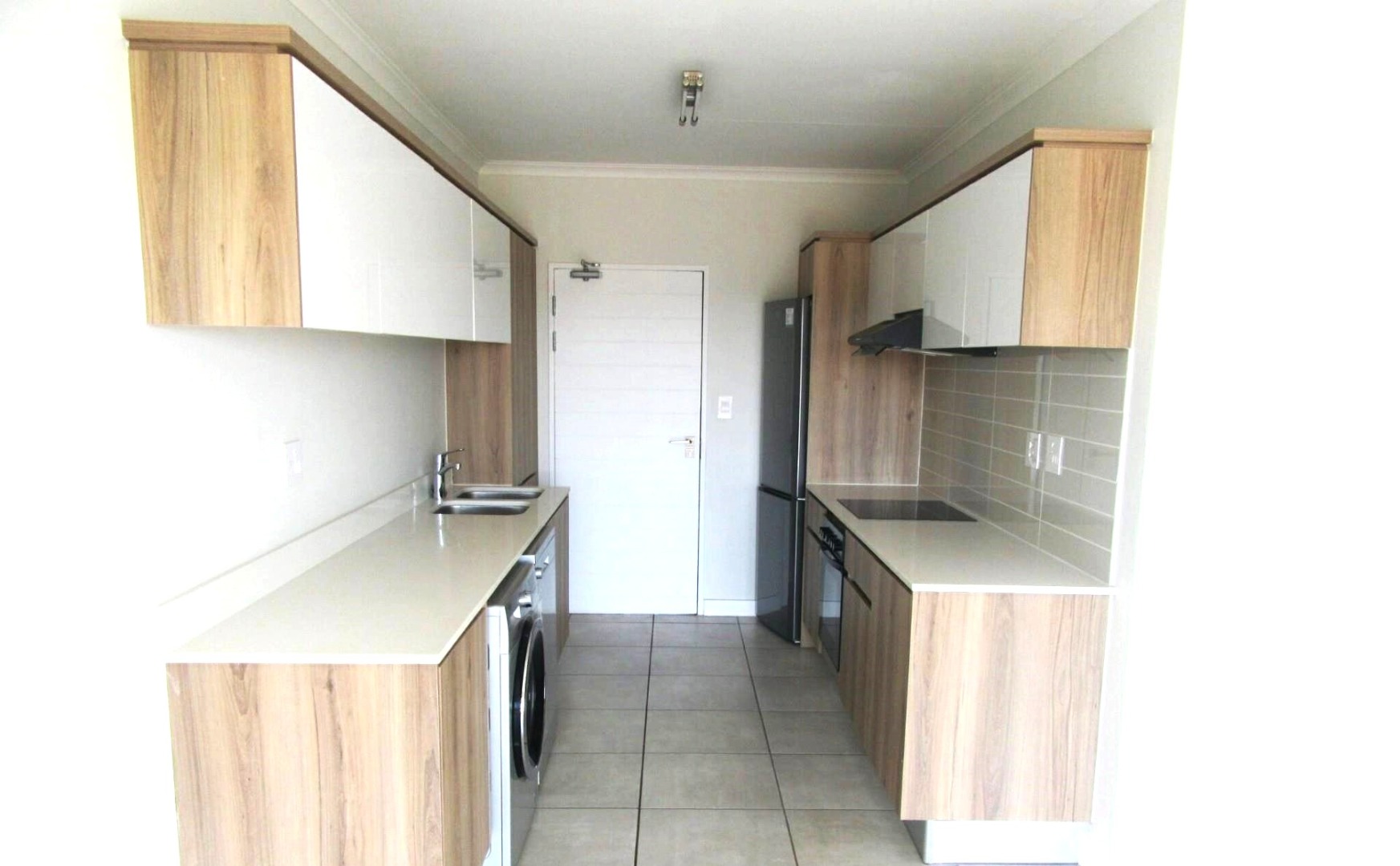 Modern open-plan kitchen with high-end appliances: fridge, washing machine, and dishwasher