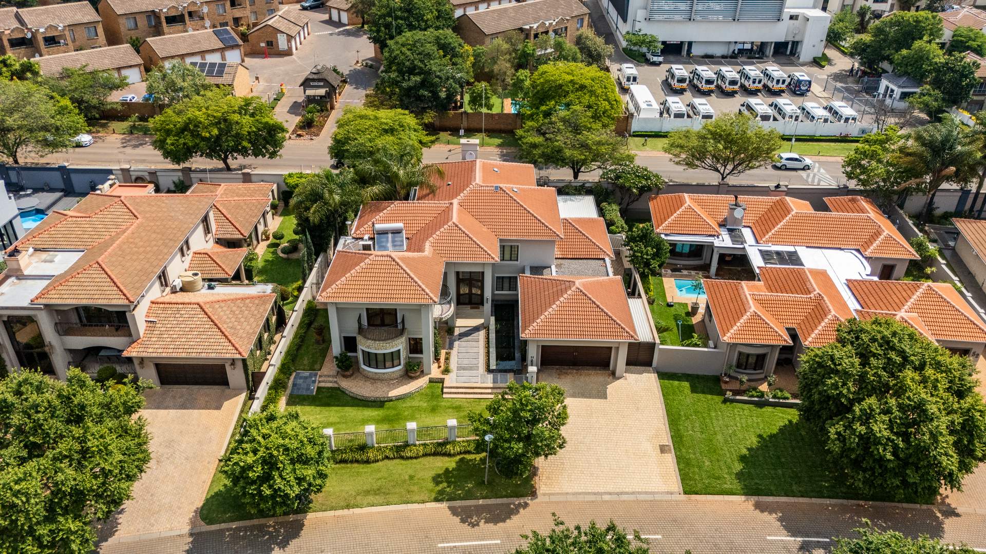 Nestled within the prestigious Boardwalk Manor Estate in Pretoria East, this elegant family home offers the perfect blend of luxury, comfort, and practicality. The residence features four spacious, air-conditioned bedrooms on the upper level — including a main bedroom with a full en-suite bathroom, ample cupboard space, and a built-in safe. In addition to two en-suite bathrooms, there is a shared family bathroom and a guest cloakroom downstairs for convenience. Designed for both relaxation and entertaining, the home boasts a formal lounge and dining room, both enhanced by inviting fireplaces, flowing effortlessly into an indoor braai area that overlooks the sparkling swimming pool and a covered deck with a gas braai — perfect for year-round gatherings. Upstairs, a cozy pajama lounge with a fireplace offers a comfortable family retreat, while a spacious family/TV room provides the ideal setting for informal living. The modern kitchen features quality finishes, ample storage, and a separate scullery, while additional spaces such as a converted gym room, private study, and servant’s quarters/workshop with its own bathroom add versatility and convenience. Practical features include a double garage, three additional parking bays, and a covered carport ideal for a caravan or extra storage. With three JoJo tanks, an inverter, generator, and prepaid electricity, this home ensures uninterrupted comfort and peace of mind. Set within a secure, sought-after estate with beautifully maintained communal spaces, this property epitomizes refined estate living in one of Pretoria’s most desirable locations.