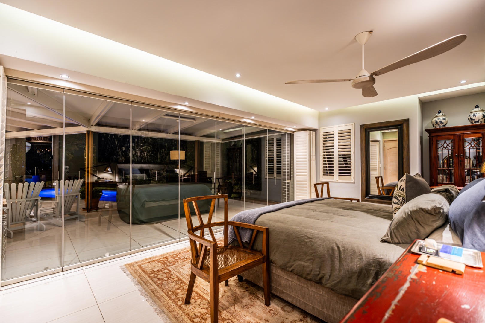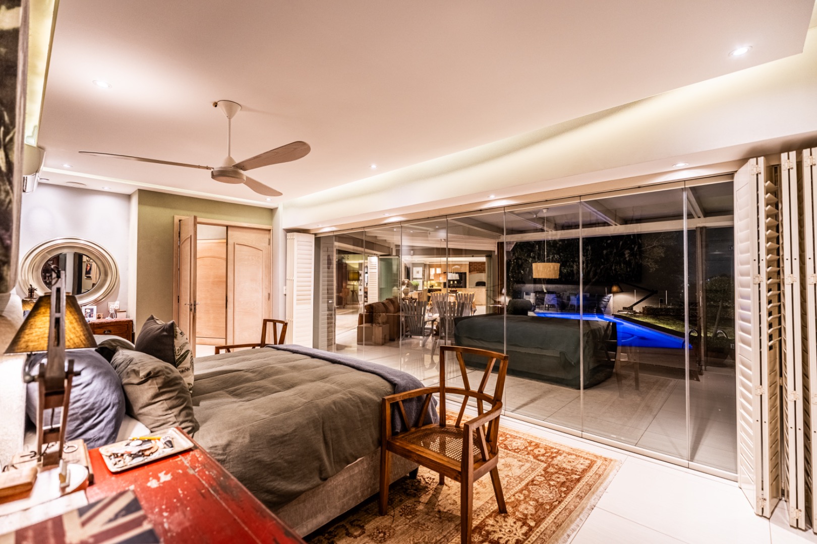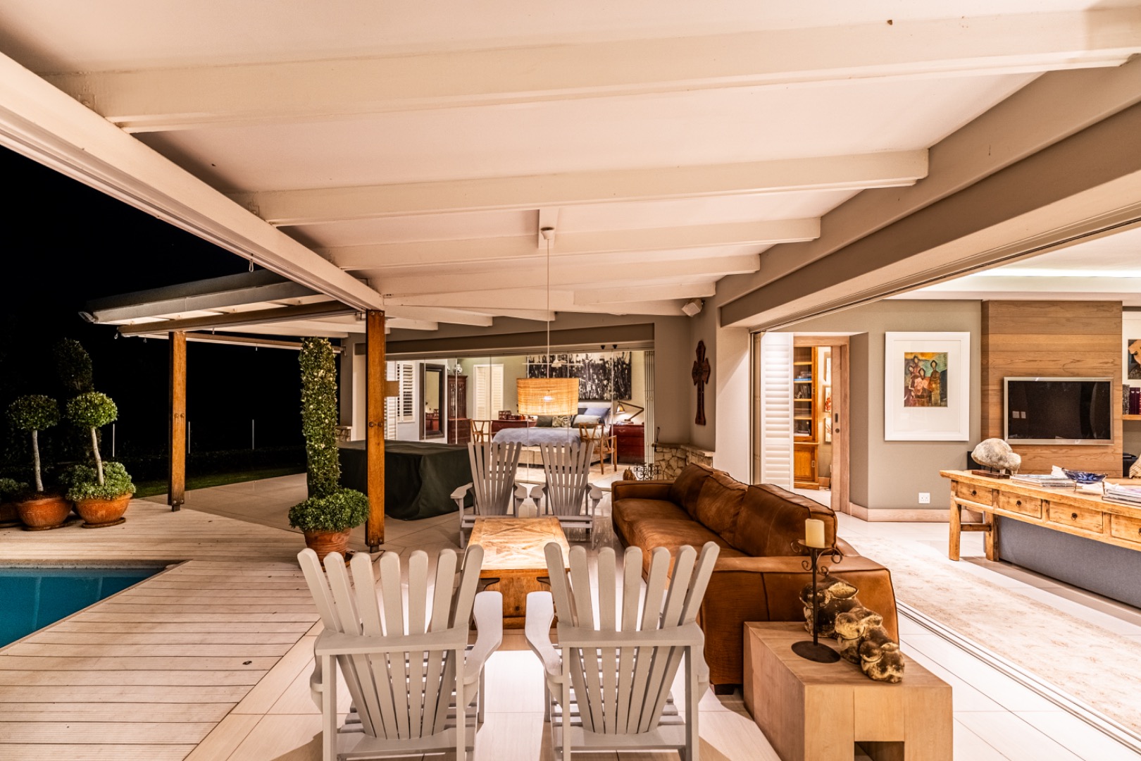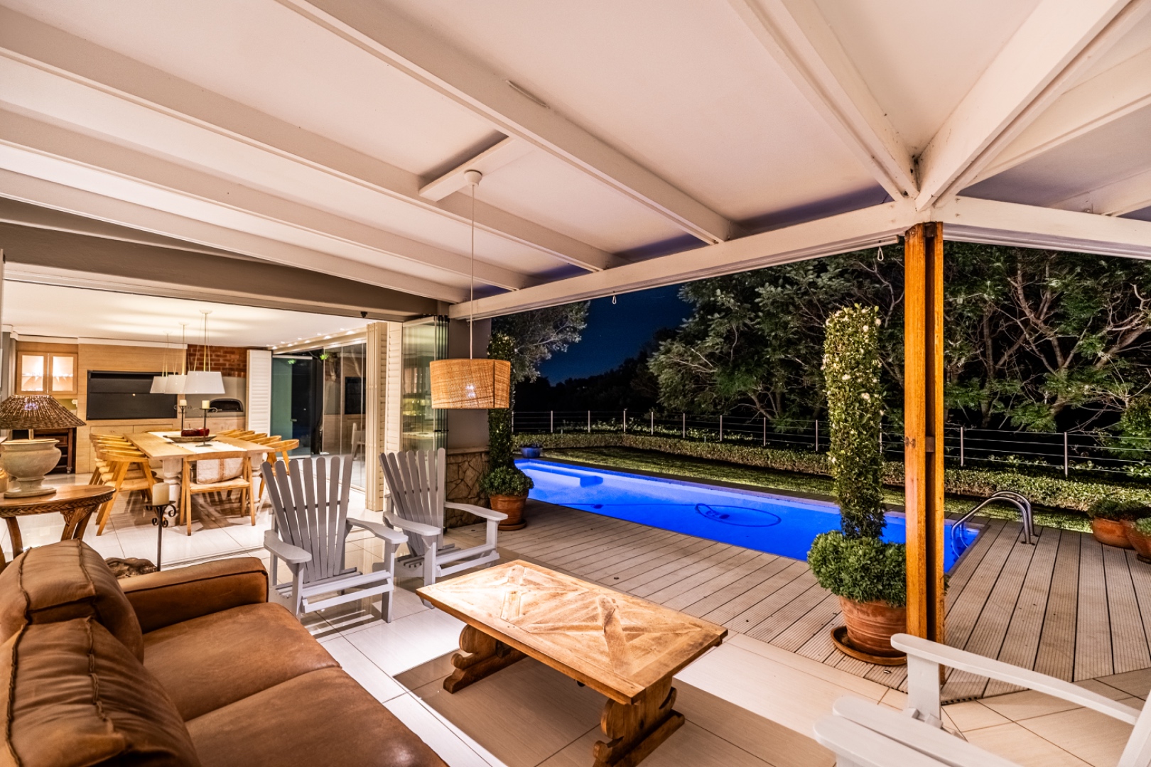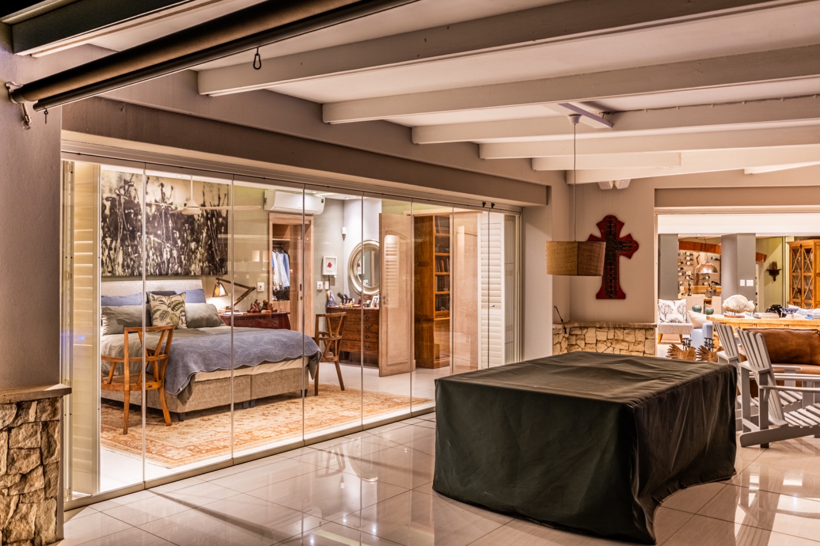 Large sliding doors lead to an expansive covered patio designed for year-round enjoyment. The patio features a built-in braai and pizza oven and is enclosed with glass stacking doors that open to a beautifully landscaped garden and sparkling swimming pool. An adjoining boma area provides the perfect setting for relaxed outdoor gatherings beneath the trees.