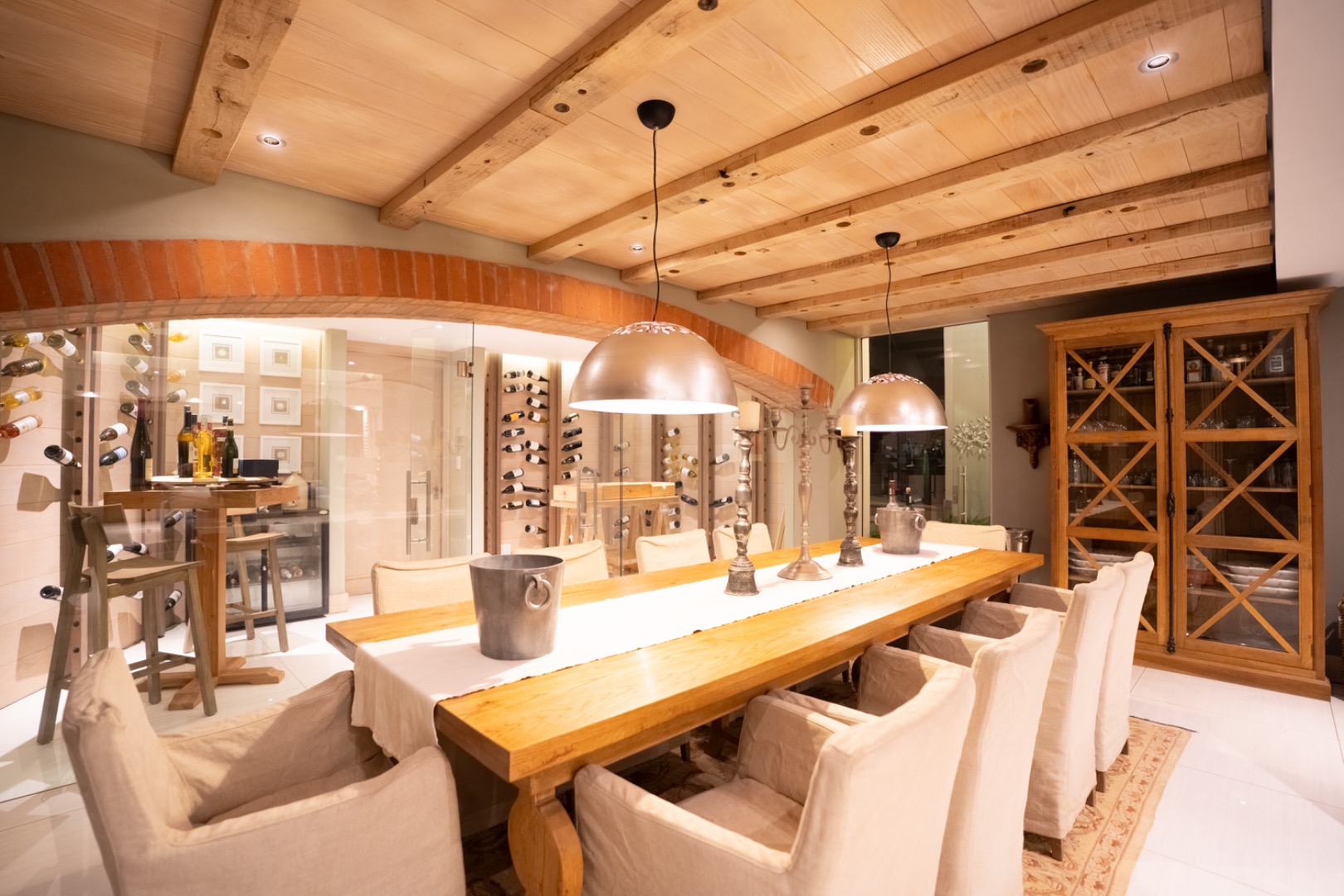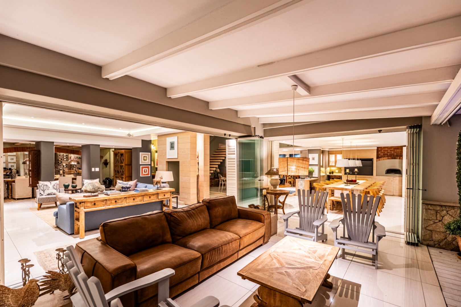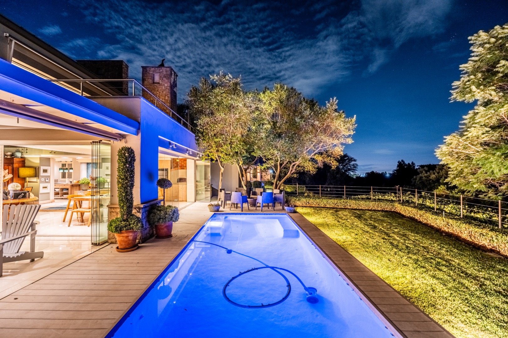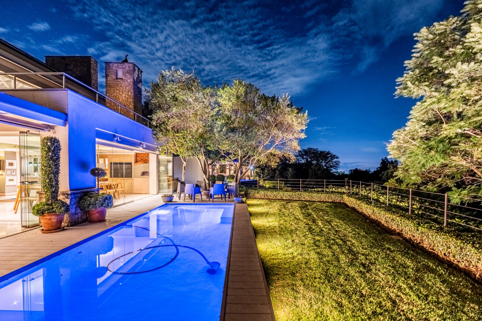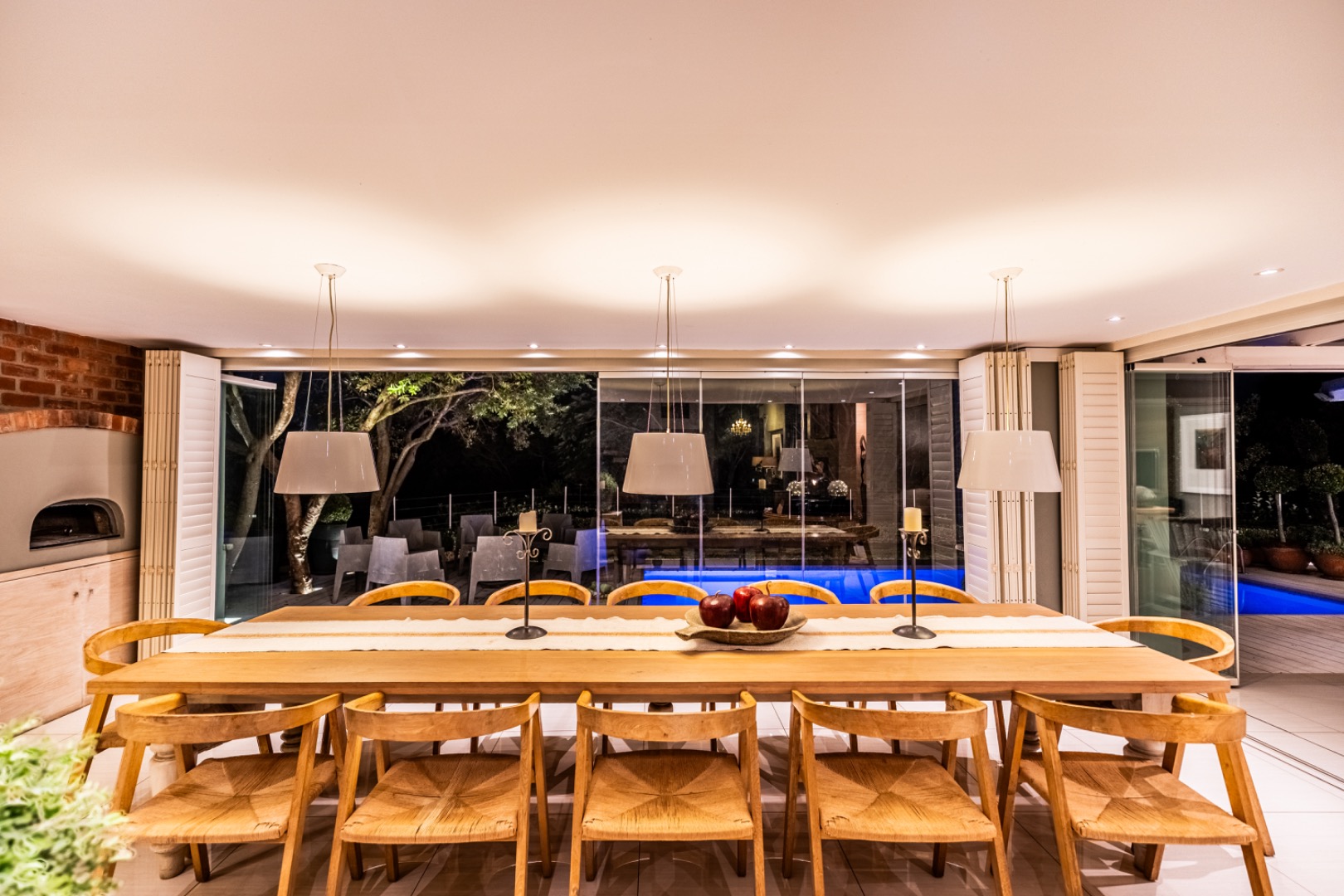 Large sliding doors lead to an expansive covered patio designed for year-round enjoyment. The patio features a built-in braai and pizza oven and is enclosed with glass stacking doors that open to a beautifully landscaped garden and sparkling swimming pool. An adjoining boma area provides the perfect setting for relaxed outdoor gatherings beneath the trees.