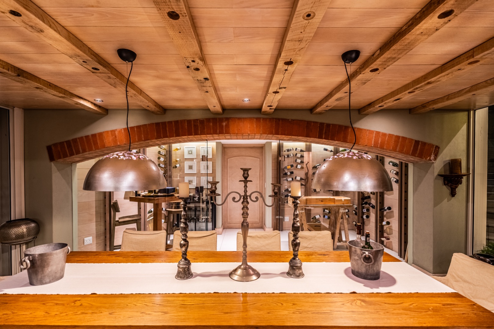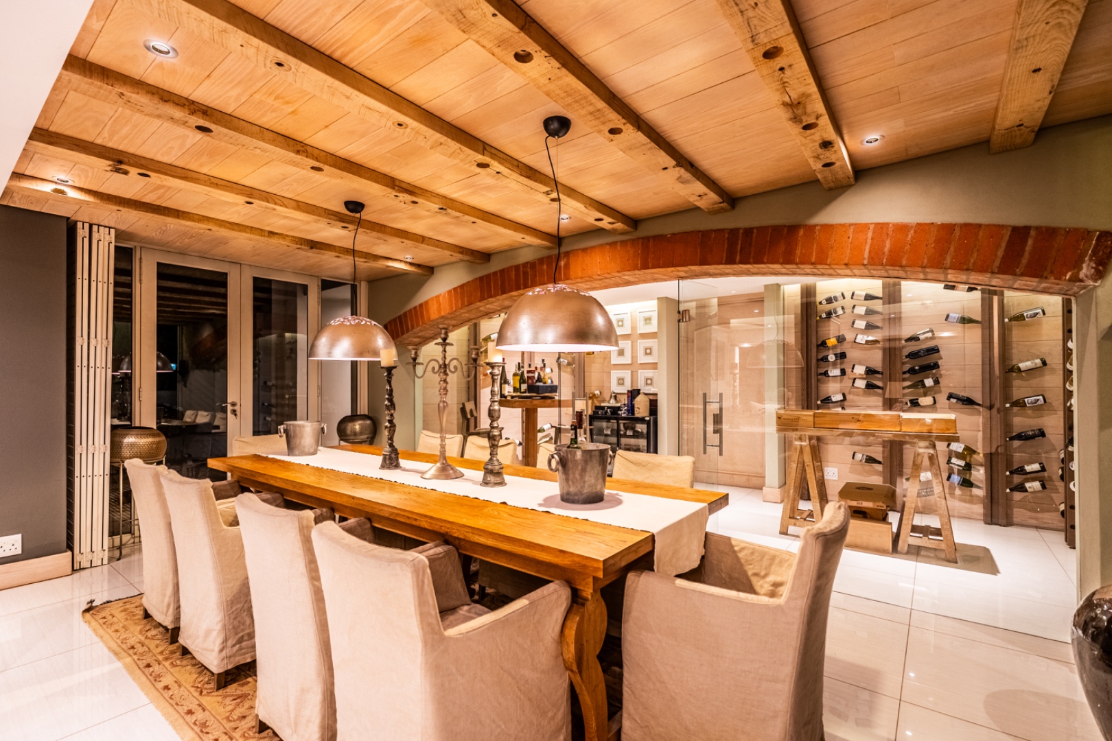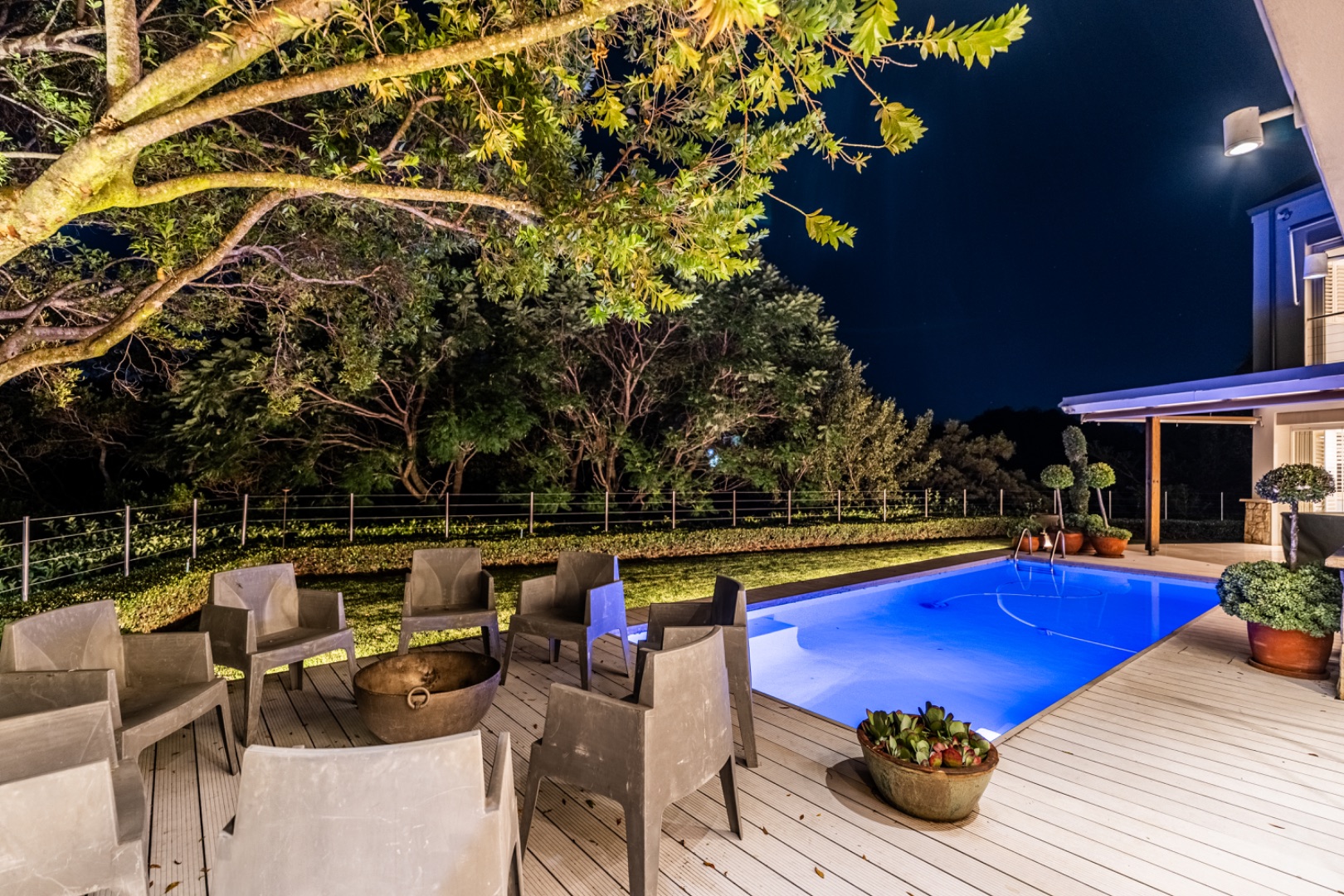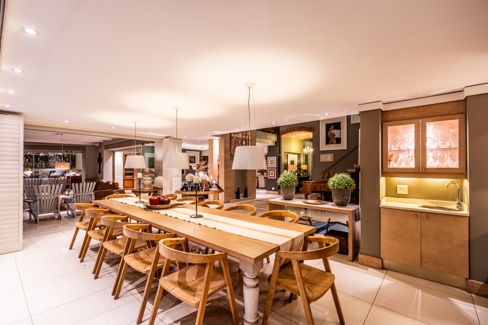 Large sliding doors lead to an expansive covered patio designed for year-round enjoyment. The patio features a built-in braai and pizza oven and is enclosed with glass stacking doors that open to a beautifully landscaped garden and sparkling swimming pool. An adjoining boma area provides the perfect setting for relaxed outdoor gatherings beneath the trees.