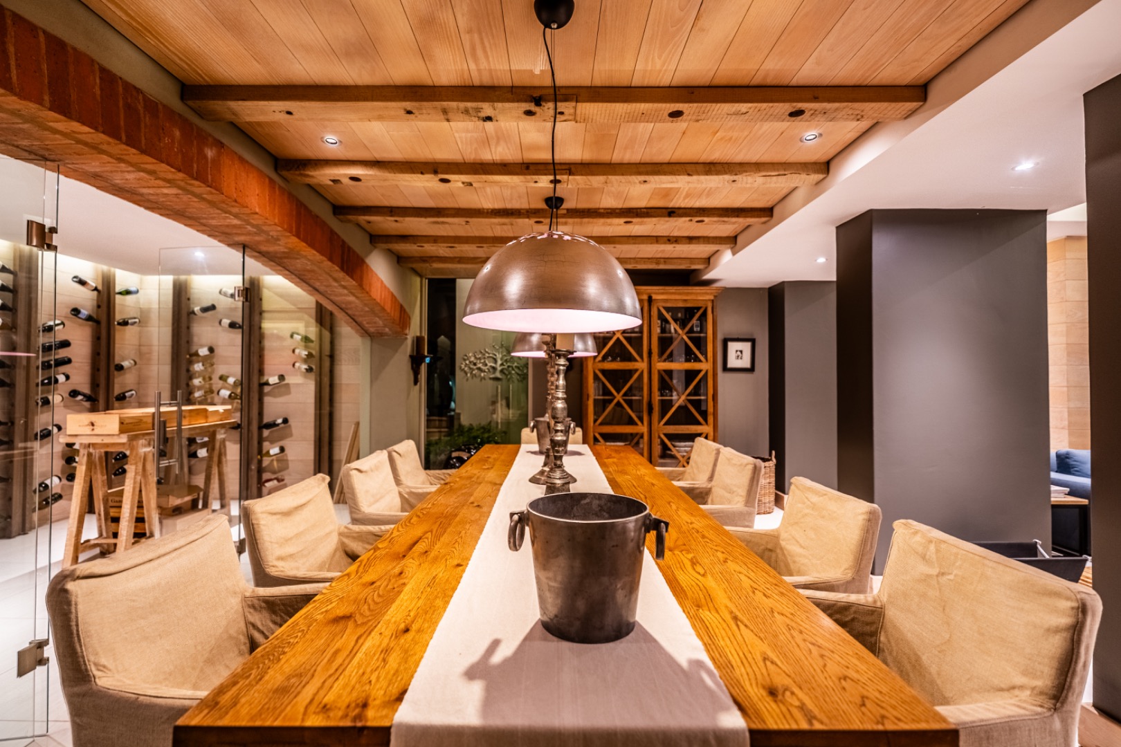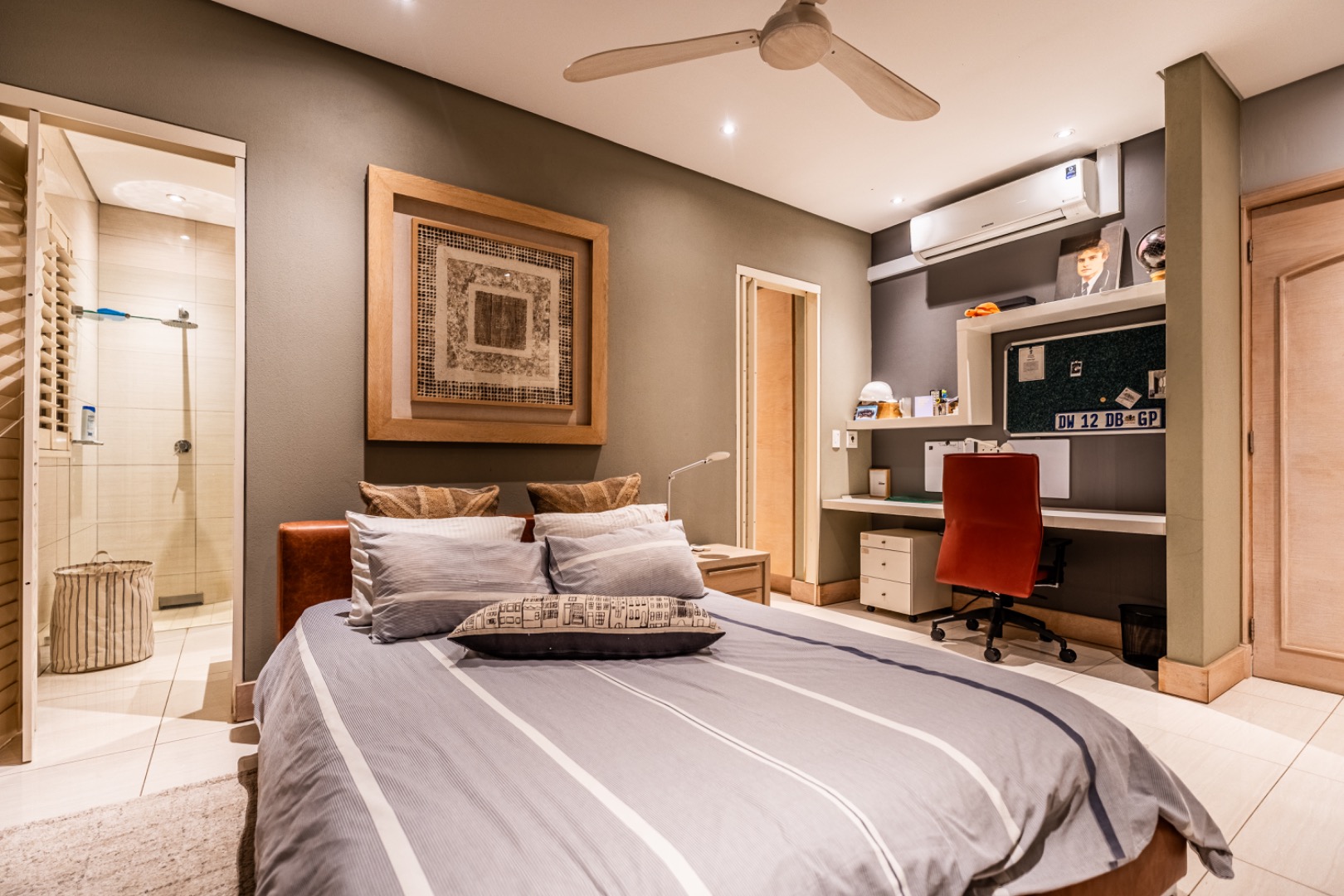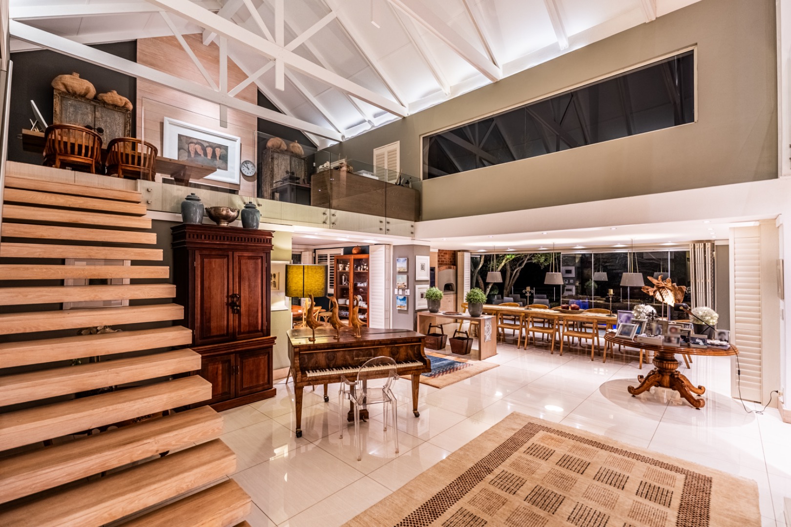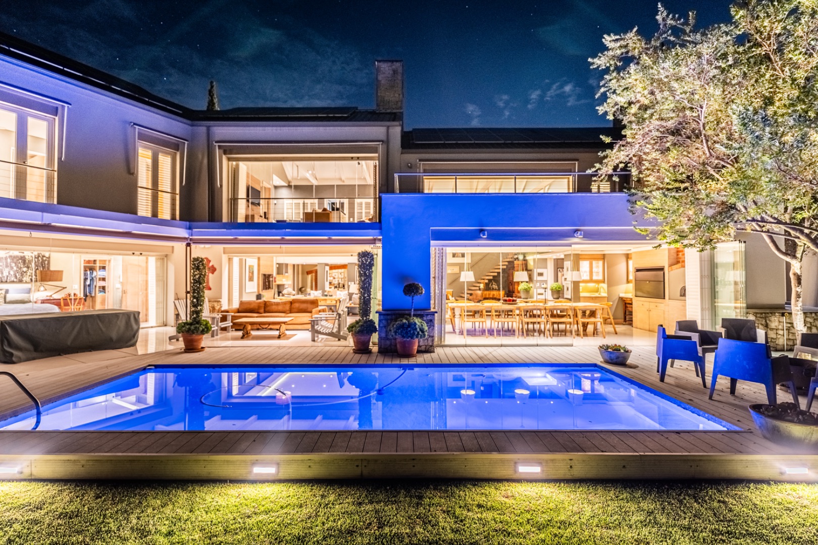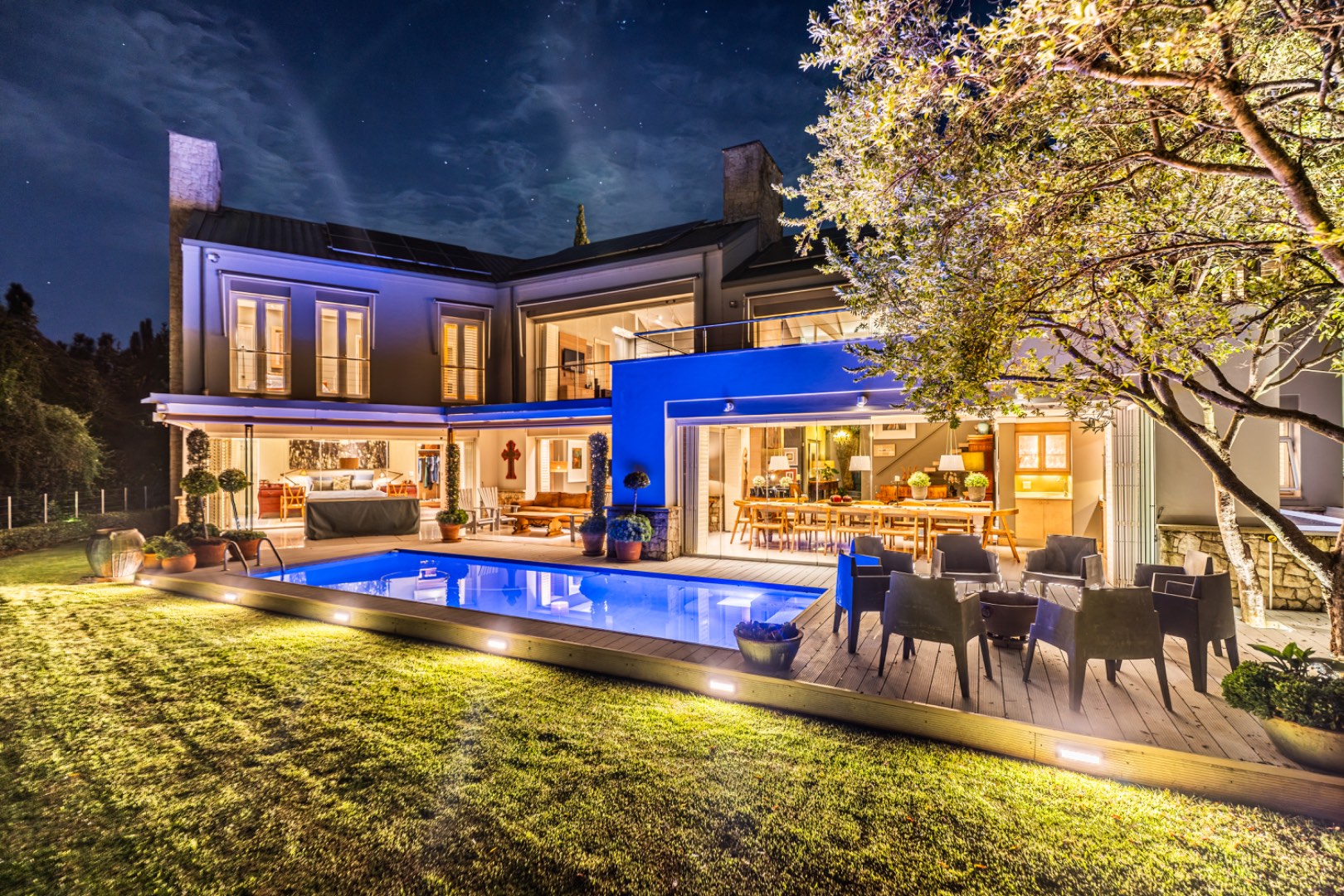 Large sliding doors lead to an expansive covered patio designed for year-round enjoyment. The patio features a built-in braai and pizza oven and is enclosed with glass stacking doors that open to a beautifully landscaped garden and sparkling swimming pool. An adjoining boma area provides the perfect setting for relaxed outdoor gatherings beneath the trees.