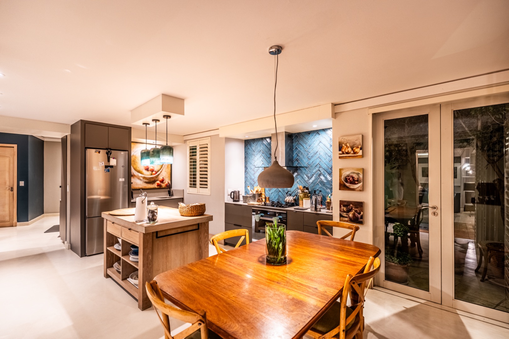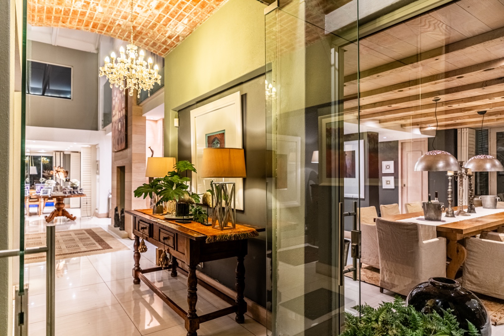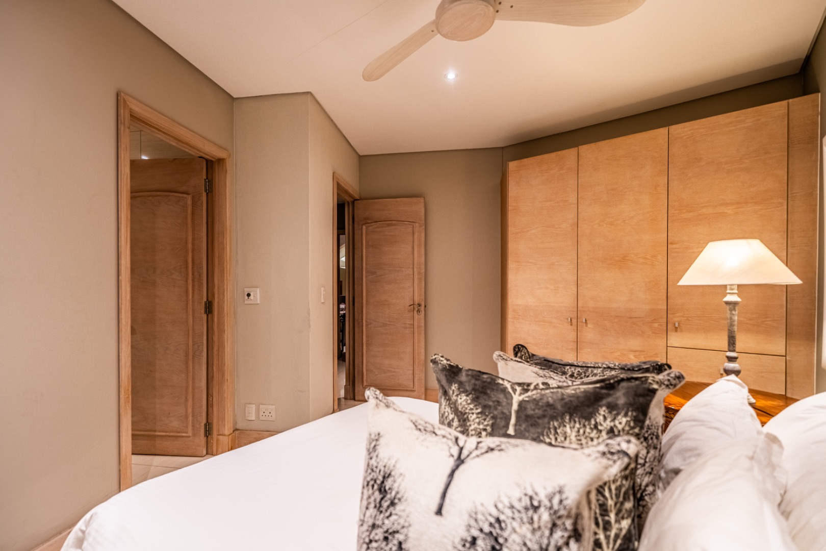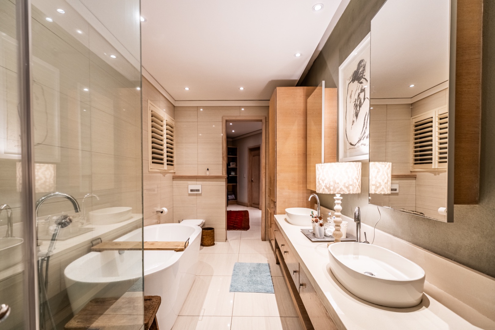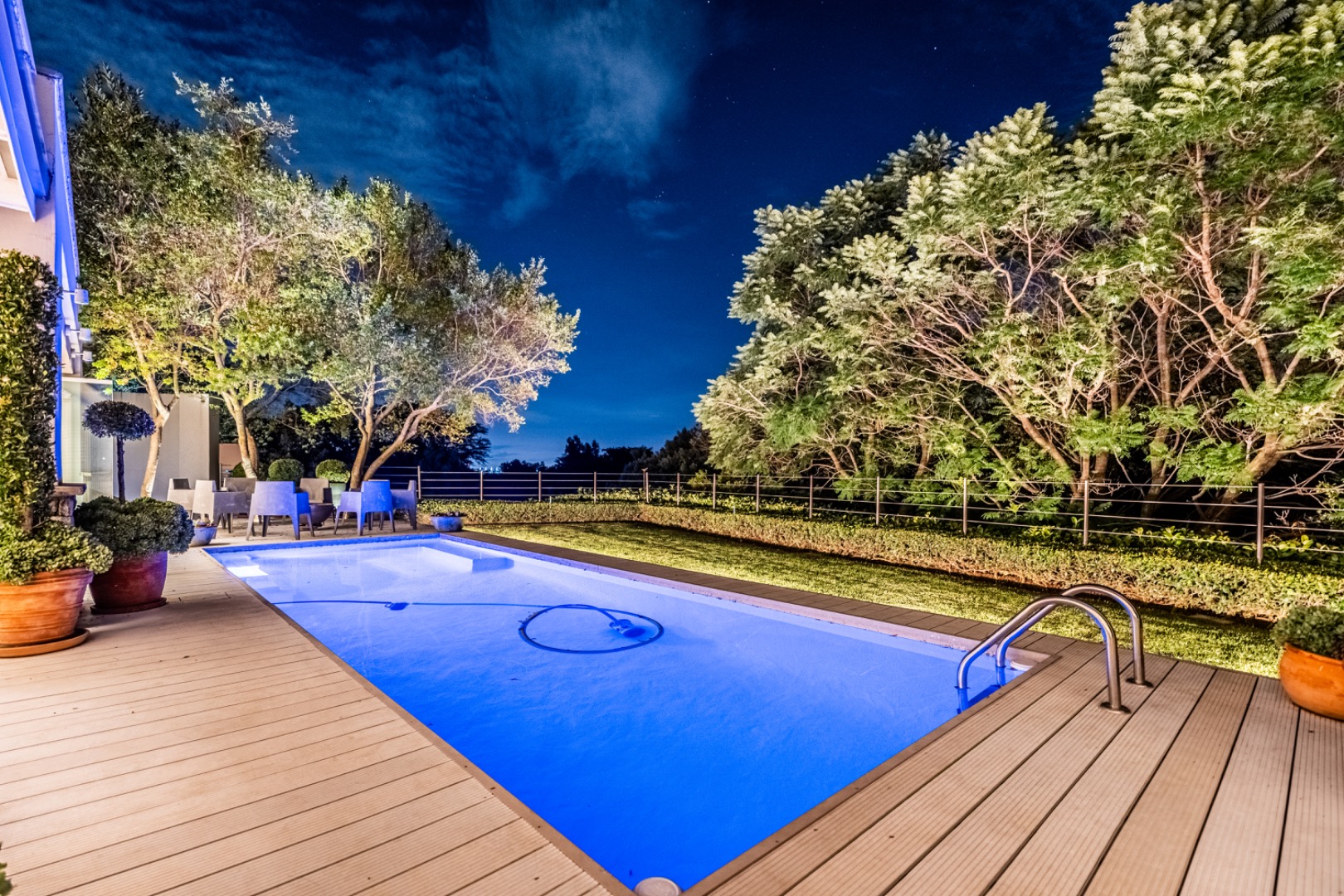 Large sliding doors lead to an expansive covered patio designed for year-round enjoyment. The patio features a built-in braai and pizza oven and is enclosed with glass stacking doors that open to a beautifully landscaped garden and sparkling swimming pool. An adjoining boma area provides the perfect setting for relaxed outdoor gatherings beneath the trees.