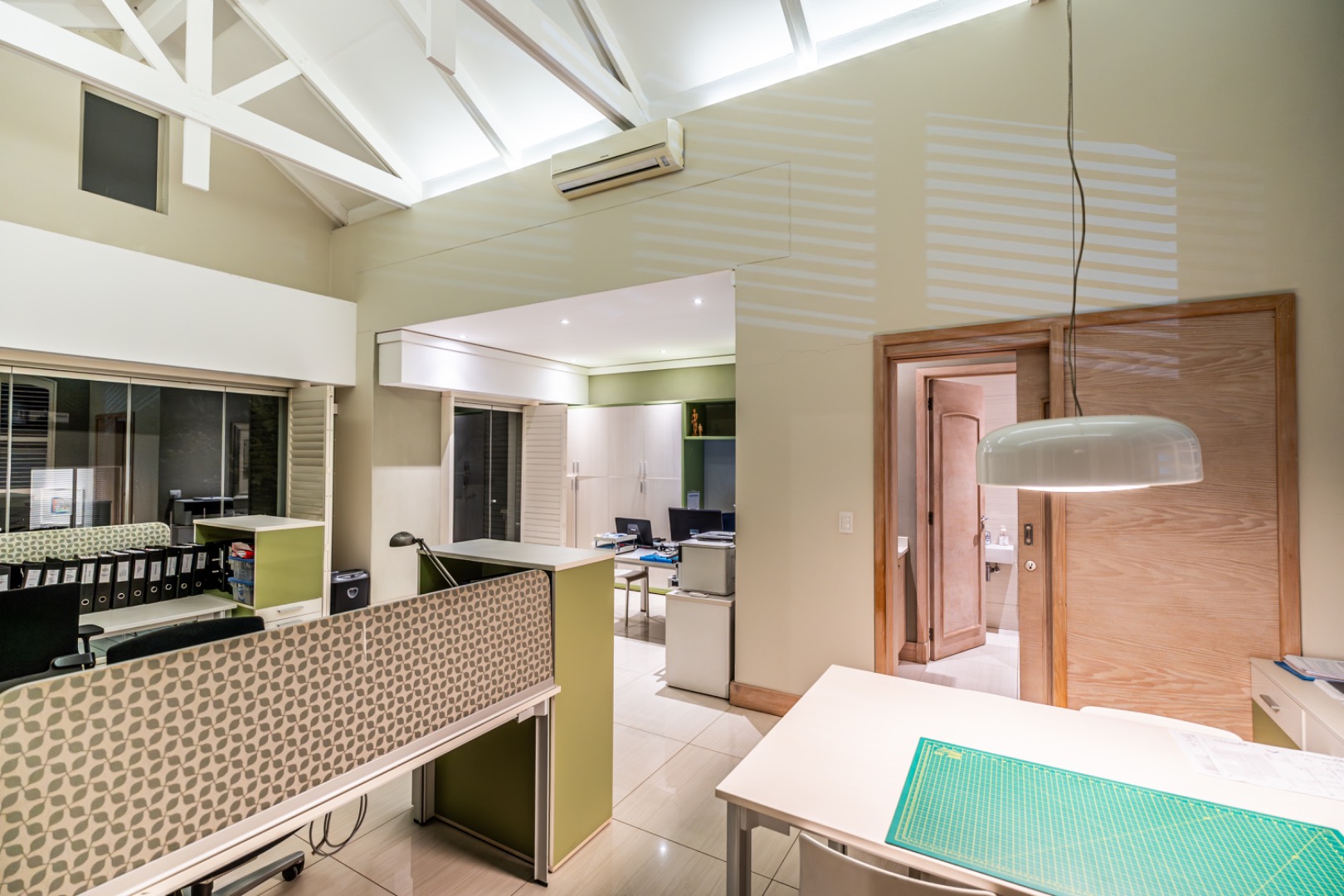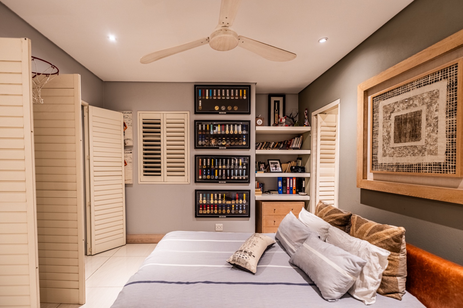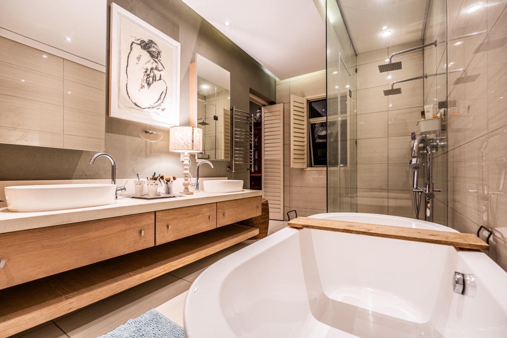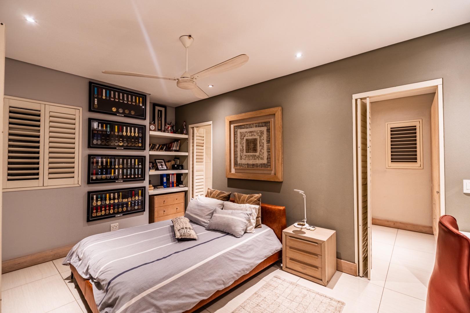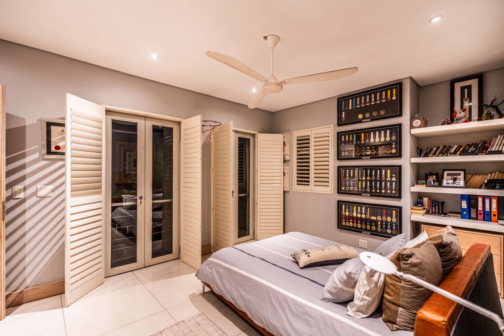 Large sliding doors lead to an expansive covered patio designed for year-round enjoyment. The patio features a built-in braai and pizza oven and is enclosed with glass stacking doors that open to a beautifully landscaped garden and sparkling swimming pool. An adjoining boma area provides the perfect setting for relaxed outdoor gatherings beneath the trees.