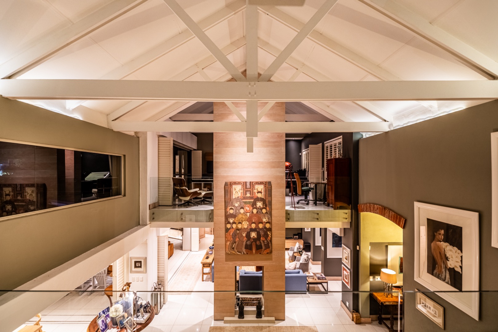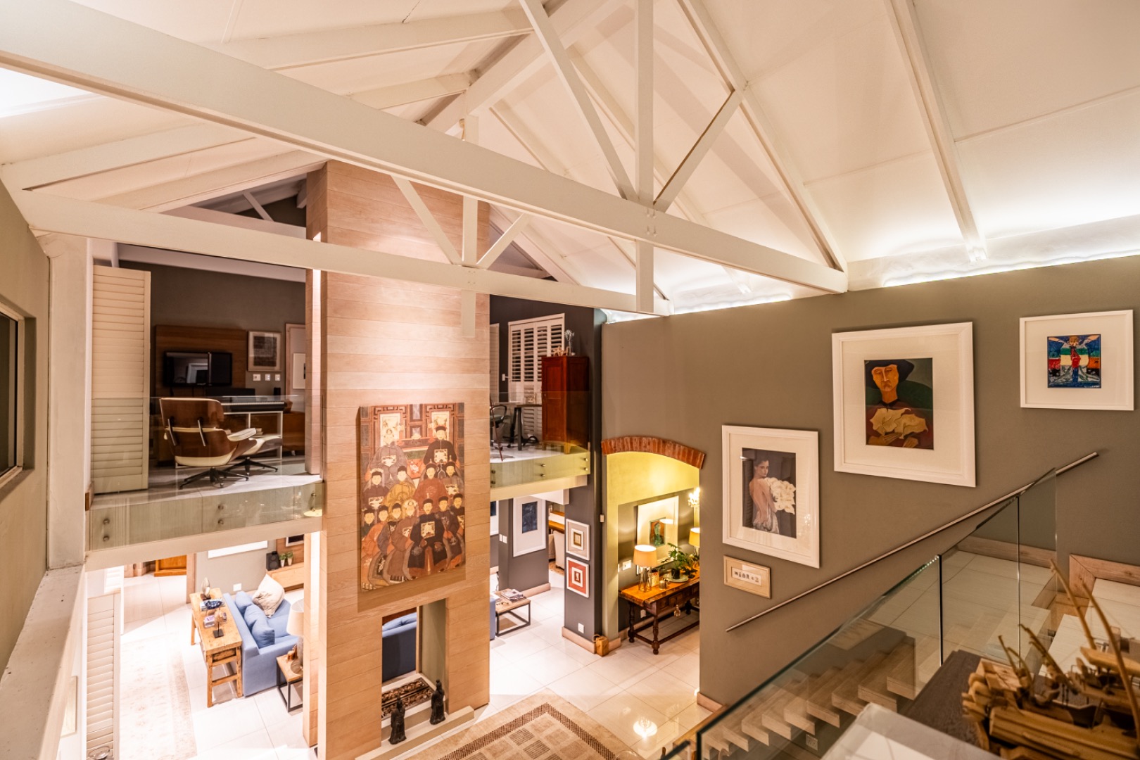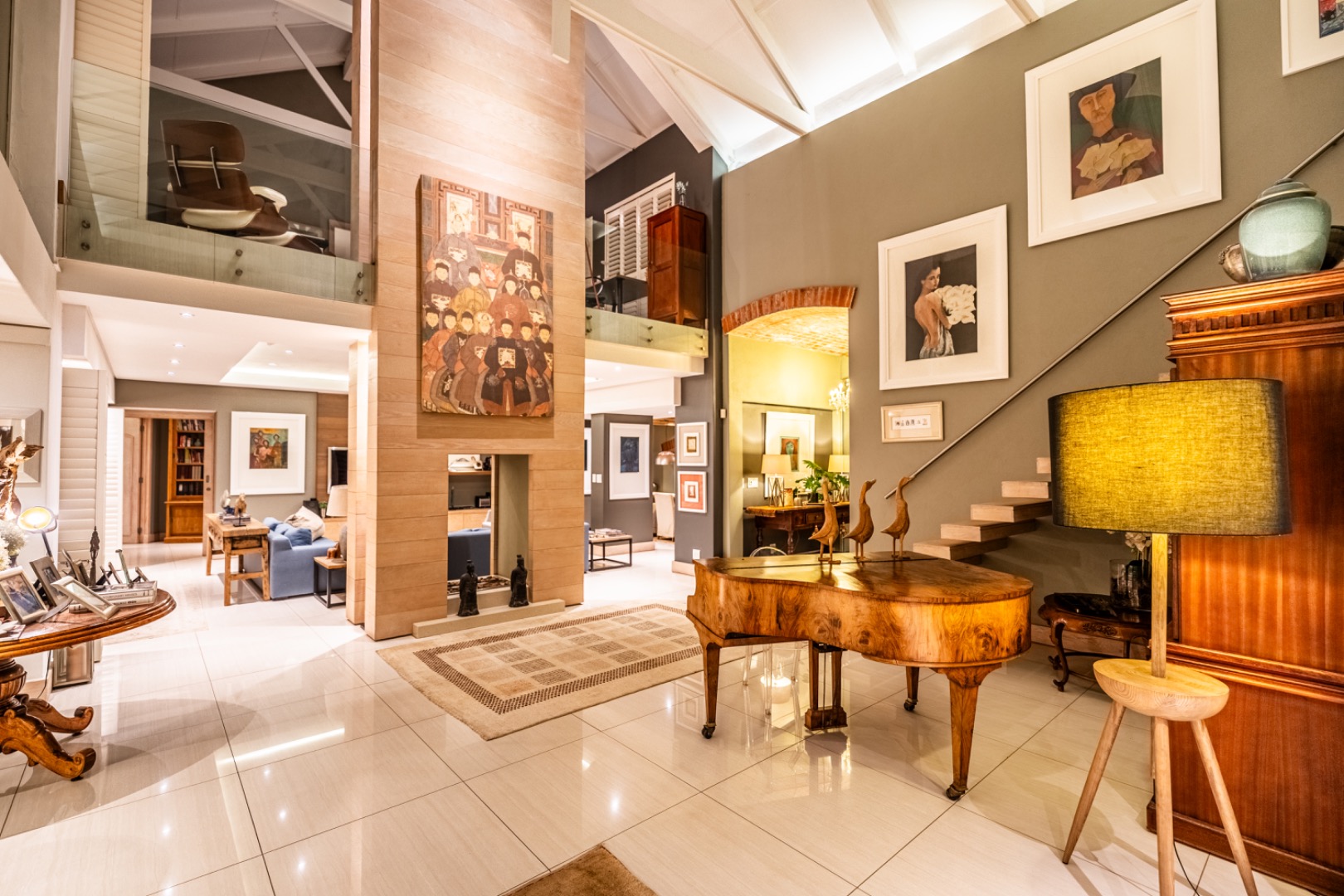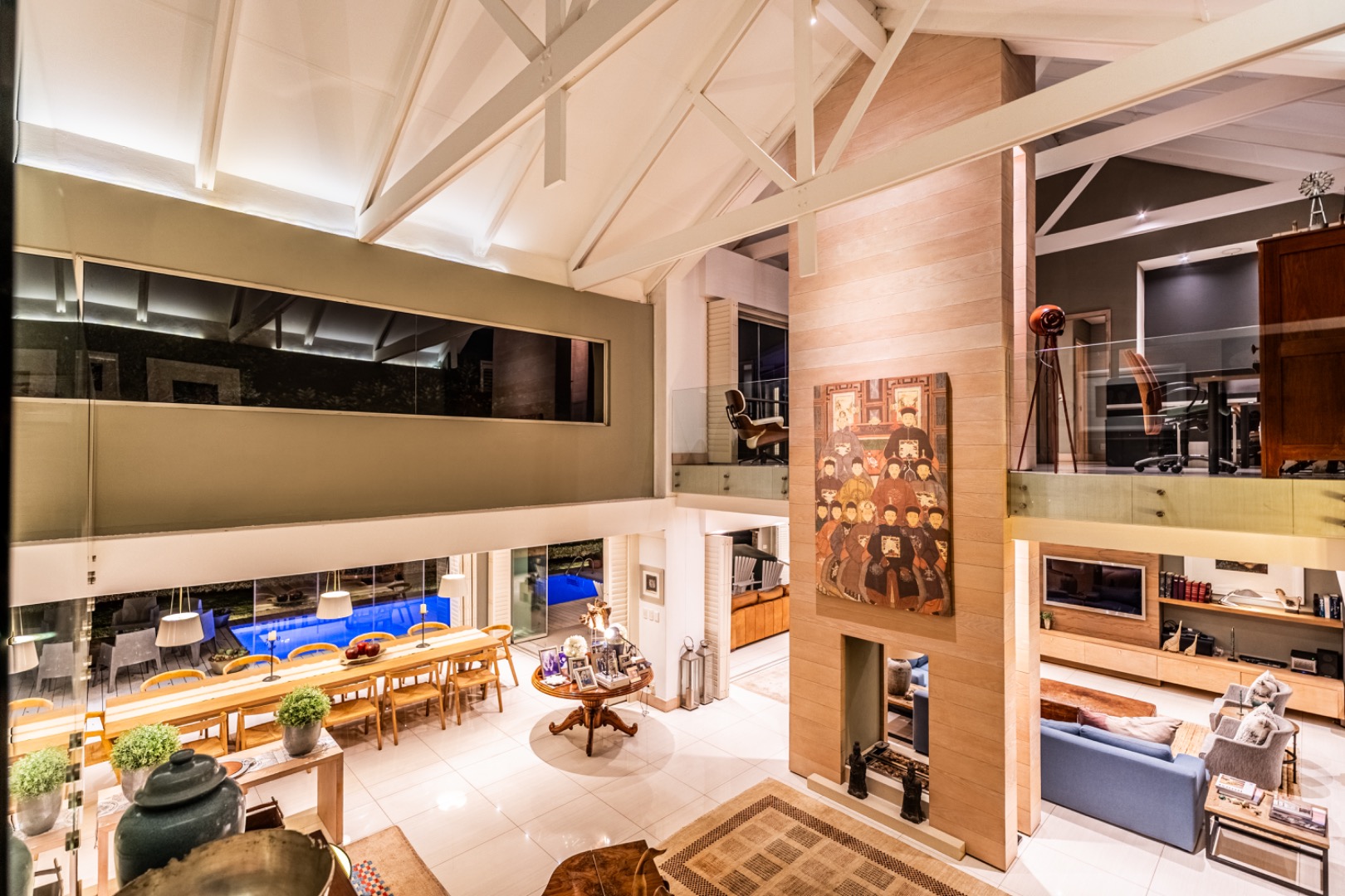 Upstairs, two spacious en-suite bedrooms provide comfortable accommodation, accompanied by a relaxed TV lounge. A separate glass-balustraded section houses a large study with its own fireplace and access to a private balcony, creating an ideal work-from-home environment.