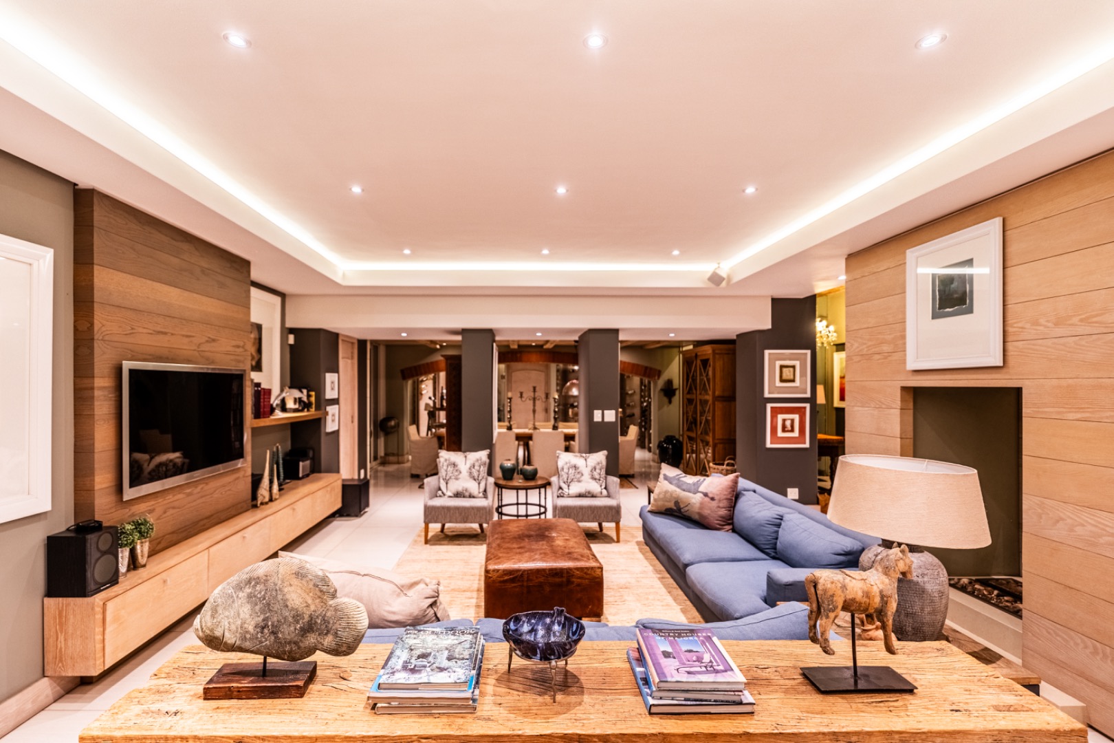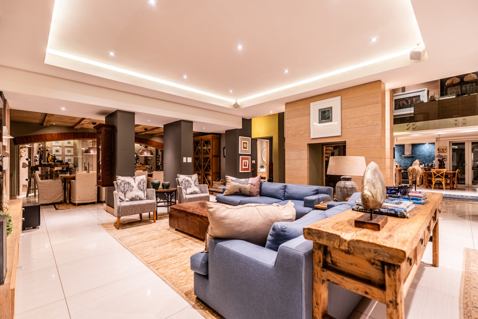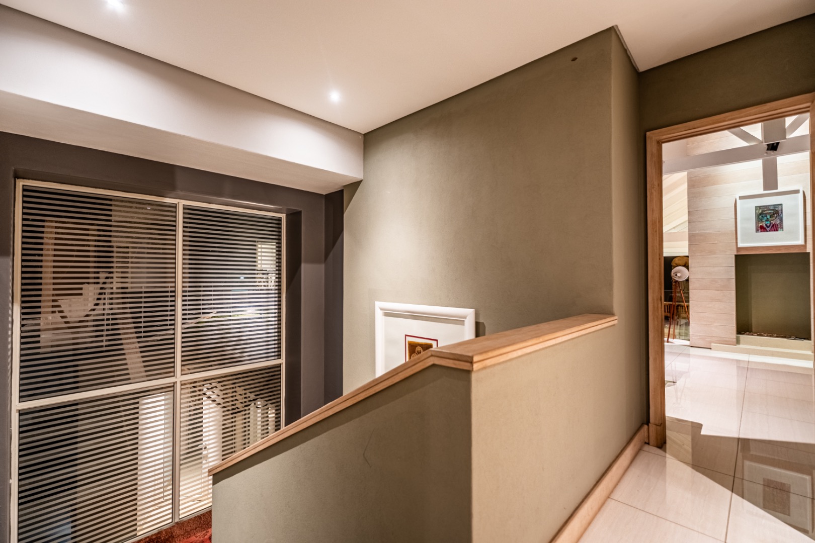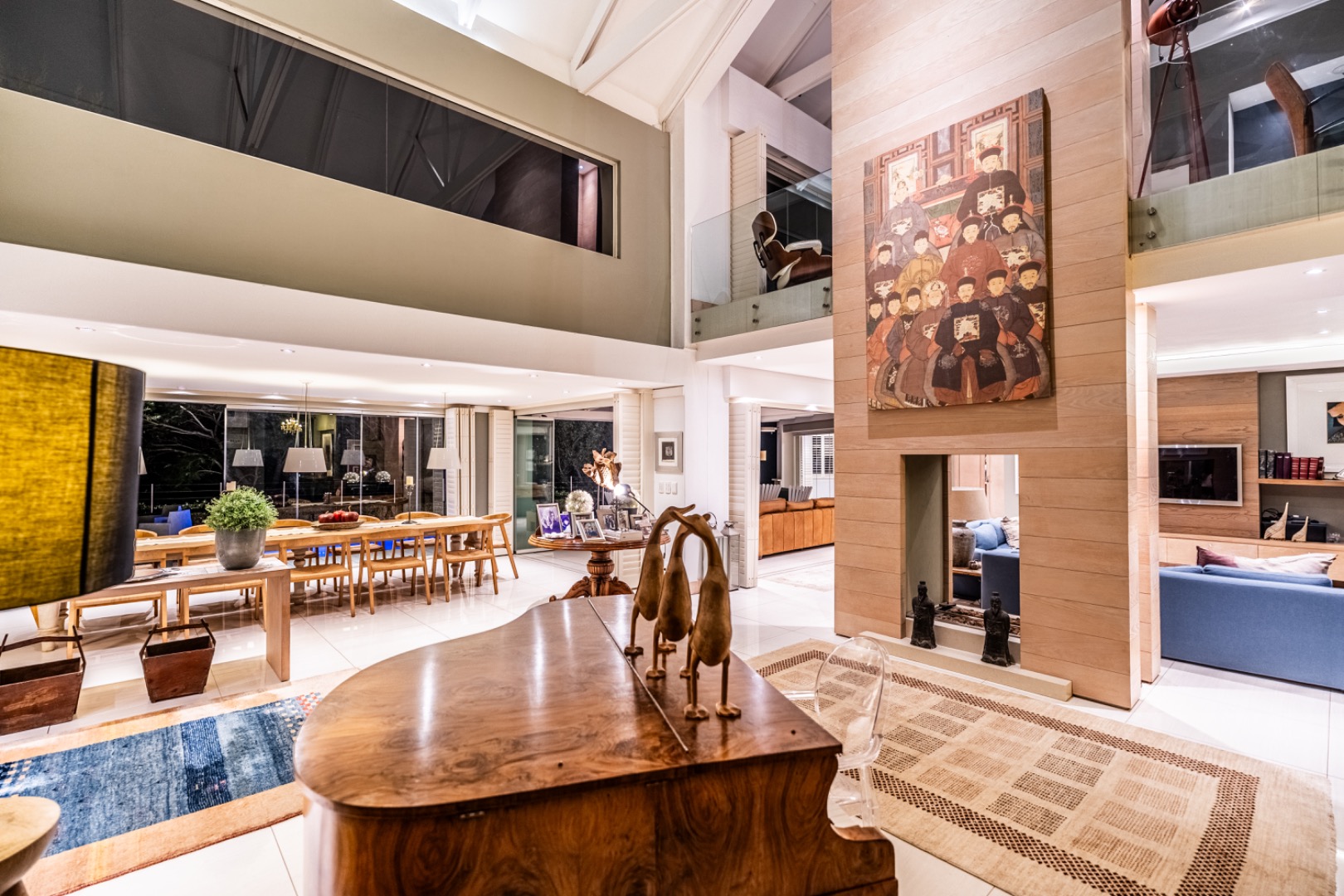 Upstairs, two spacious en-suite bedrooms provide comfortable accommodation, accompanied by a relaxed TV lounge. A separate glass-balustraded section houses a large study with its own fireplace and access to a private balcony, creating an ideal work-from-home environment.