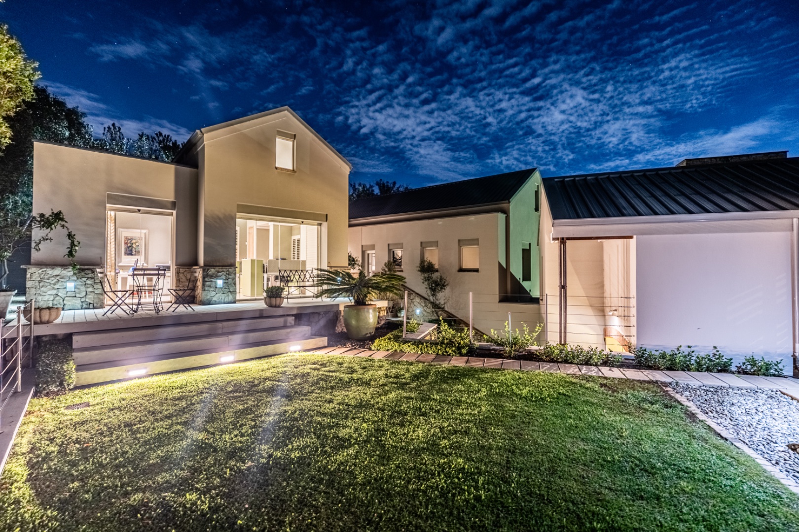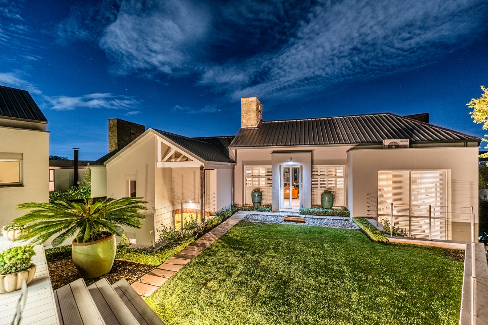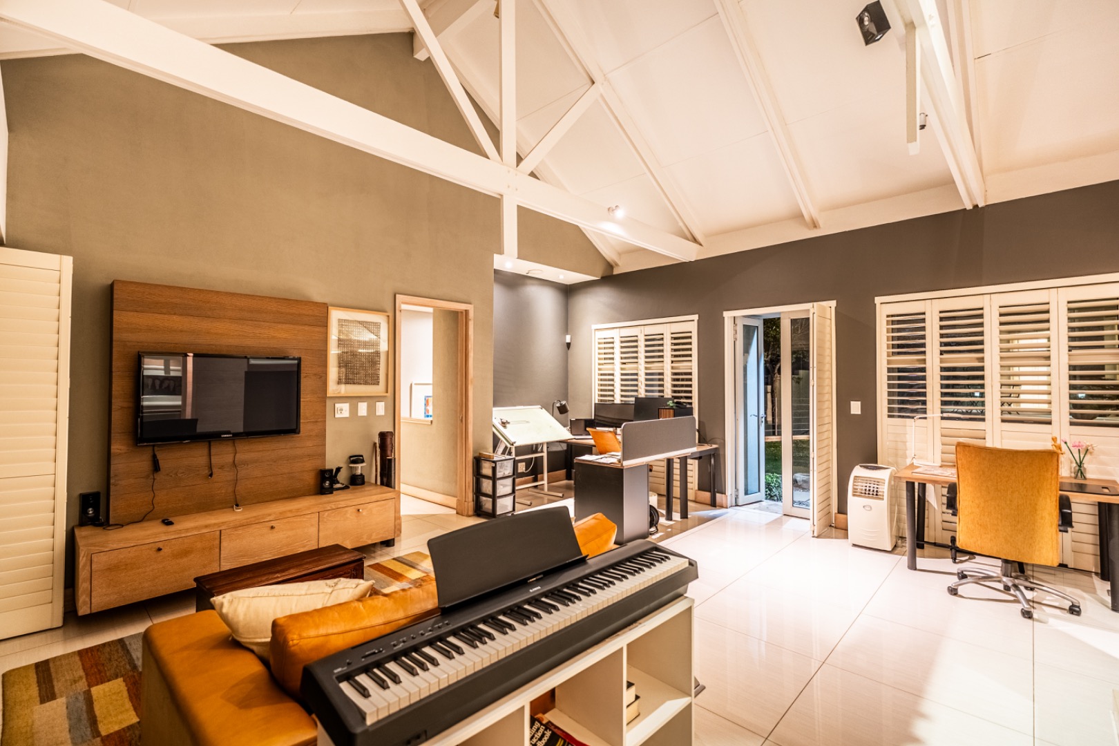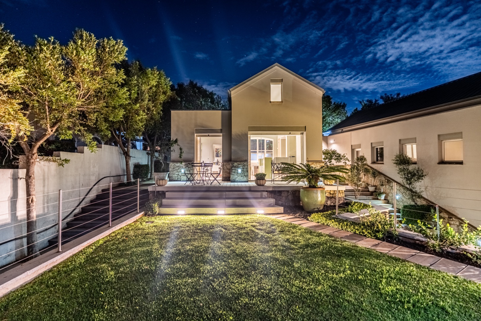 Extending from the upstairs TV lounge across a charming grass courtyard is a versatile additional space complete with a bathroom and kitchenette. This area can function perfectly as a private office, guest suite, or fully self-contained flatlet.