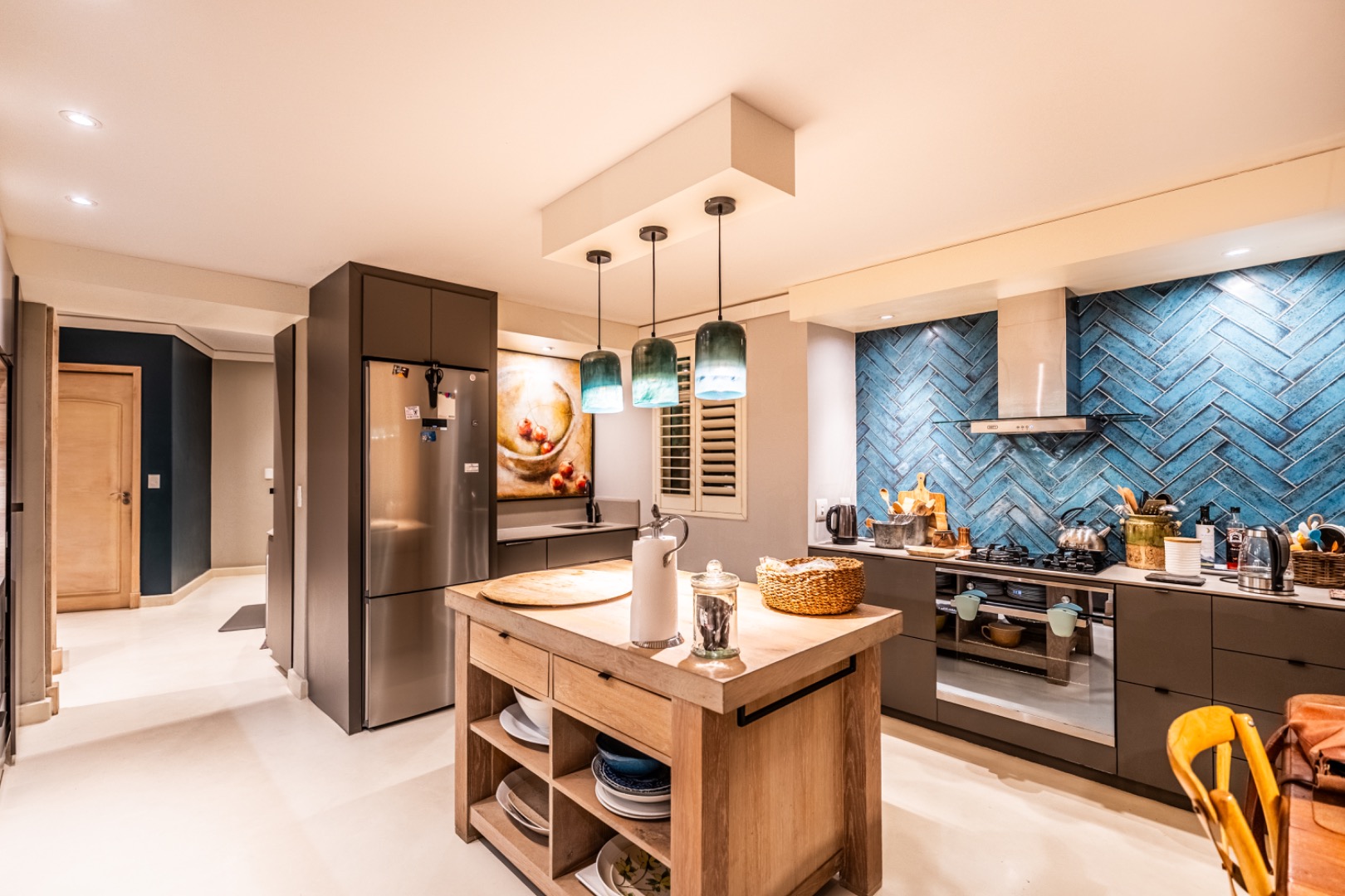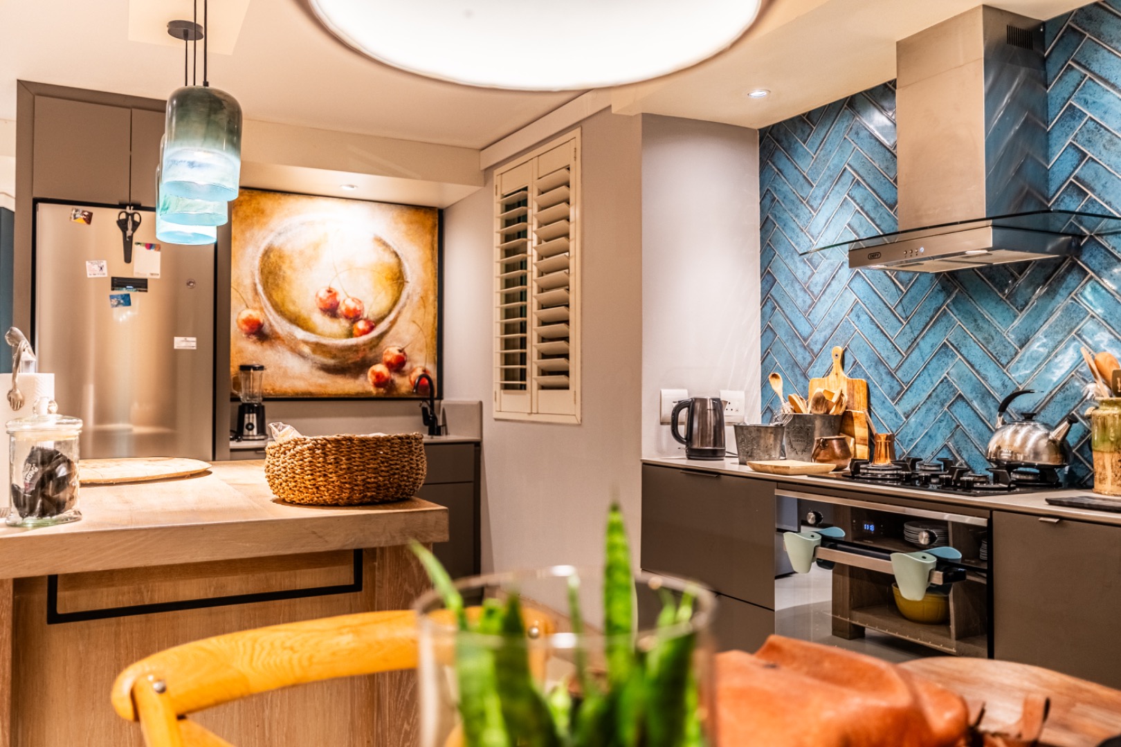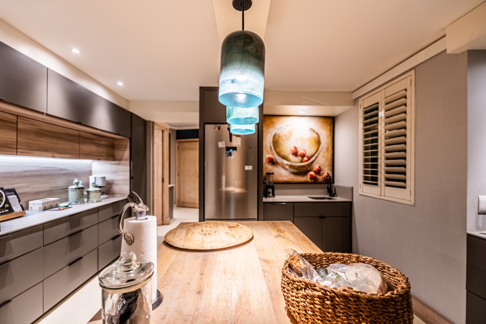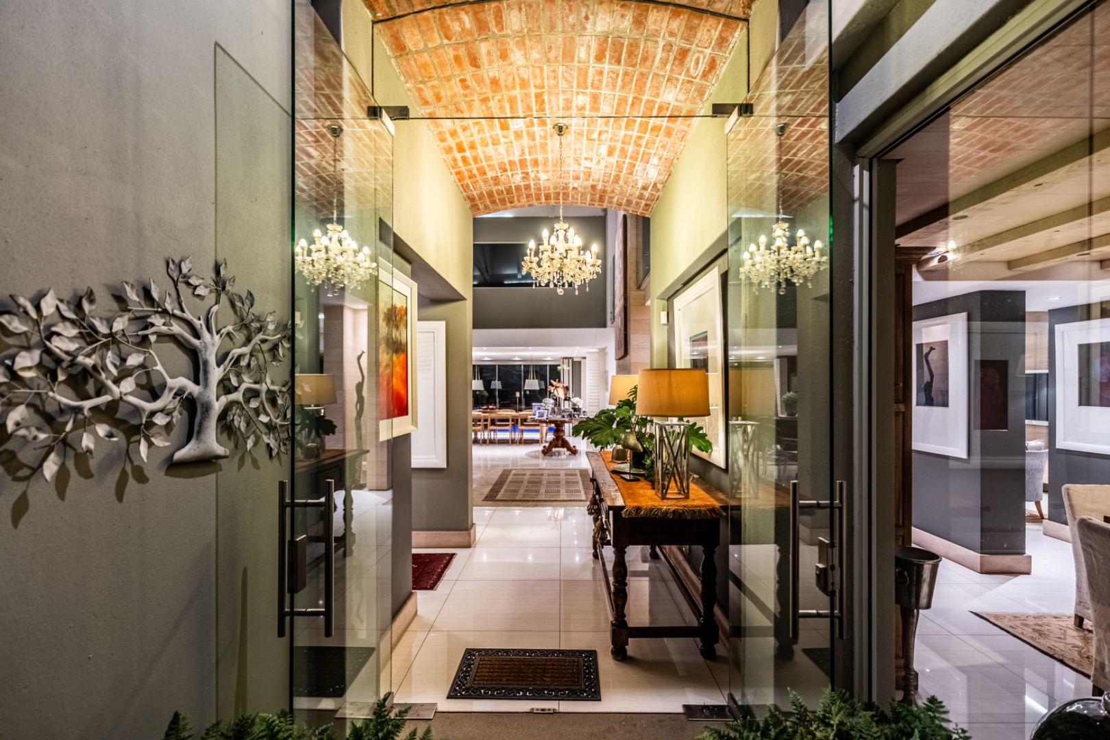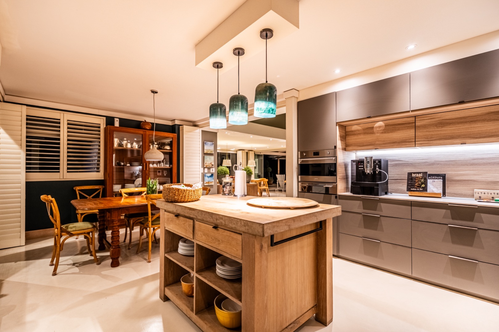 A striking double-volume entrance welcomes you into the home, creating an immediate sense of grandeur, natural light, and openness. The beautifully appointed kitchen is both functional and stylish, featuring a gas hob with electric oven, convection microwave, warming drawer, and a generous oak island. Practical additions include a walk-in pantry, separate scullery and laundry area, as well as ample storage throughout.
