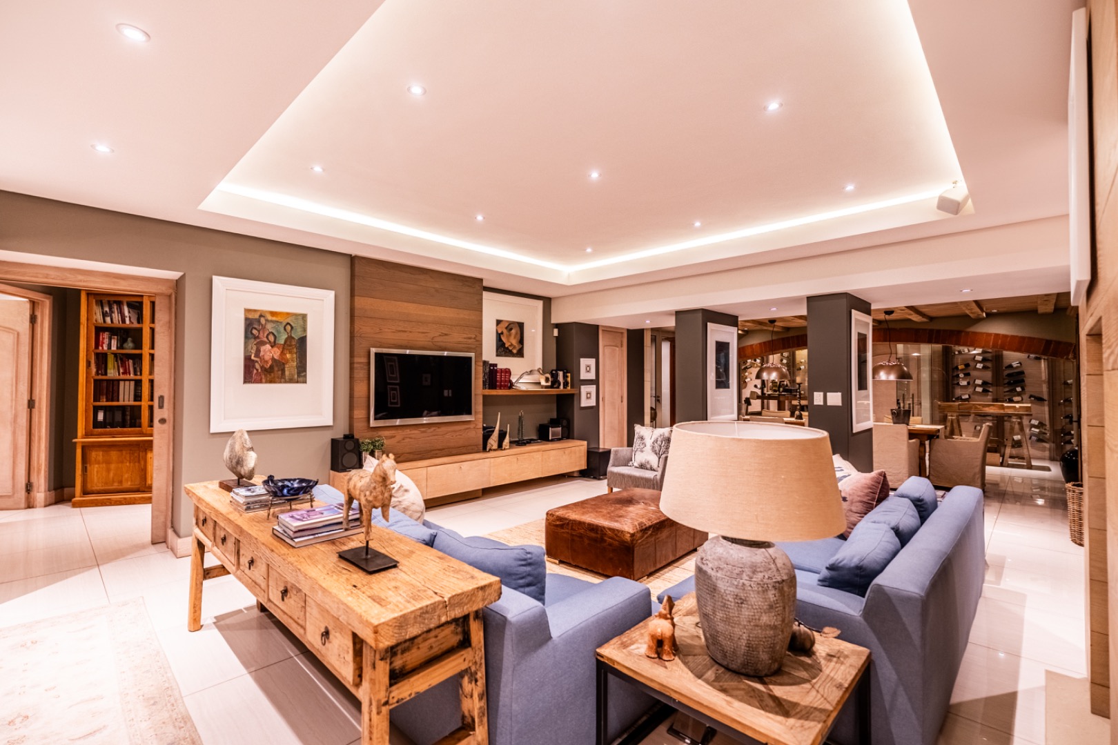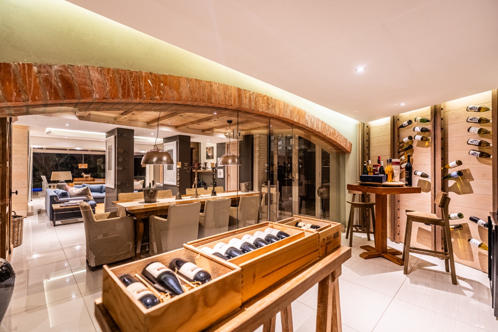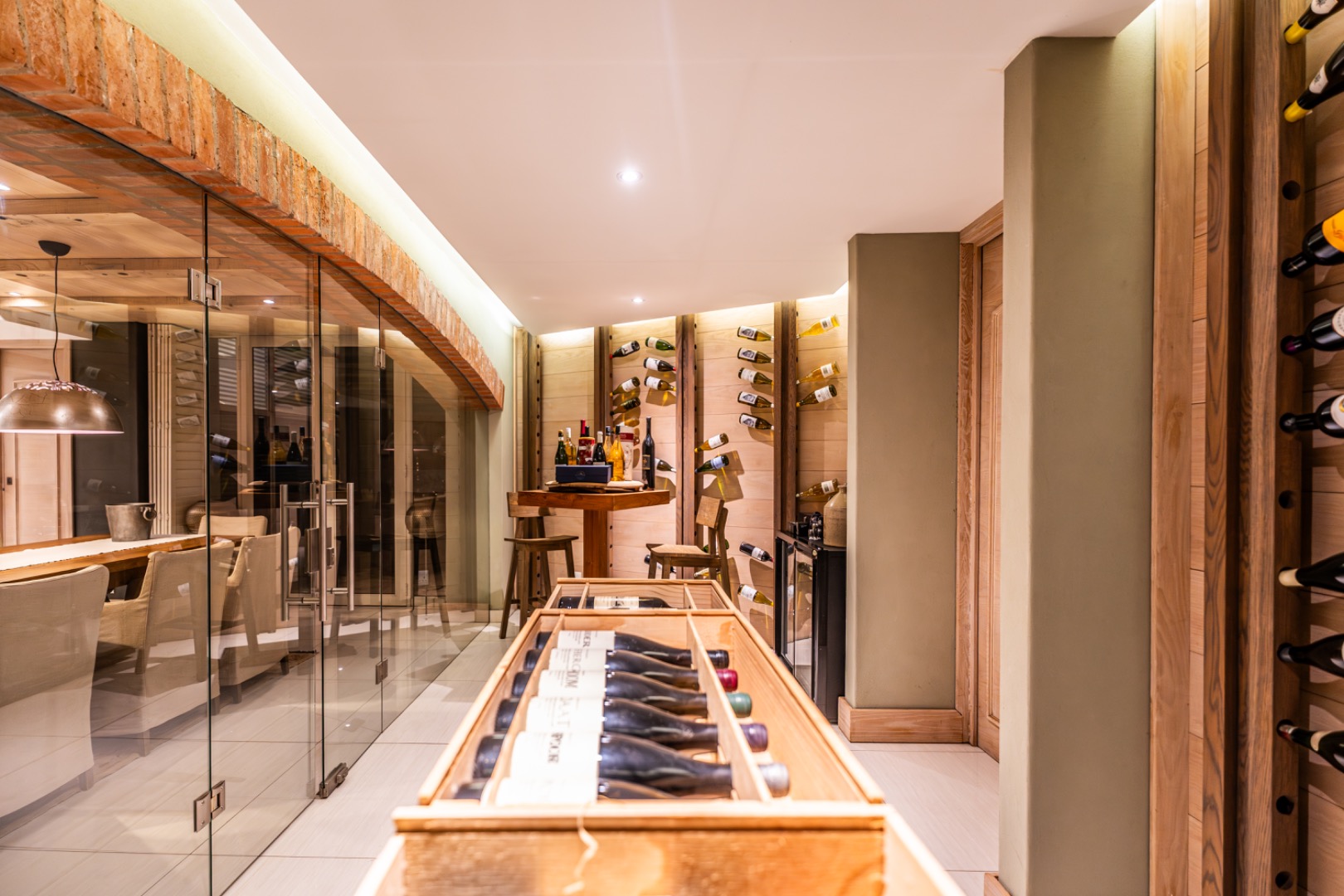 Designed for effortless entertaining and comfortable family living, the home offers three sophisticated open-plan reception areas complemented by a spacious dining room. A dramatic glass-enclosed wine cellar serves as a stunning focal point for wine enthusiasts, while three strategically placed fireplaces add warmth and atmosphere to the living spaces.