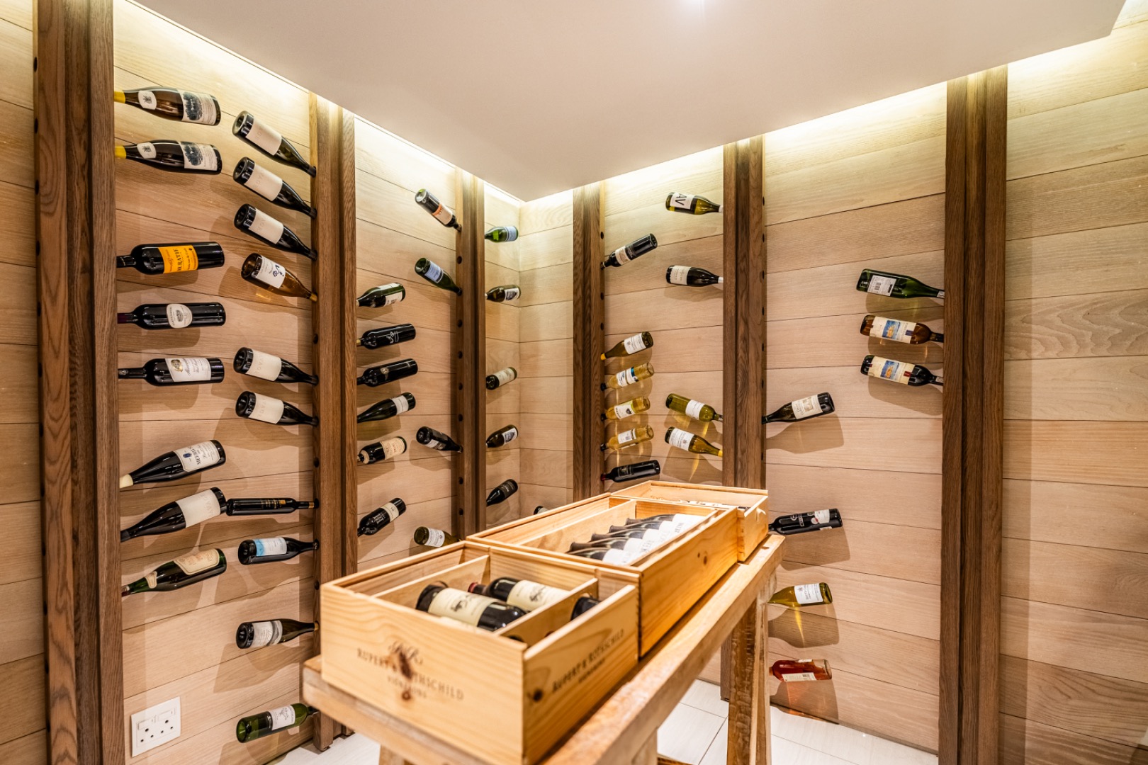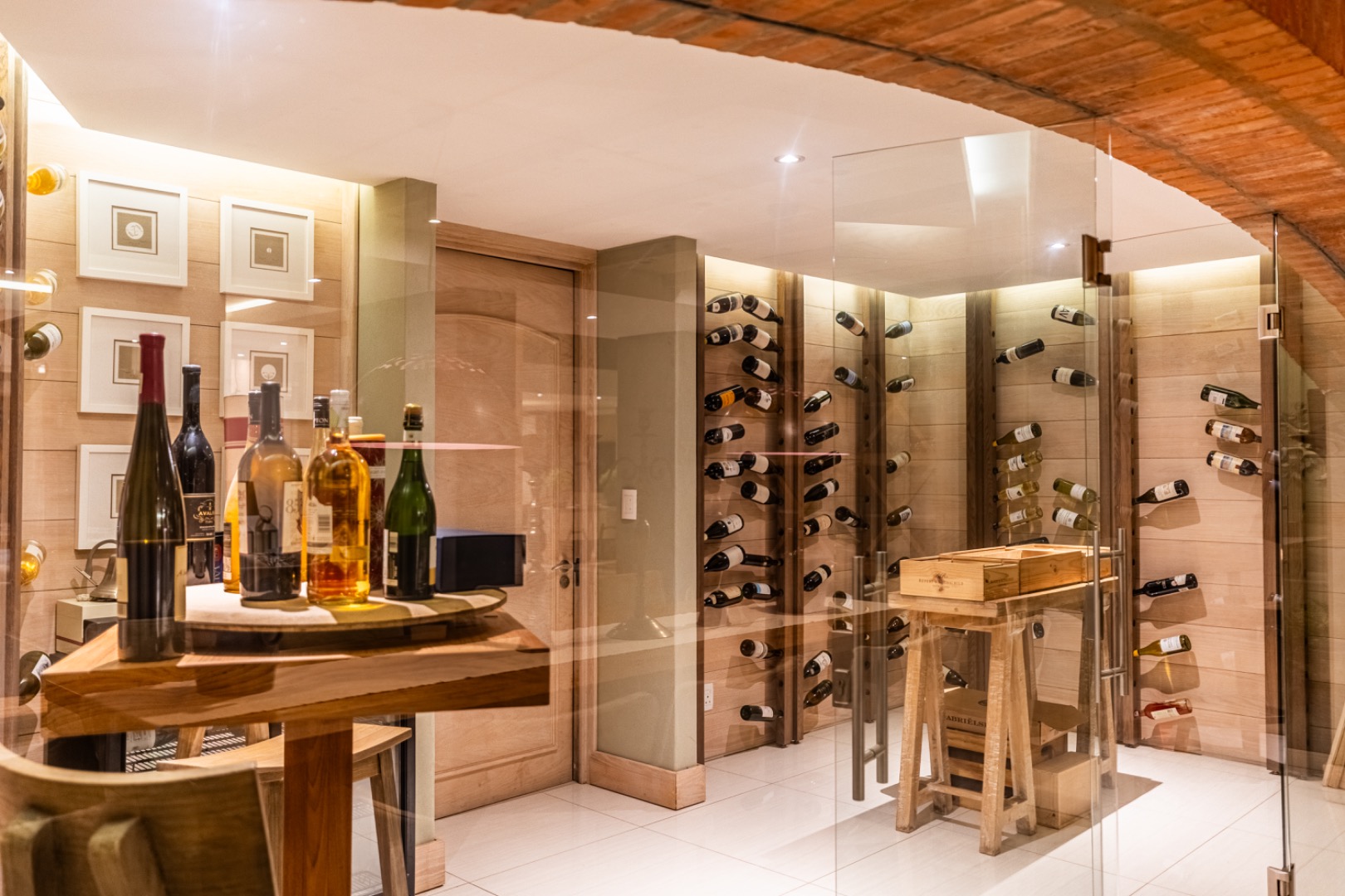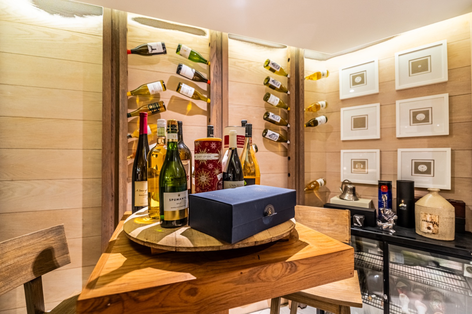 Designed for effortless entertaining and comfortable family living, the home offers three sophisticated open-plan reception areas complemented by a spacious dining room. A dramatic glass-enclosed wine cellar serves as a stunning focal point for wine enthusiasts, while three strategically placed fireplaces add warmth and atmosphere to the living spaces.