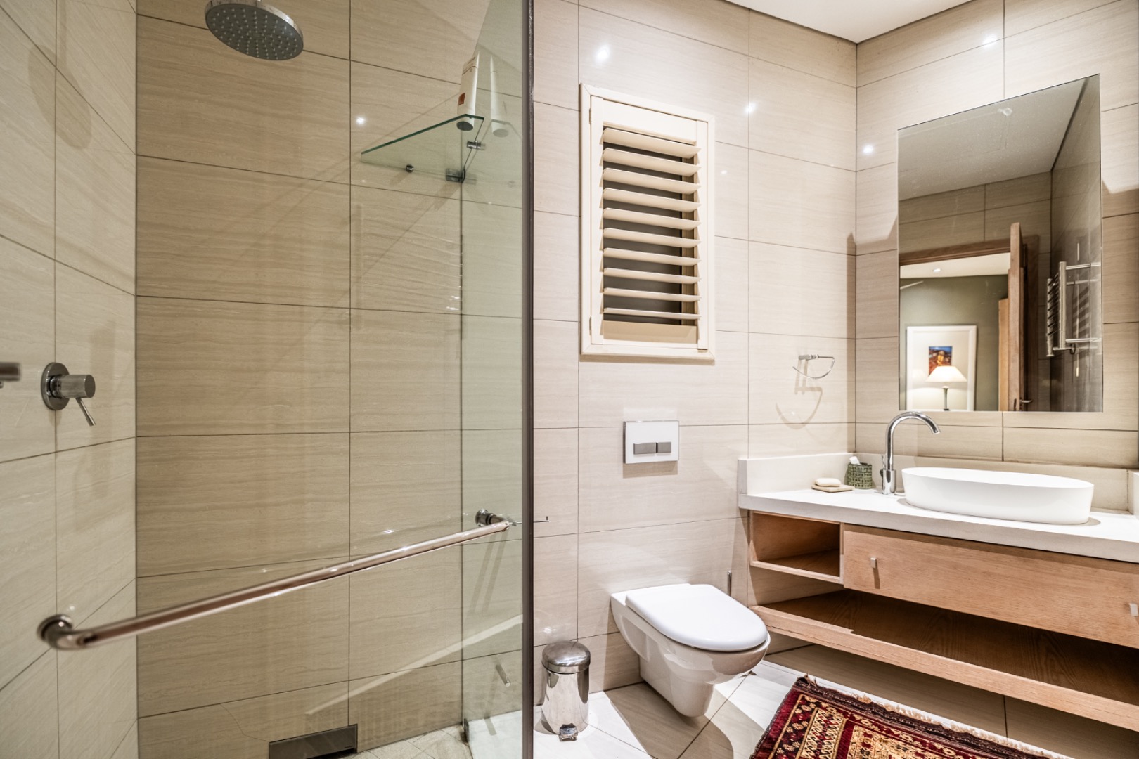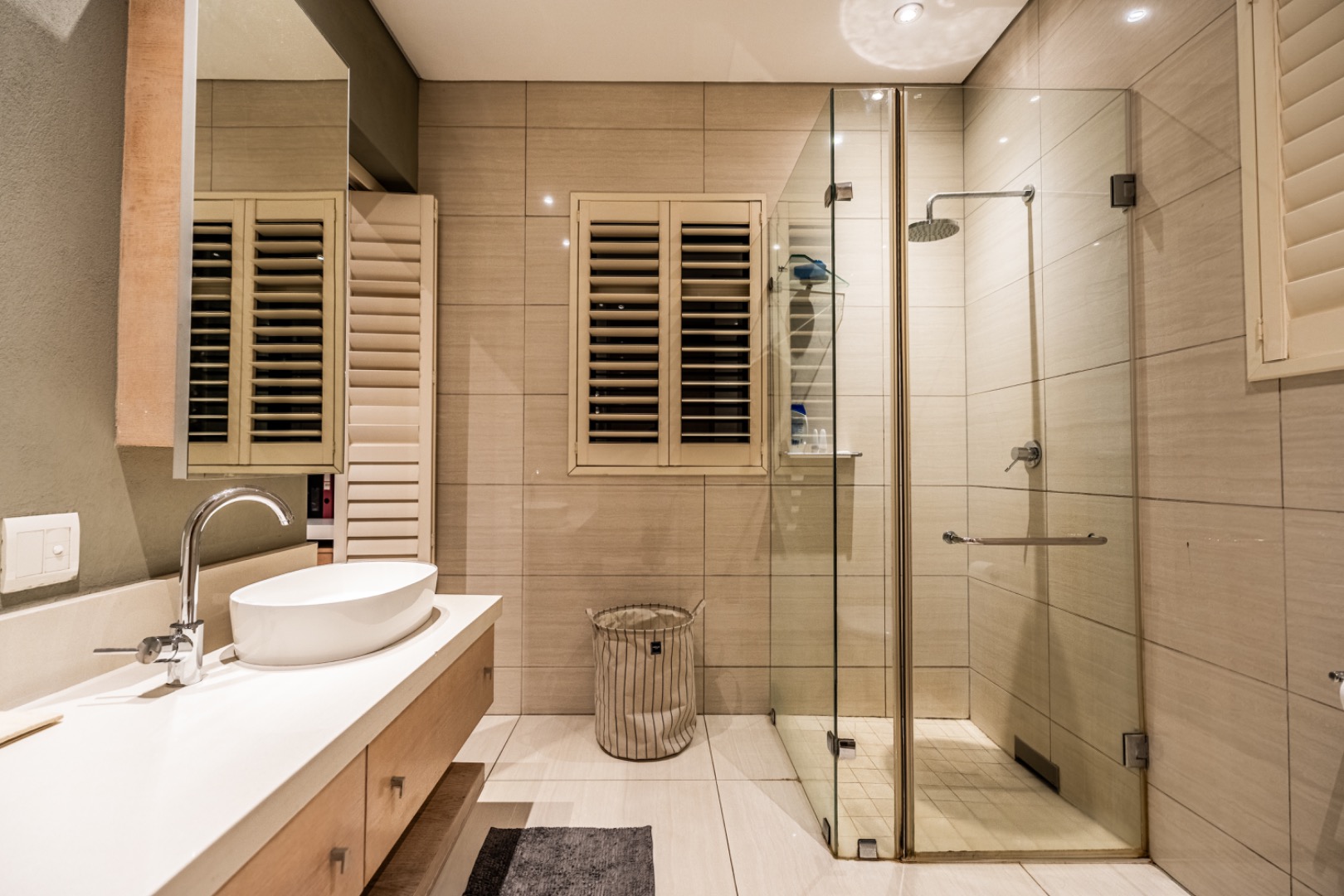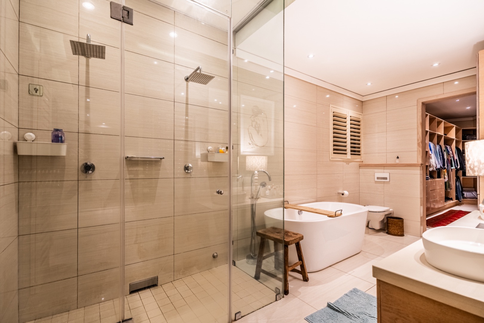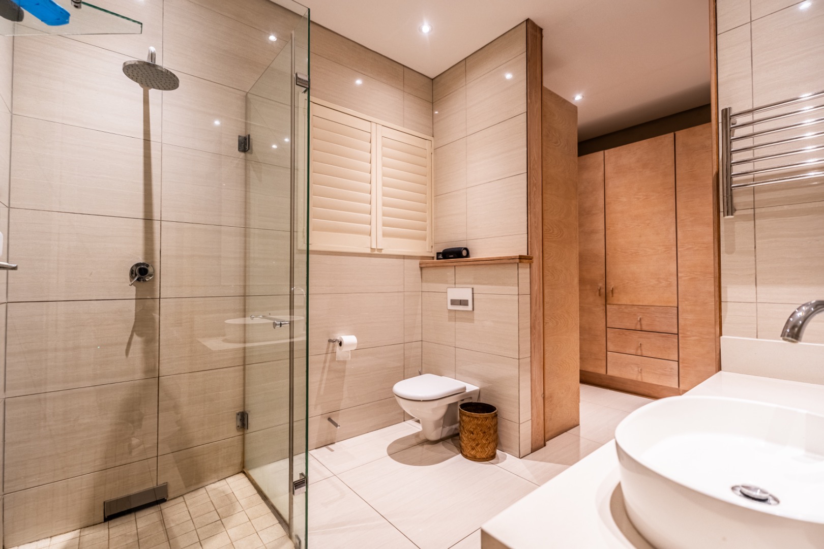 The luxurious main bedroom suite is conveniently located on the ground floor, where a full glass wall opens onto a private patio overlooking the tranquil greenery. The suite includes a generous walk-in dressing room and an elegant bathroom with a steam shower. Additional storage areas and a seasonal wardrobe space enhance the practicality of this private sanctuary.
