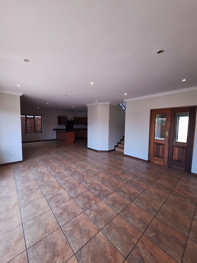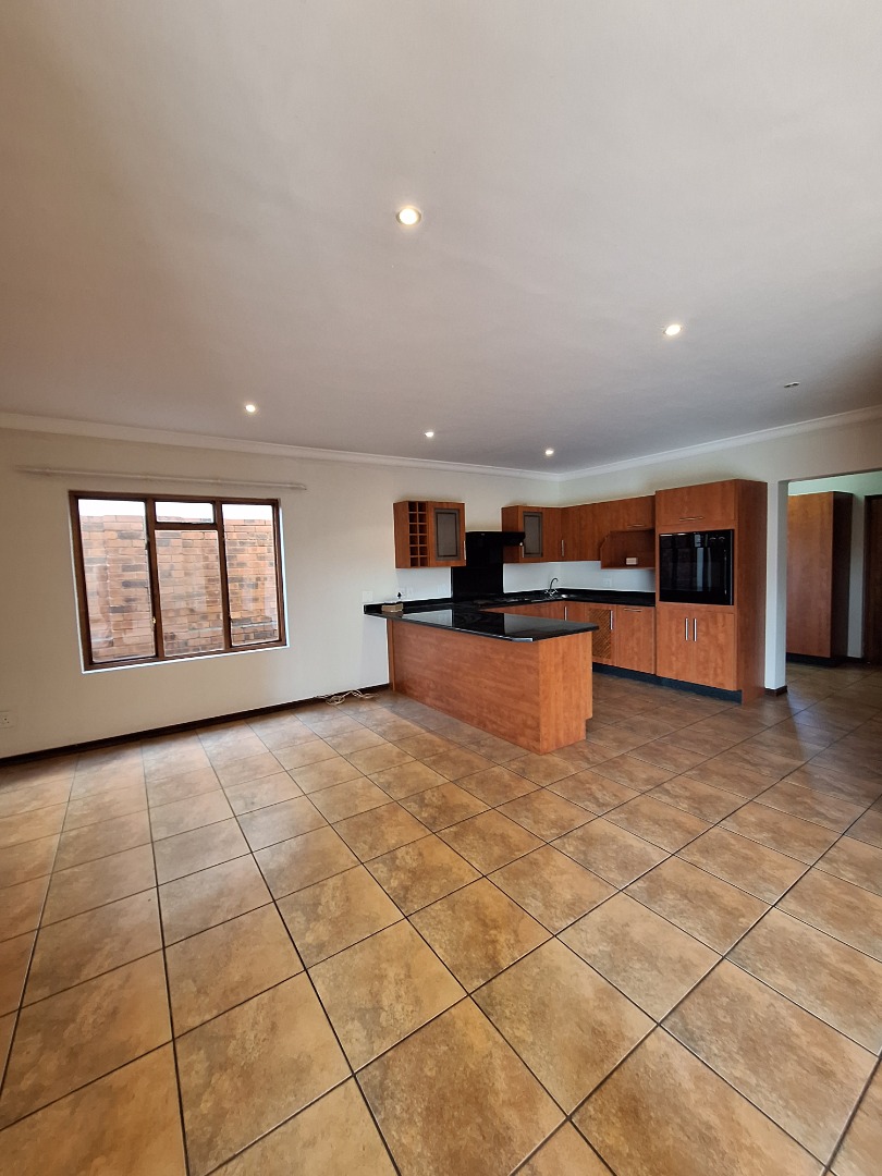 This modern Mediterranean-style residence, located within a secure estate in Bronberg, Pretoria, presents an inviting facade with light stucco and terracotta roof tiles. Inside, a spacious open-plan layout features durable tiled flooring, neutral walls, and recessed lighting. The contemporary kitchen boasts wood-toned cabinetry, black countertops, integrated appliances, a breakfast bar, and a pantry. A dedicated dining area and family TV room offer versatile living spaces.