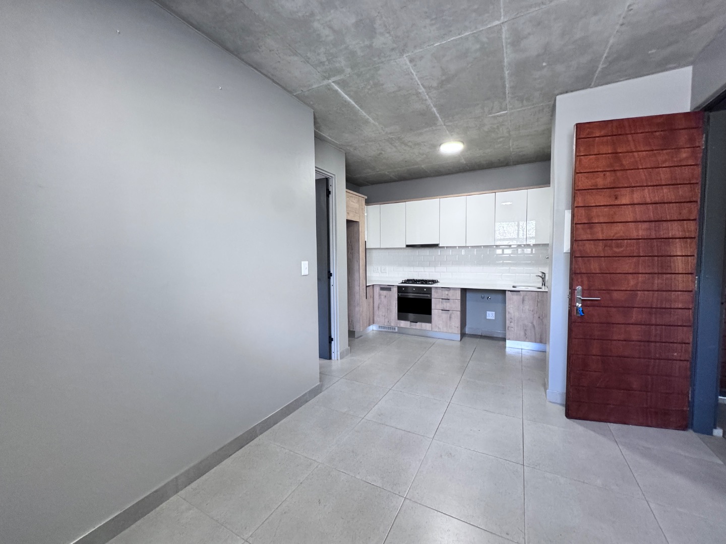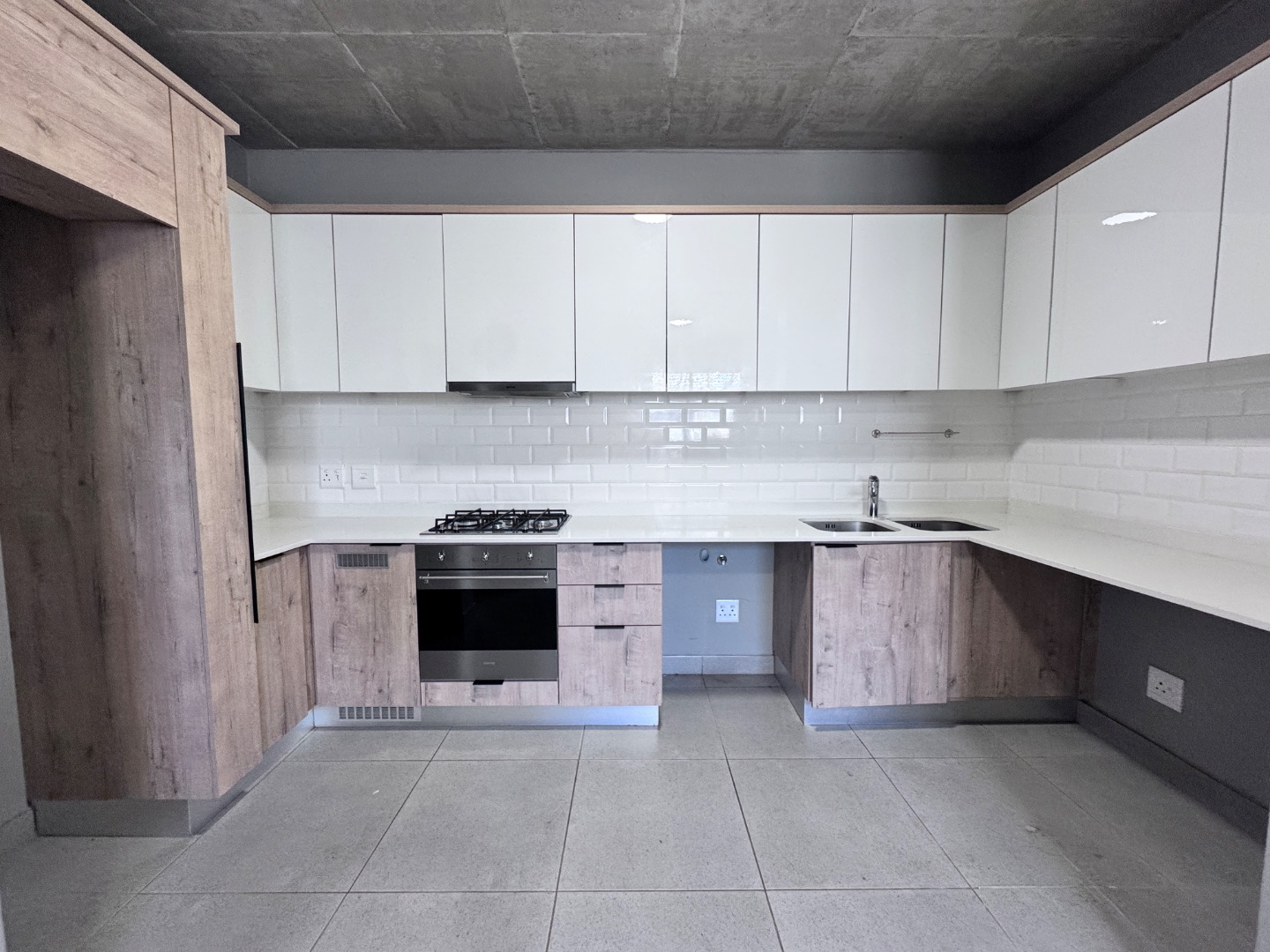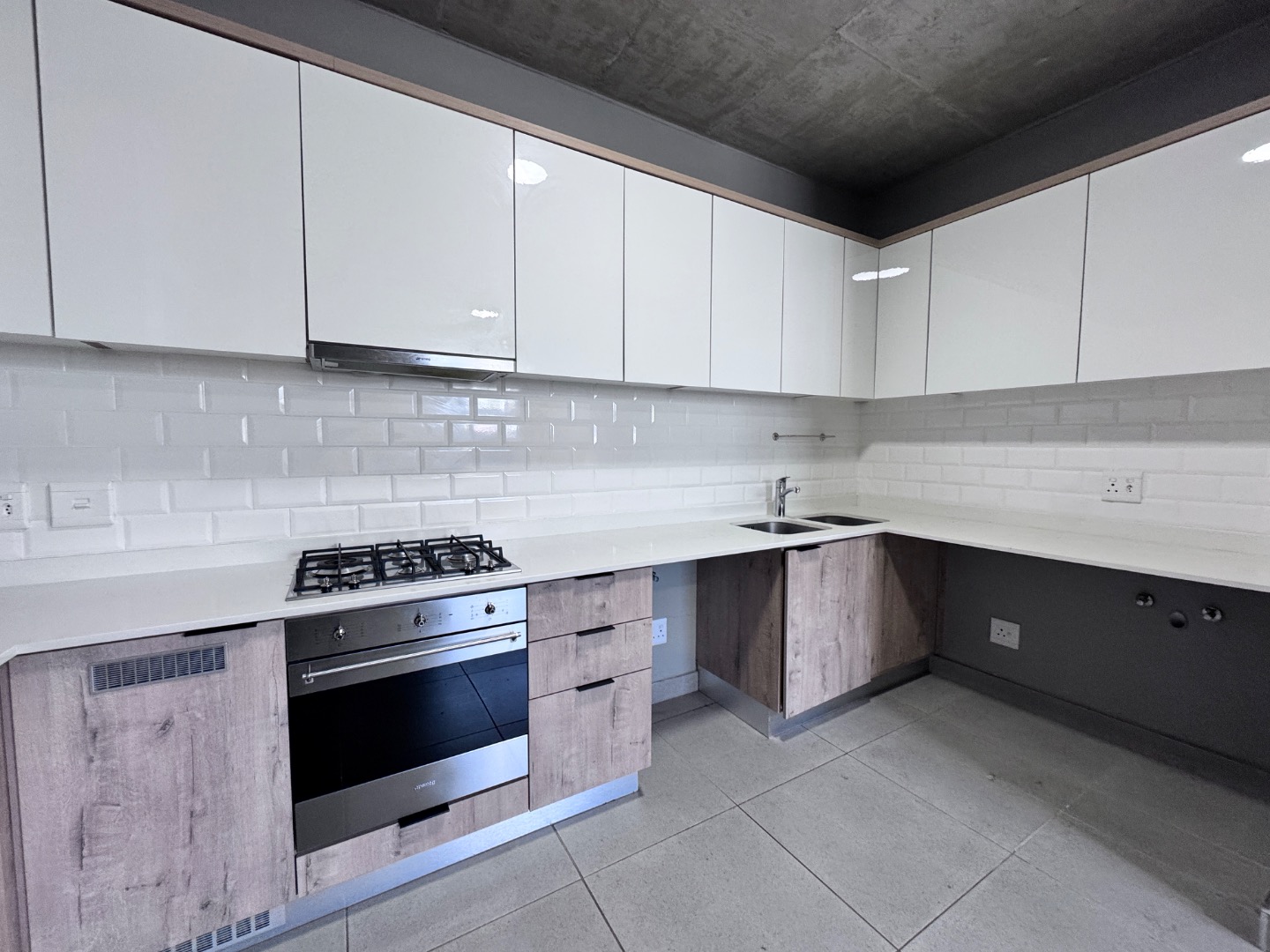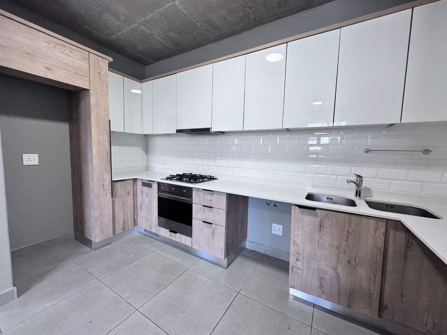 Discover contemporary living in this stylish 41sqm apartment located in a sought-after security complex in Pretoria's Brooklyn suburb. The open-plan layout seamlessly integrates the living area with a state-of-the-art kitchen, designed for both aesthetics and functionality. Featuring glossy white upper cabinets, warm wood-grain lower cabinetry, a gas hob, built-in oven, and extractor fan, the kitchen is complemented by a chic subway tile backsplash and a practical double under-mount sink. The space boasts neutral grey walls, light tiled flooring, and a distinctive exposed concrete ceiling, creating a modern industrial aesthetic.