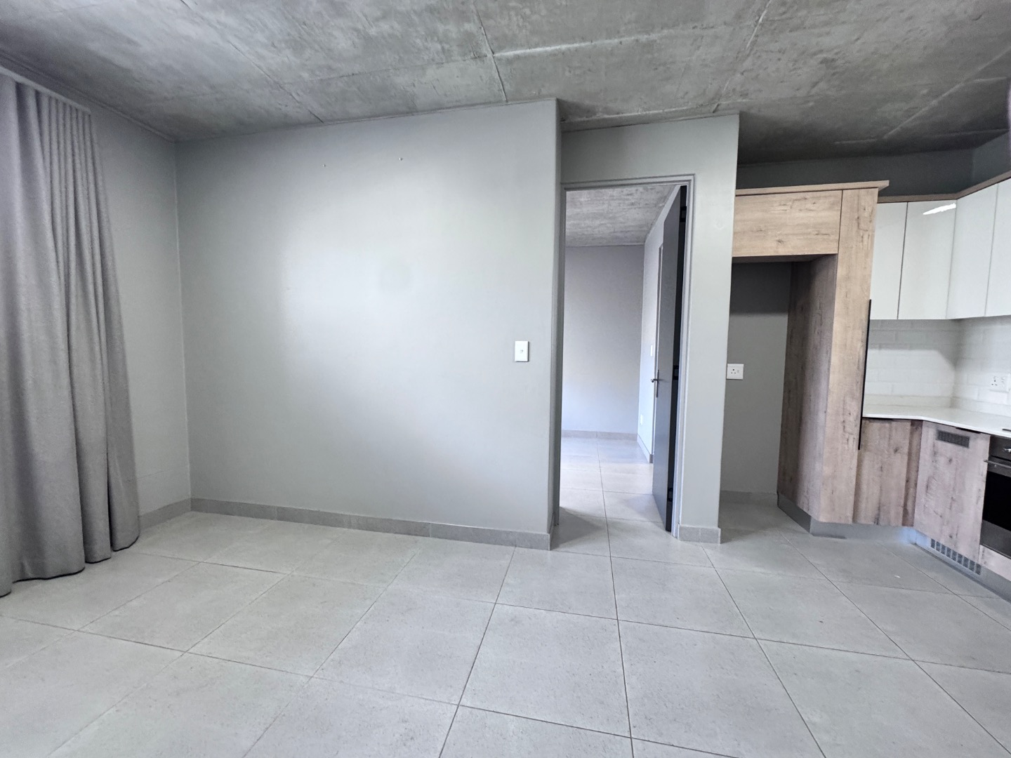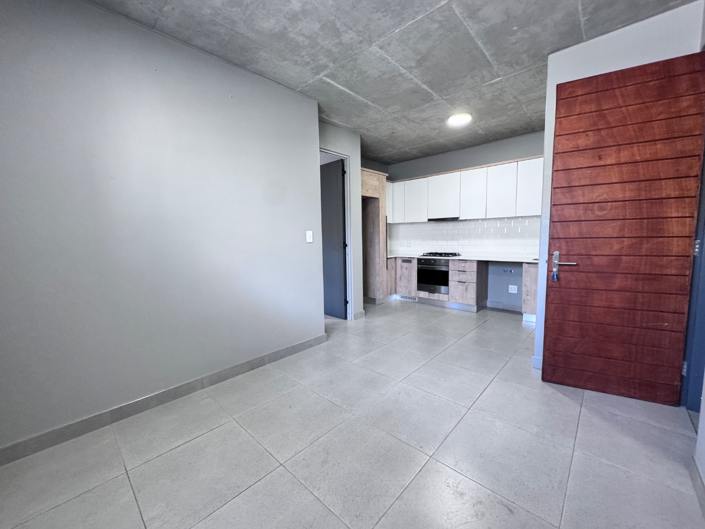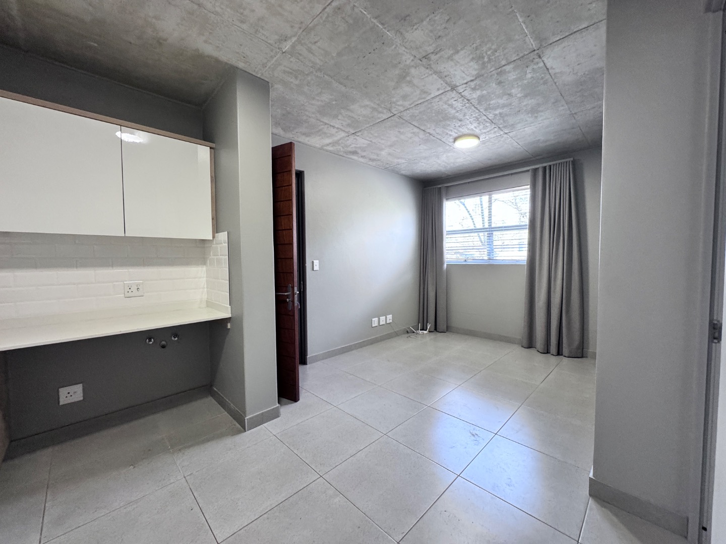 Discover contemporary living in this stylish 41sqm apartment located in a sought-after security complex in Pretoria's Brooklyn suburb. The open-plan layout seamlessly integrates the living area with a state-of-the-art kitchen, designed for both aesthetics and functionality. Featuring glossy white upper cabinets, warm wood-grain lower cabinetry, a gas hob, built-in oven, and extractor fan, the kitchen is complemented by a chic subway tile backsplash and a practical double under-mount sink. The space boasts neutral grey walls, light tiled flooring, and a distinctive exposed concrete ceiling, creating a modern industrial aesthetic.