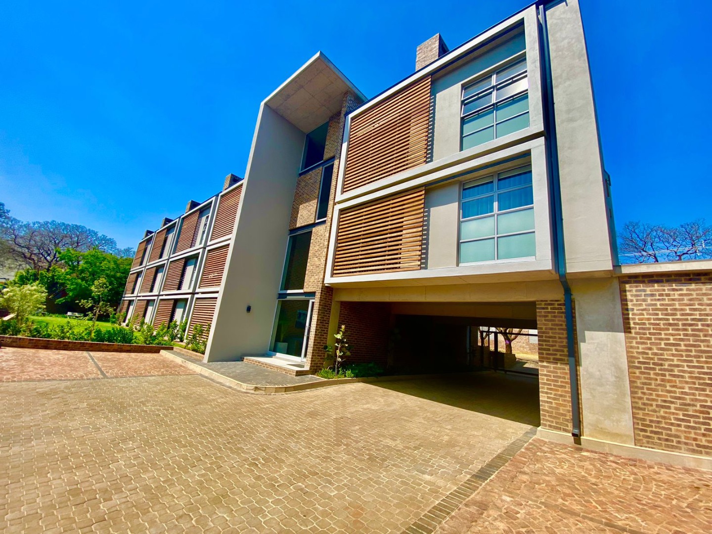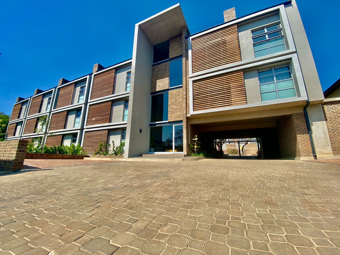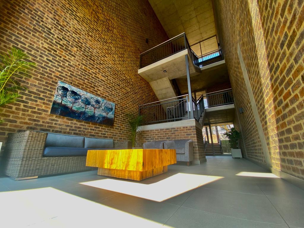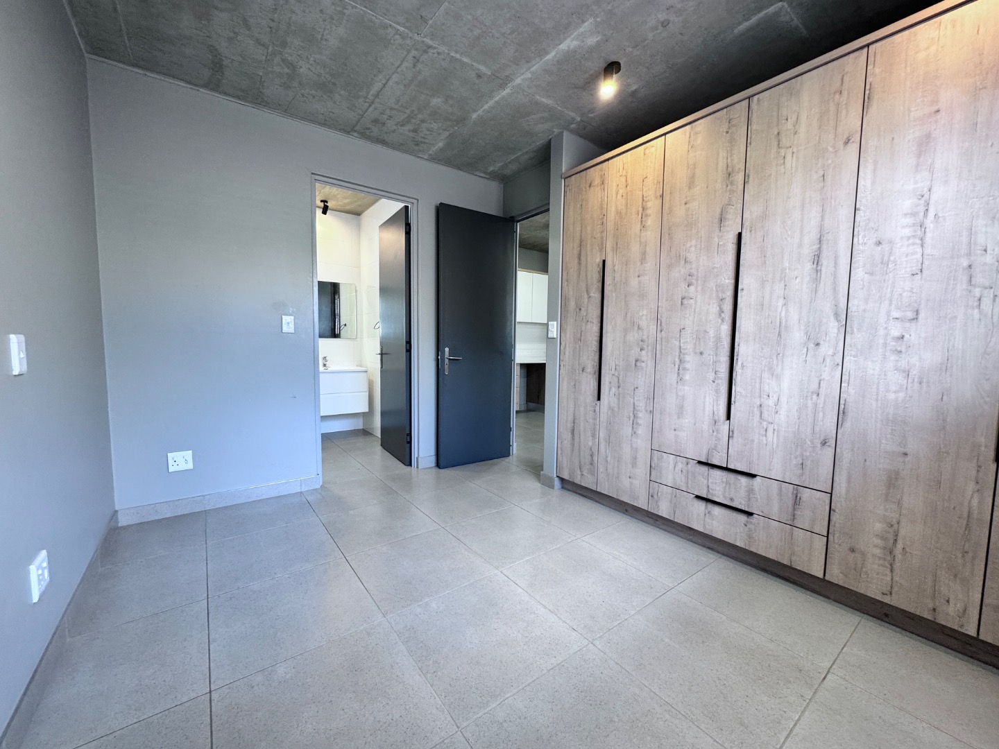 Discover contemporary living in this stylish 41sqm apartment located in a sought-after security complex in Pretoria's Brooklyn suburb. The open-plan layout seamlessly integrates the living area with a state-of-the-art kitchen, designed for both aesthetics and functionality. Featuring glossy white upper cabinets, warm wood-grain lower cabinetry, a gas hob, built-in oven, and extractor fan, the kitchen is complemented by a chic subway tile backsplash and a practical double under-mount sink. The space boasts neutral grey walls, light tiled flooring, and a distinctive exposed concrete ceiling, creating a modern industrial aesthetic.