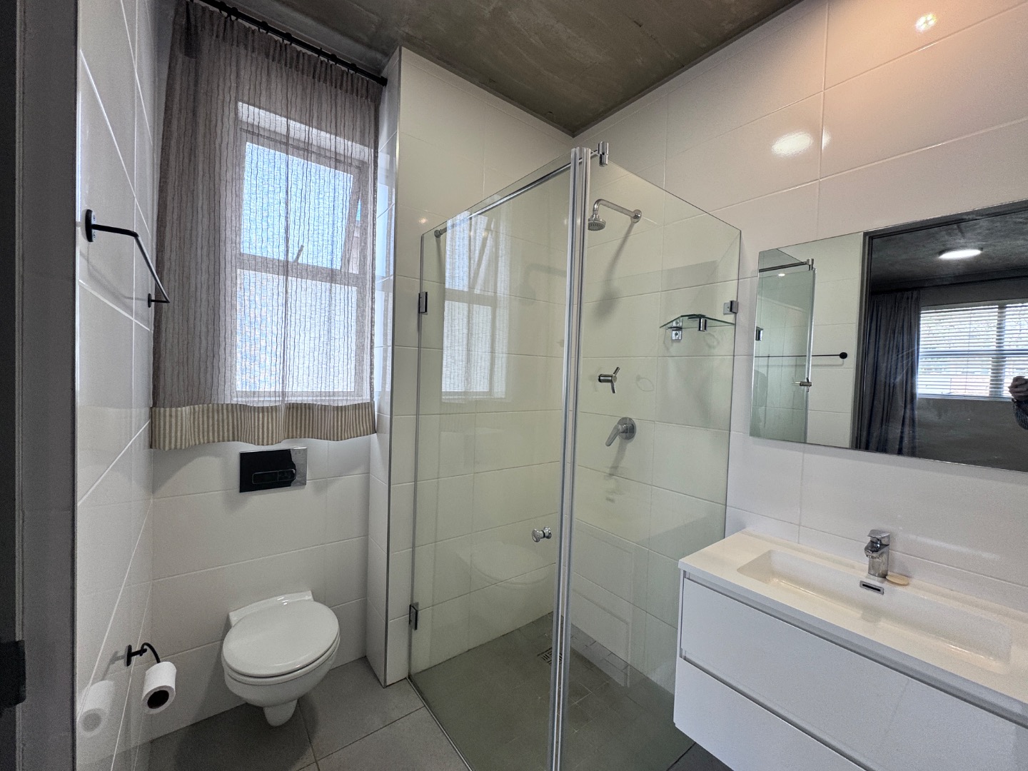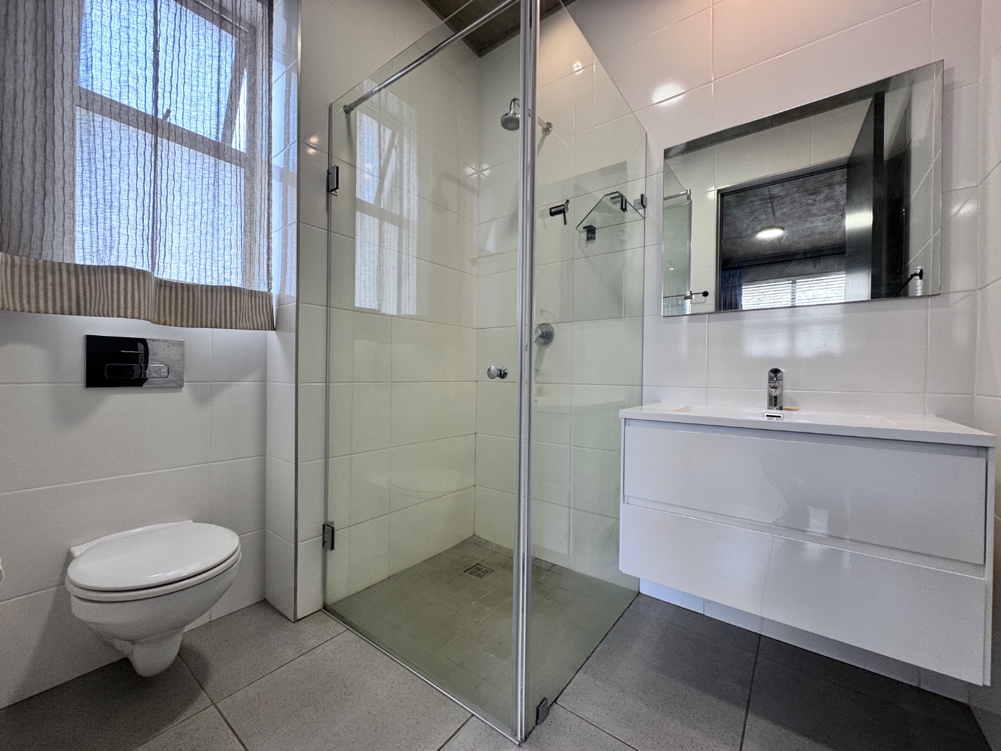 The apartment offers a comfortable single bedroom, complete with a large, wood-look built-in wardrobe providing ample storage. Large windows, fitted with blinds and curtains, ensure natural light and privacy. The modern ensuite bathroom features a sleek floating vanity, a wall-mounted toilet for easy cleaning, and a glass-enclosed shower, all finished with white tiled walls and grey tiled flooring, maintaining the contemporary design.
