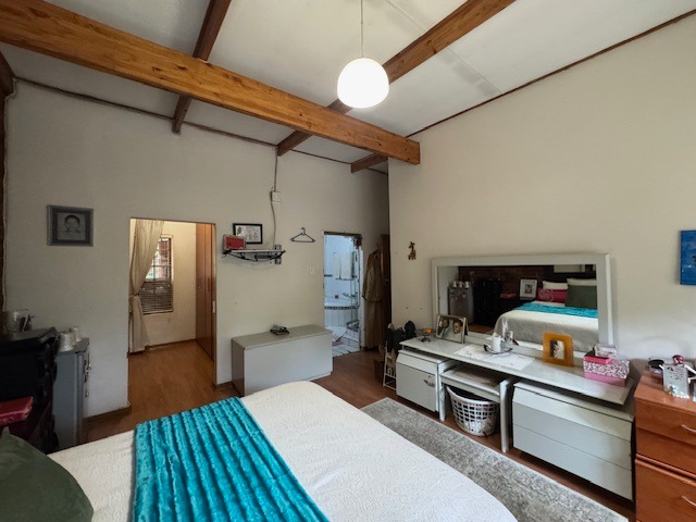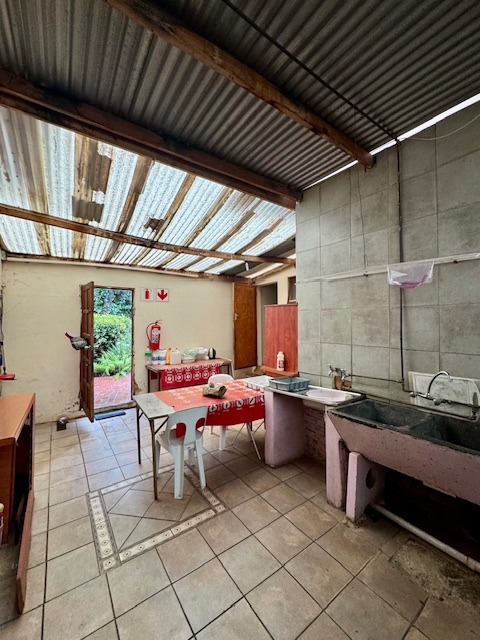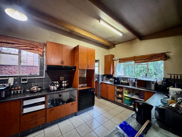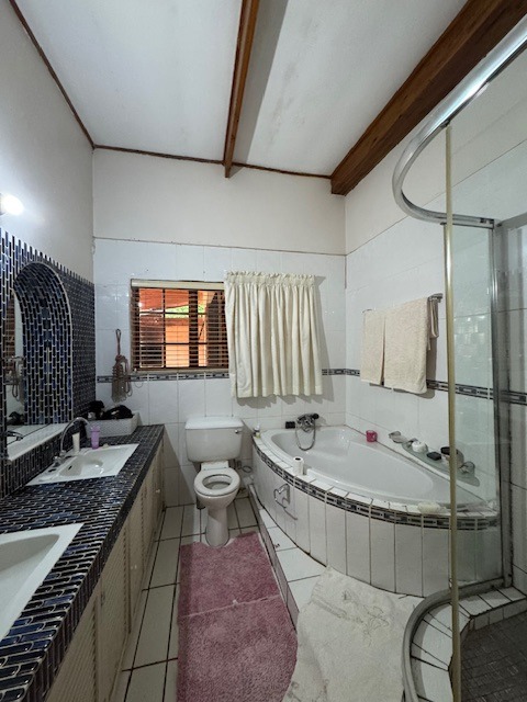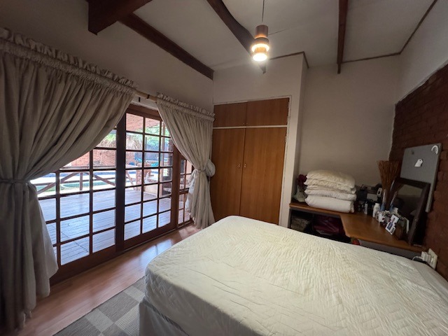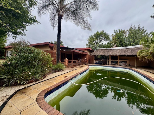 Outdoor living is a highlight, with a large garden providing a tranquil retreat. The property features a swimming pool and a thatched lapa, ideal for outdoor entertaining and enjoying the South African climate. Practical amenities include a four-car garage and additional parking for six vehicles, ensuring ample space for residents and guests. Further enhancing convenience are staff quarters, a laundry room, and dedicated storage.