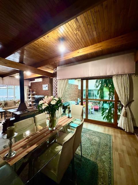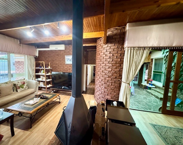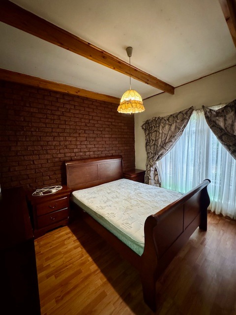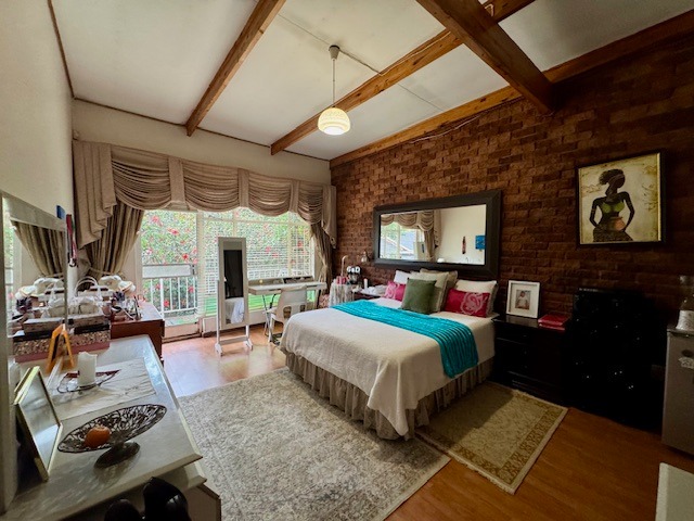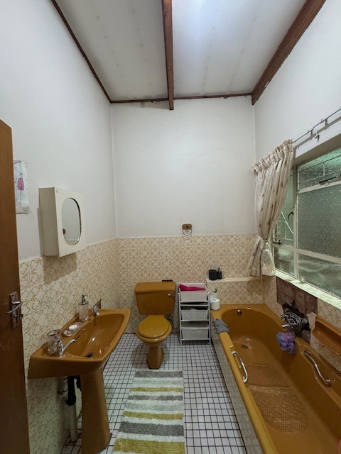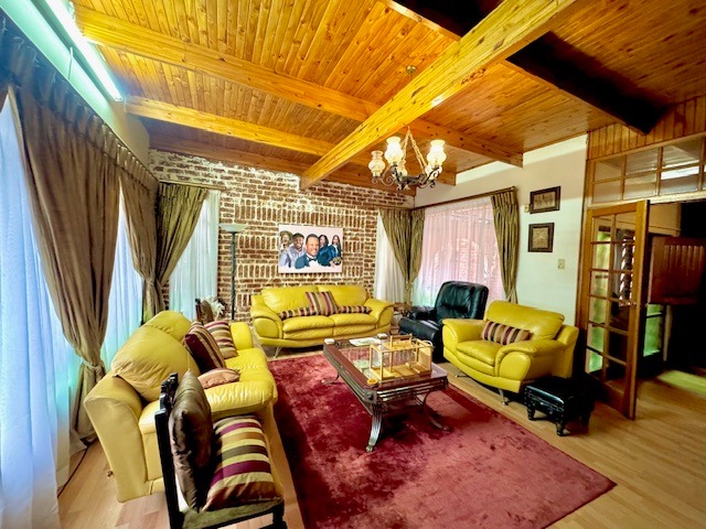 Inside, the home presents five well-proportioned bedrooms and three bathrooms, including an en-suite, catering to a large family's needs. Character elements such as exposed wooden ceiling beams and an accent brick wall add unique architectural interest to several rooms. The layout includes two lounges, a dedicated dining room, and a functional kitchen with a pantry, offering versatile living spaces for relaxation and social gatherings. While some areas retain their original charm, they also present an exciting opportunity for modern updates to truly personalize the interior.