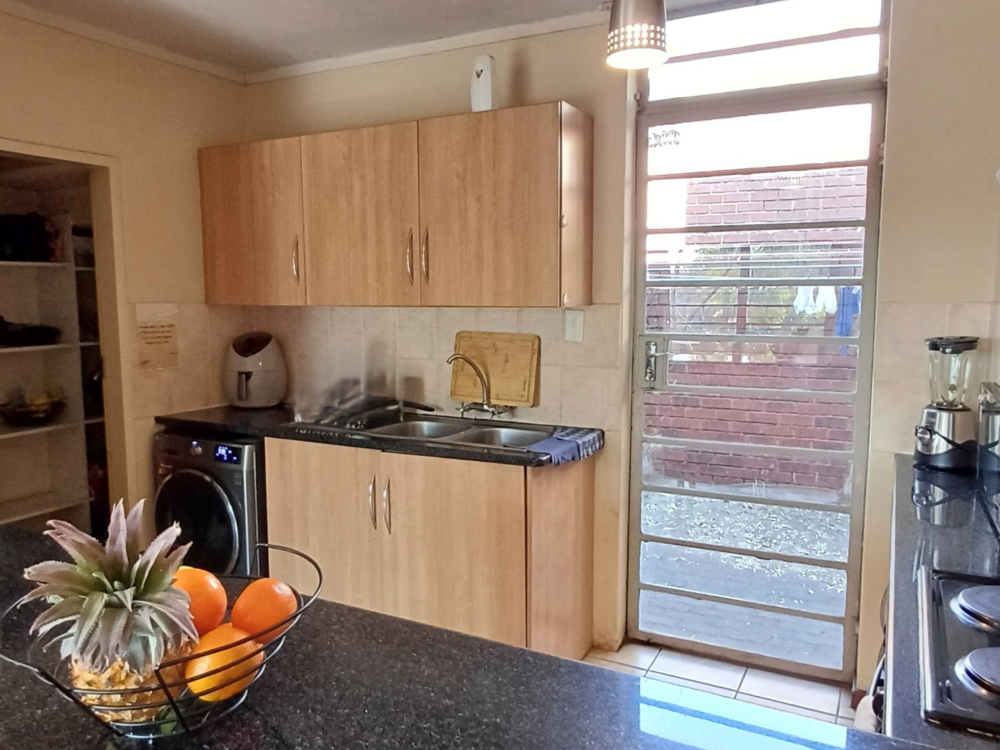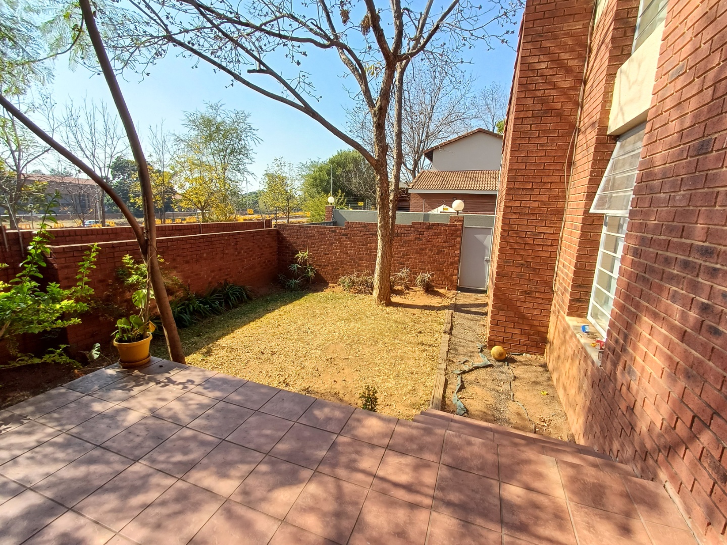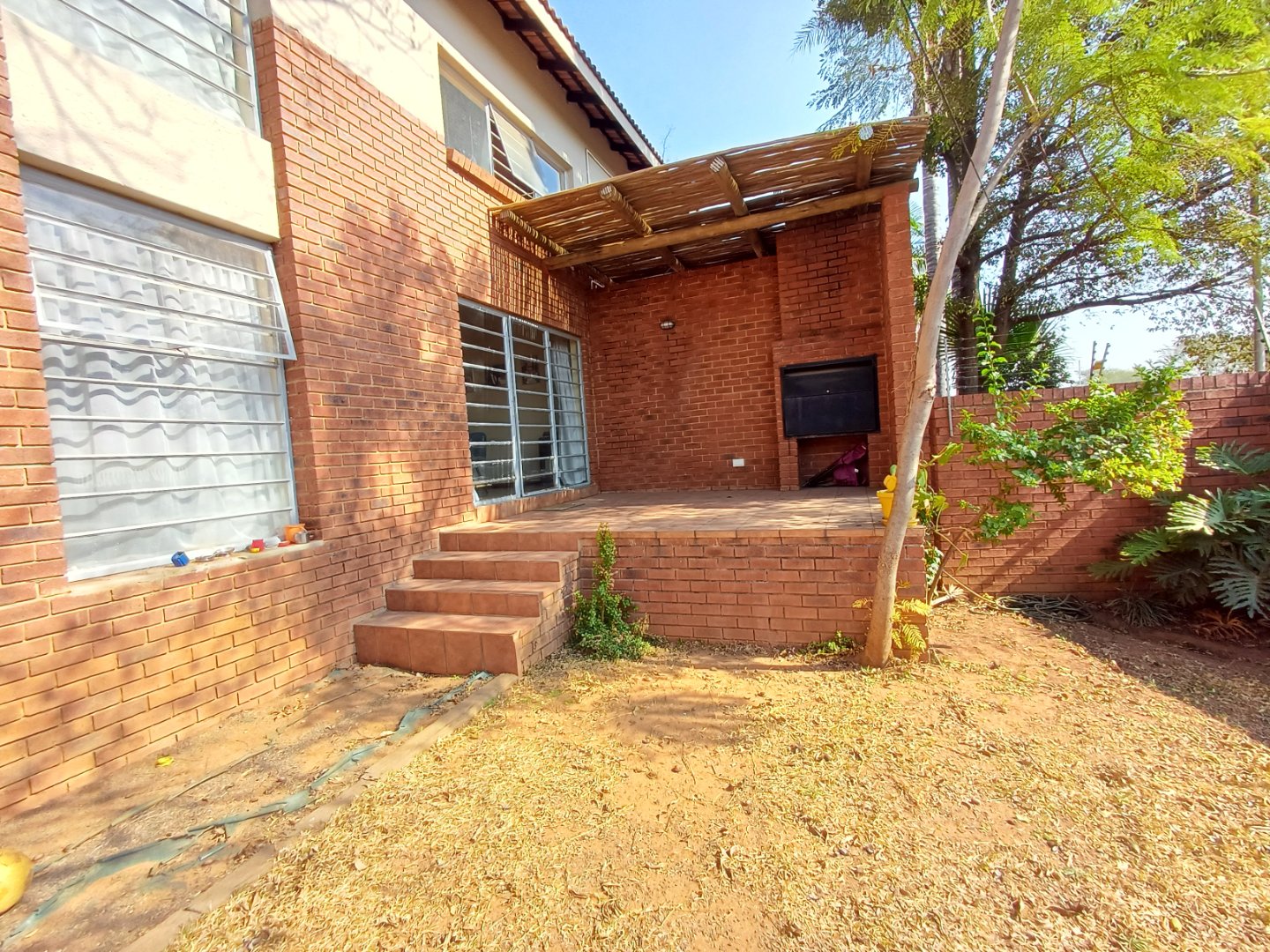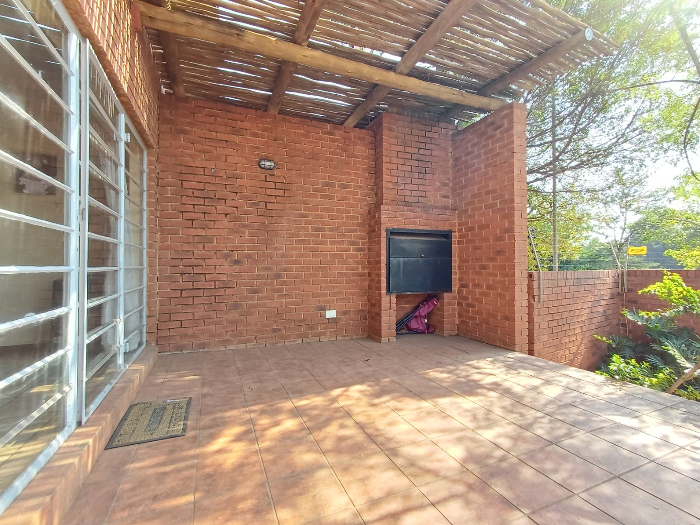 Patio with build-in braai overlooking small low maintenance garden.