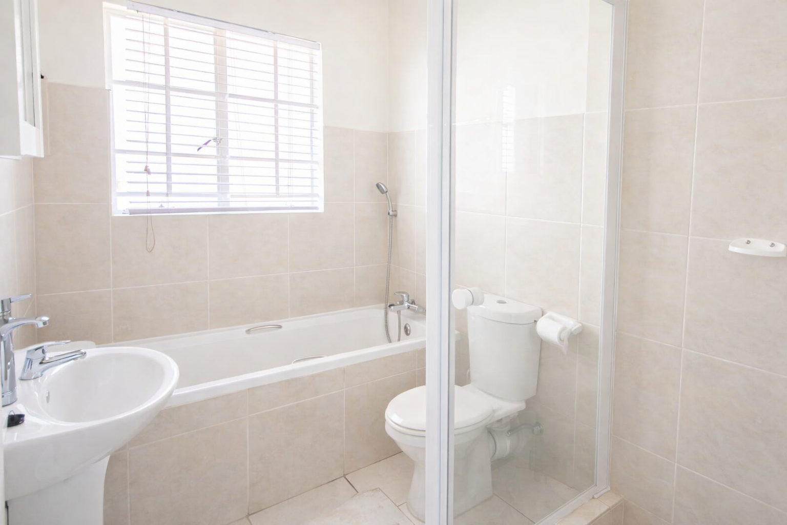 Both bedrooms are well-sized with built-in cupboards and natural light, while the full bathroom is neatly finished and includes a bath and shower, offering functionality for both families and professionals alike.