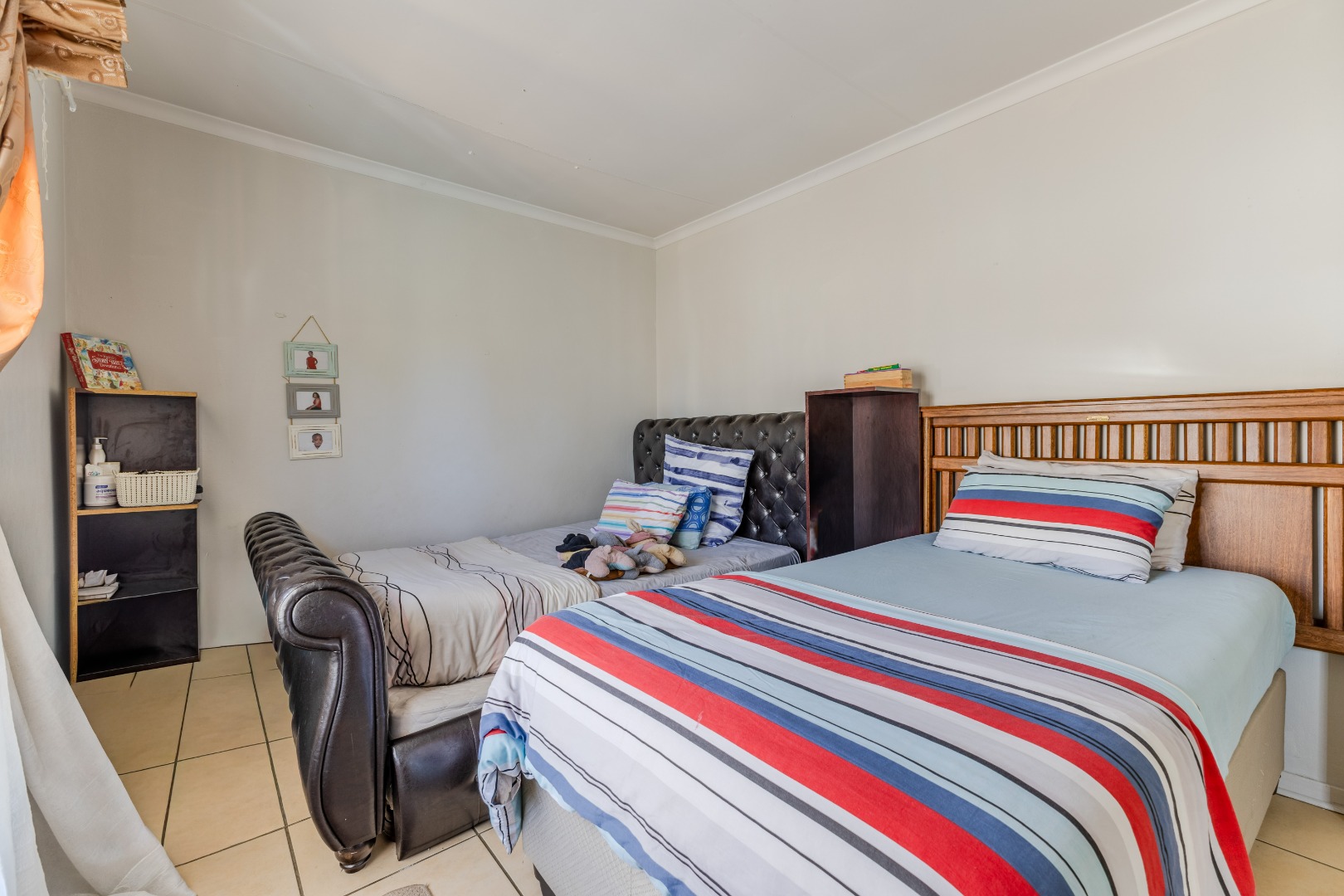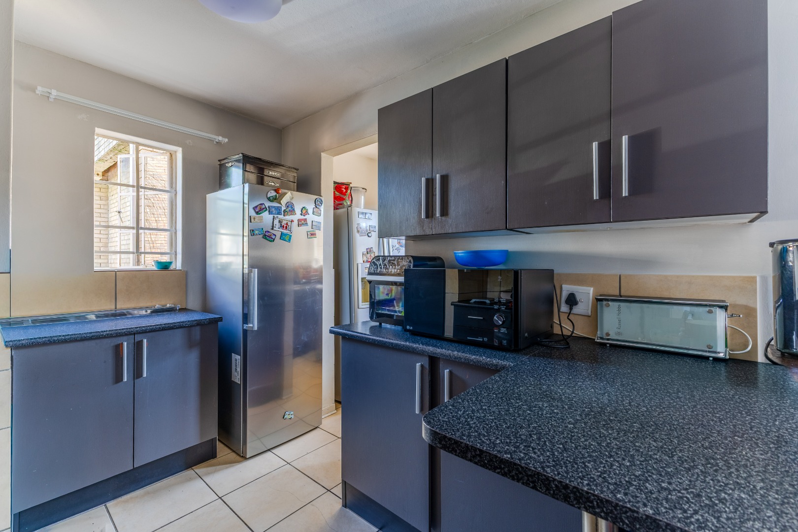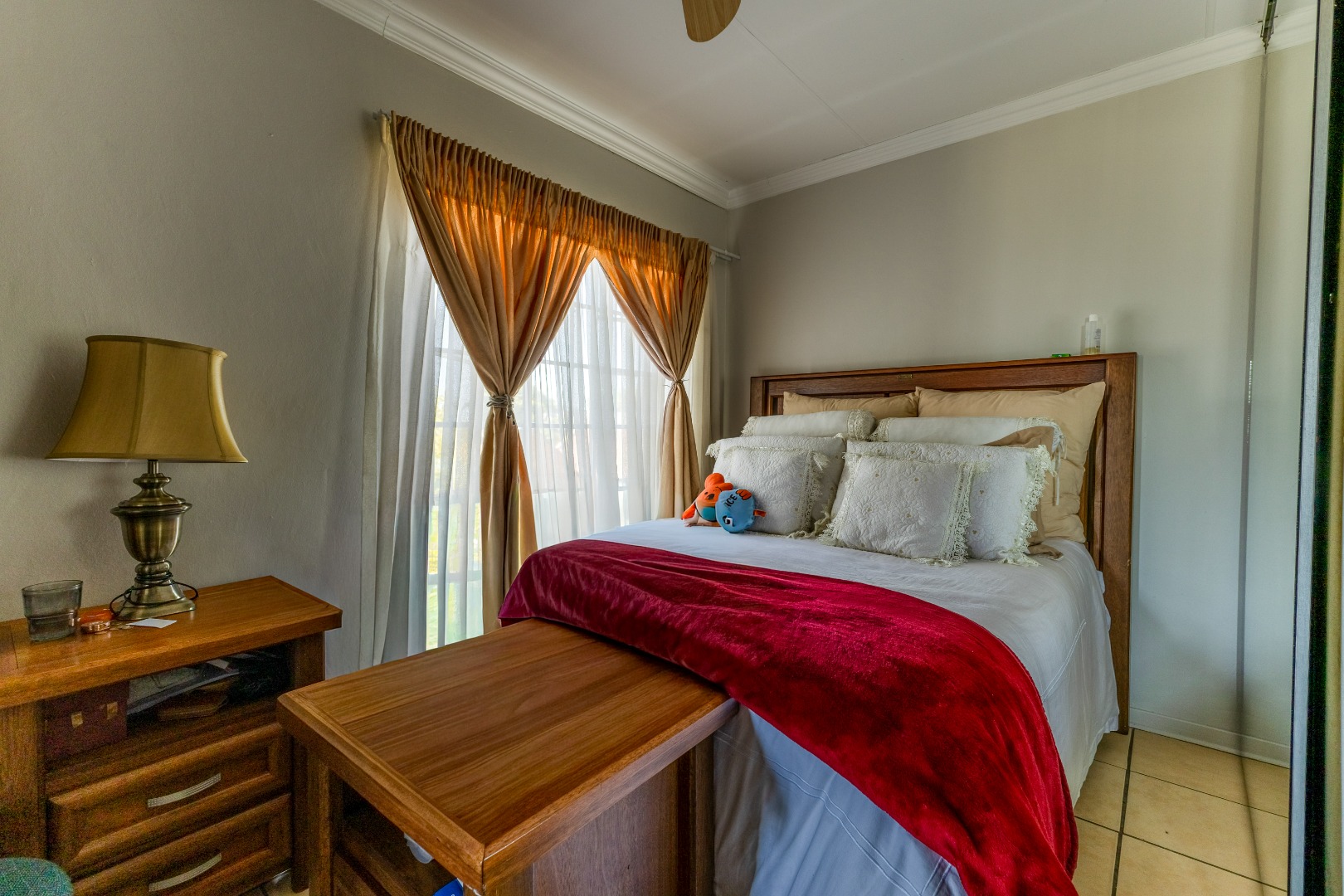 Outside, the property includes two dedicated parking spaces and features paving for a neat finish. The large sliding glass door from the dining area provides access to an outdoor space, secured with burglar bars, enhancing safety. Residents benefit from 24-hour security, an access gate, and security gates, ensuring a protected environment within this secure estate.