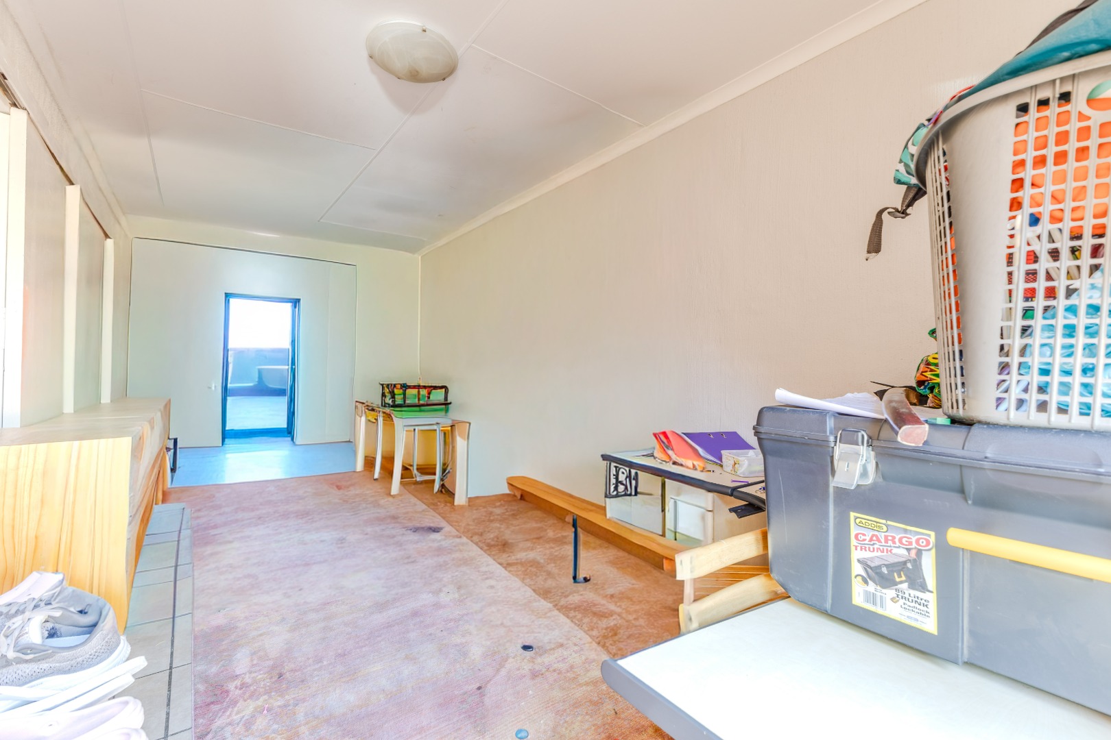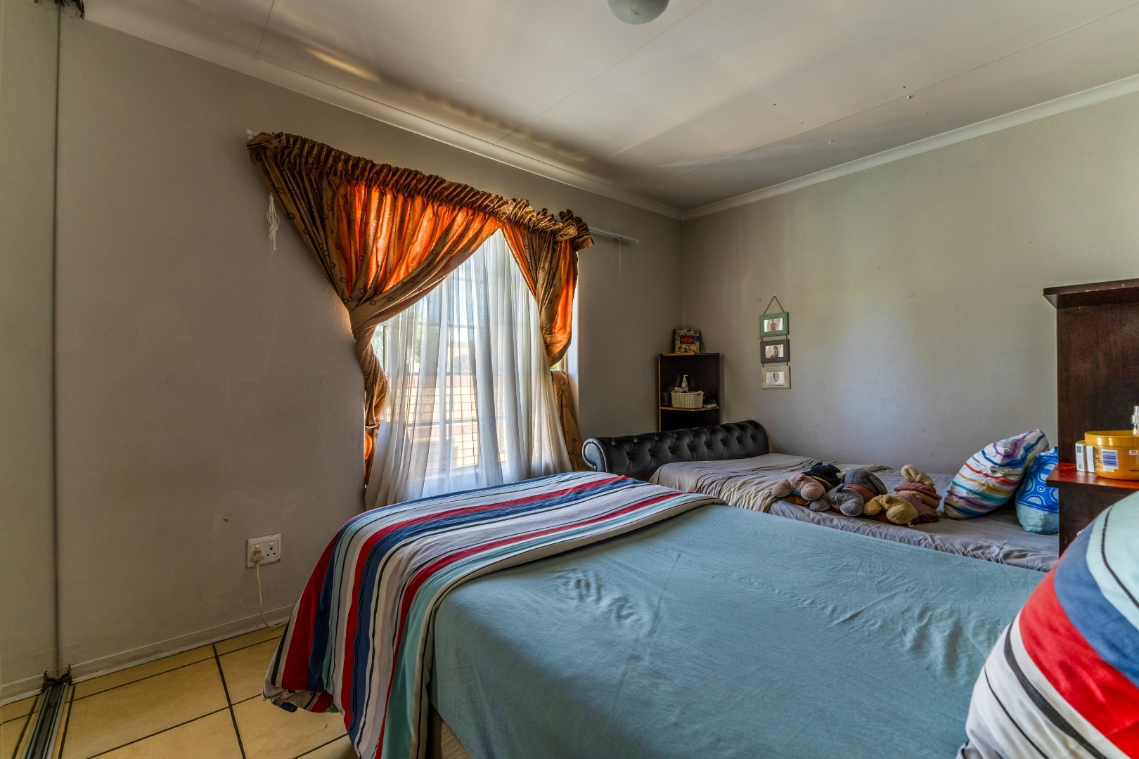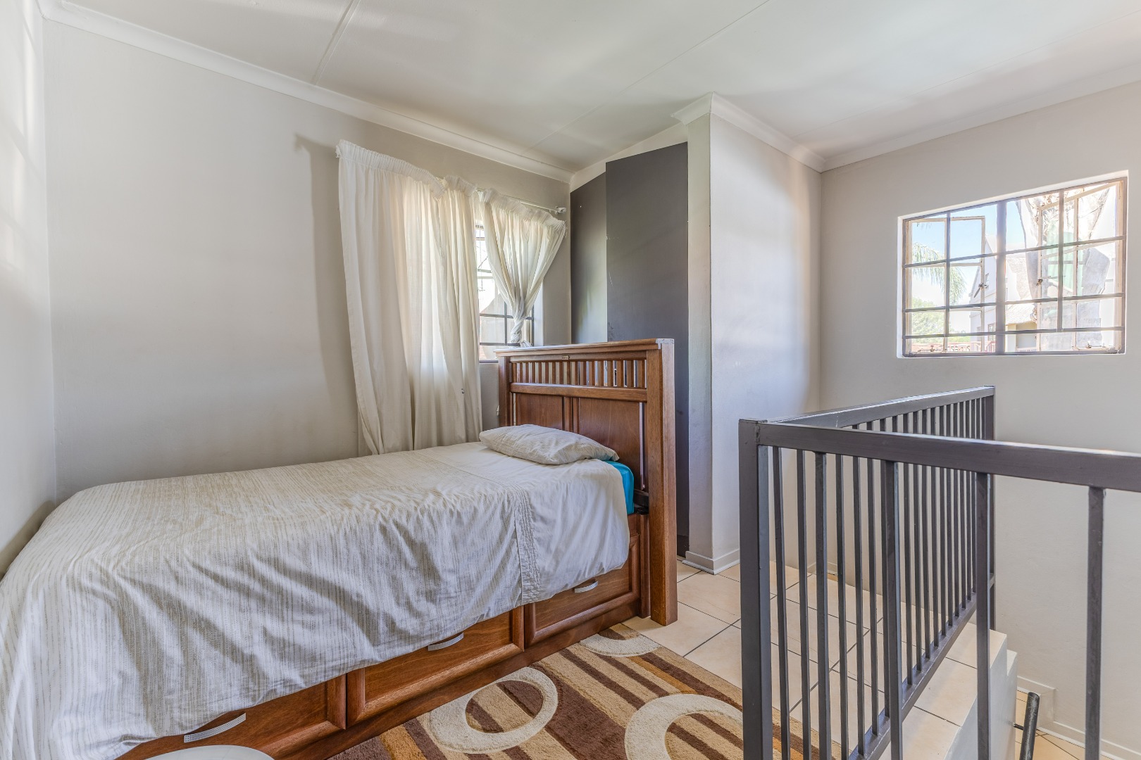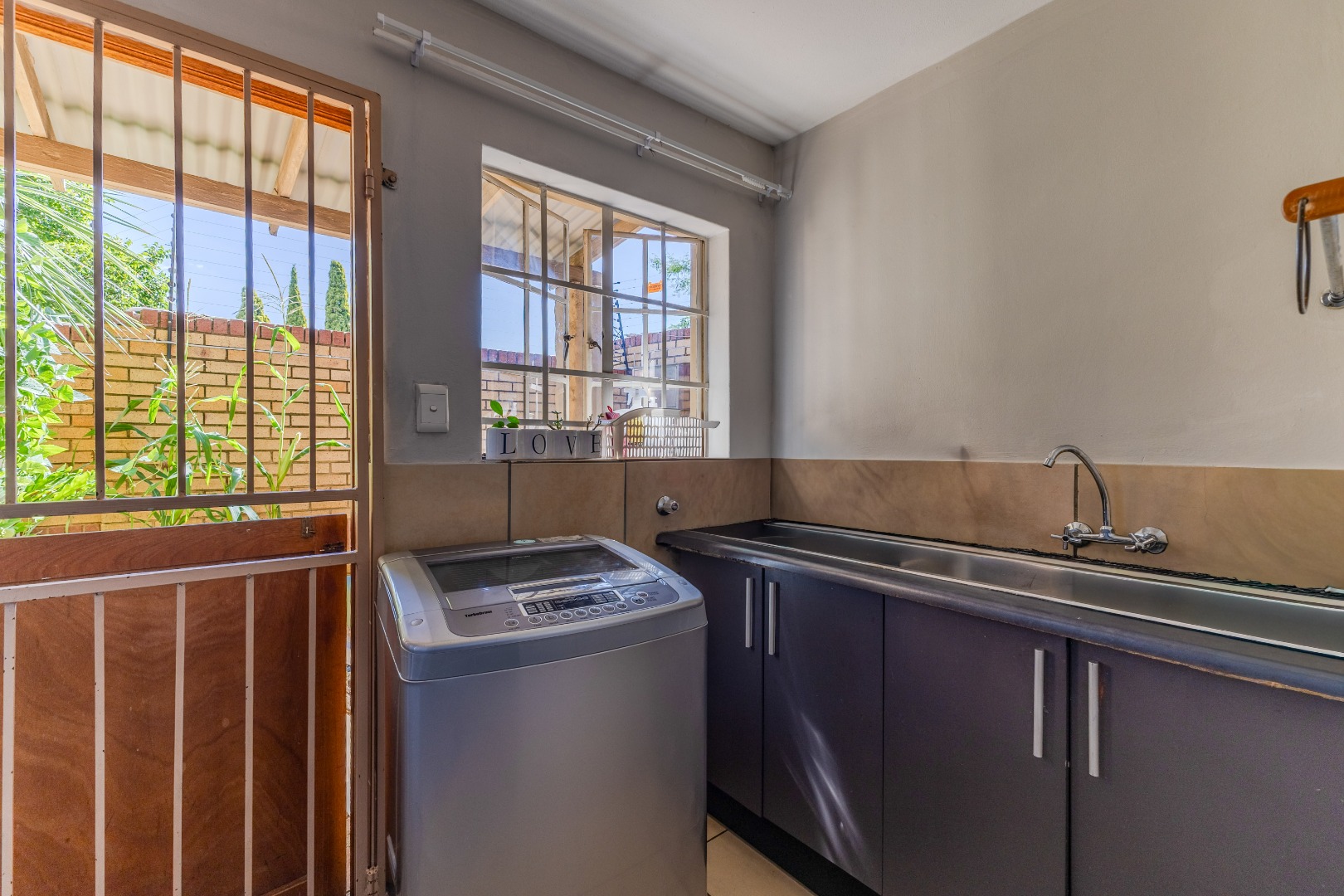 Outside, the property includes two dedicated parking spaces and features paving for a neat finish. The large sliding glass door from the dining area provides access to an outdoor space, secured with burglar bars, enhancing safety. Residents benefit from 24-hour security, an access gate, and security gates, ensuring a protected environment within this secure estate.