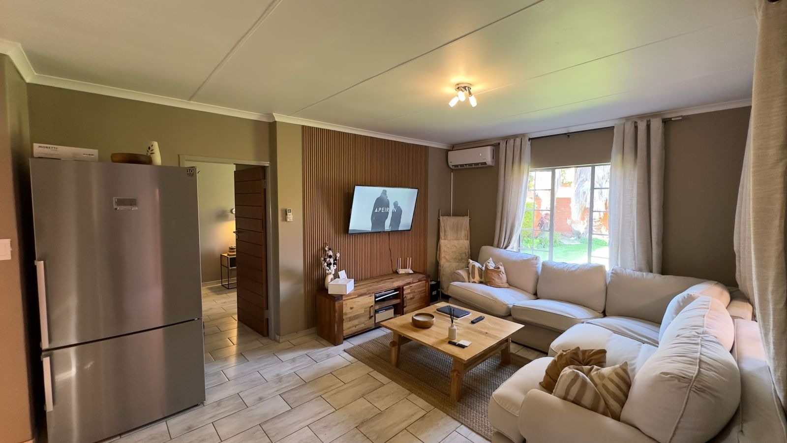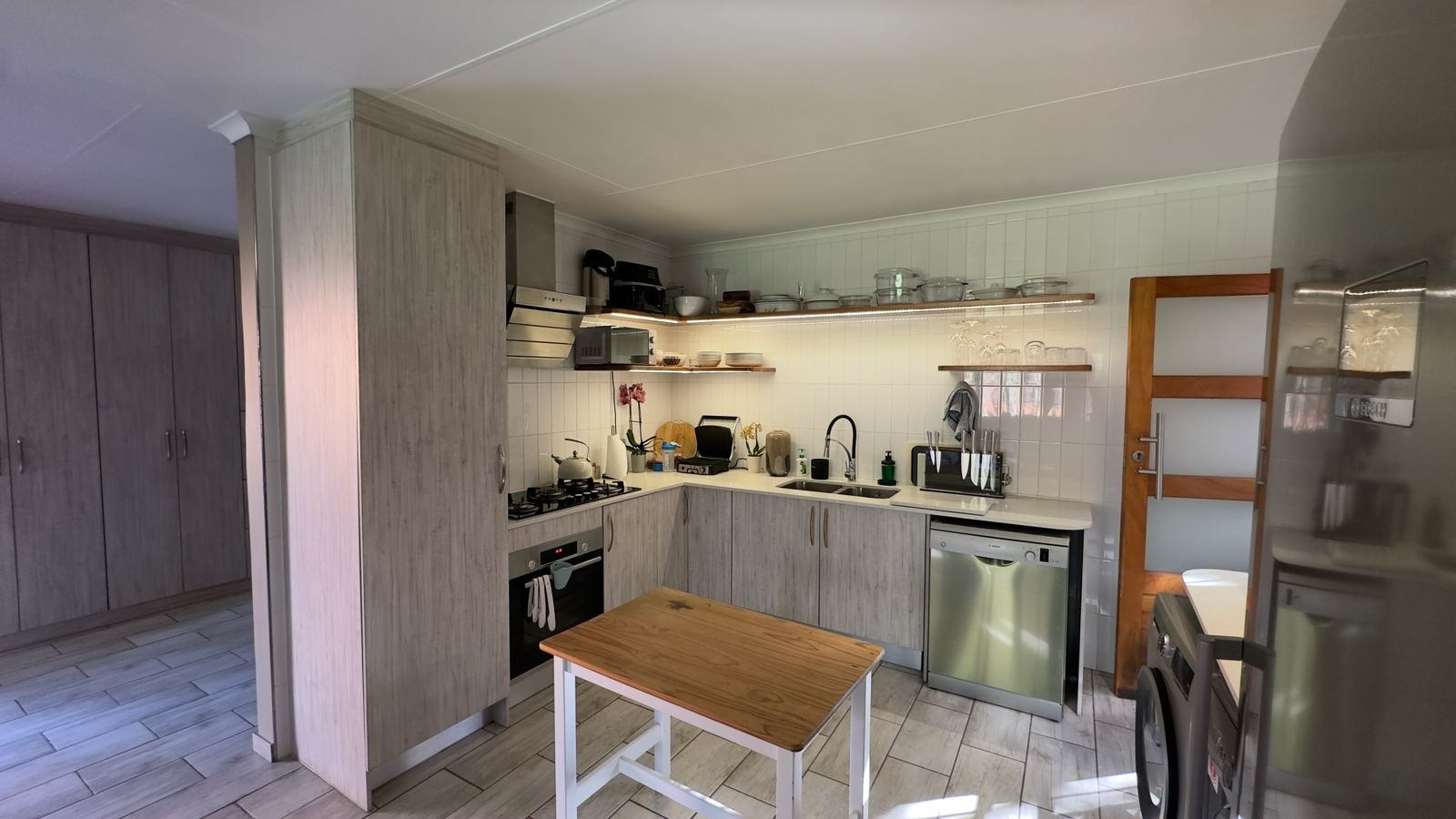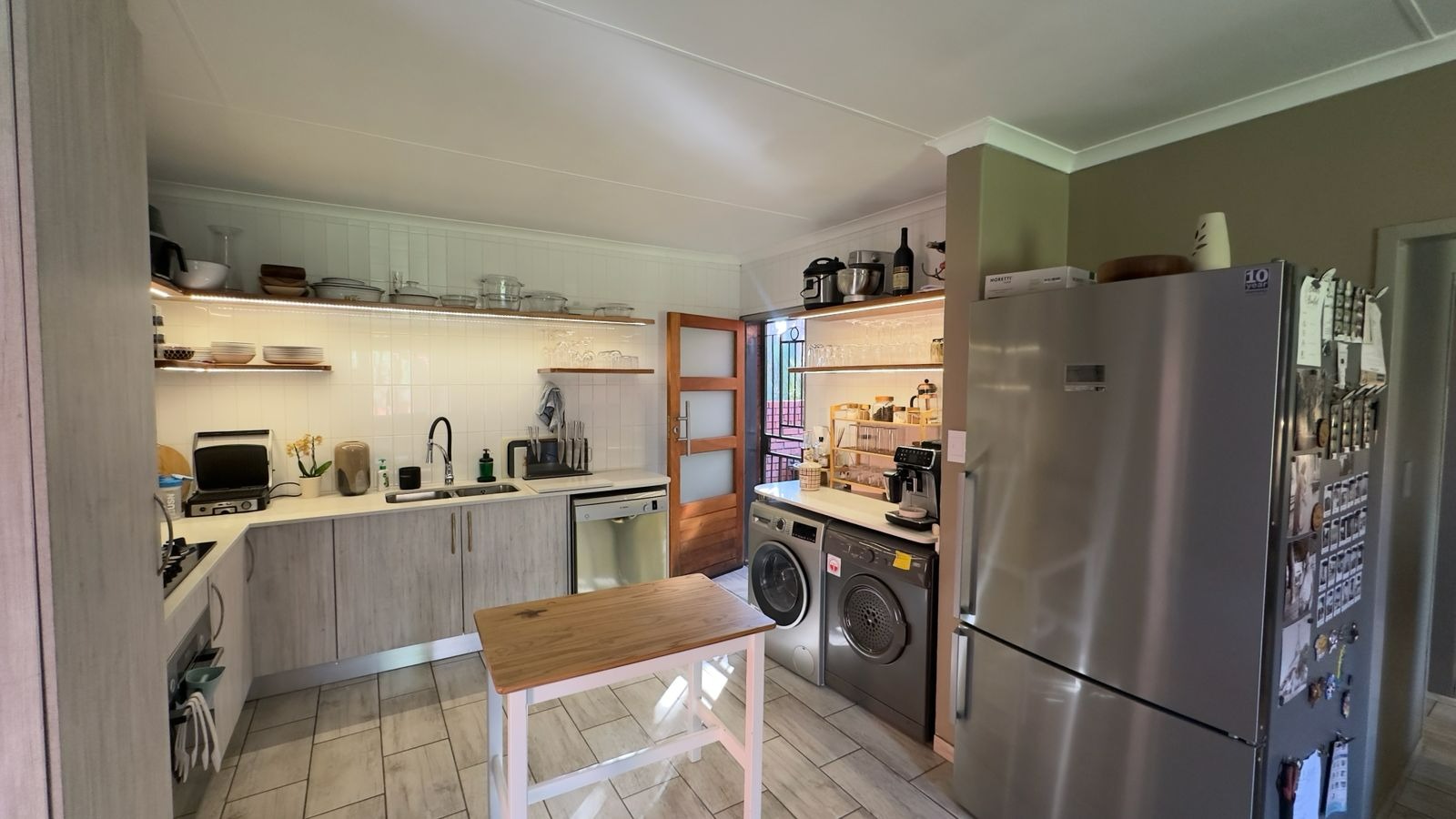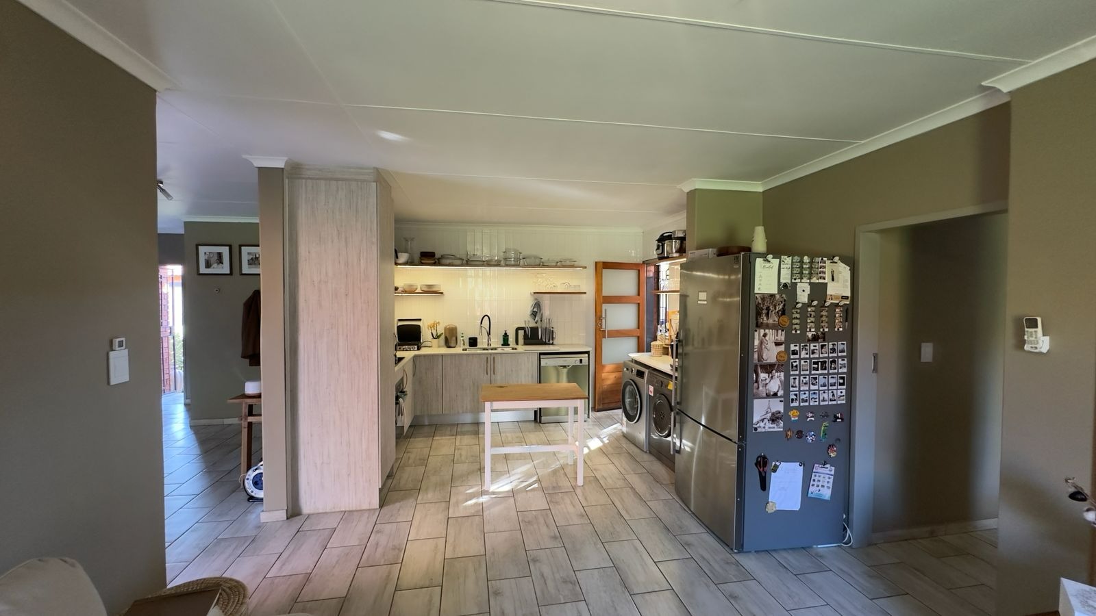 The home features a light and airy open-plan living area with contemporary finishes and sleek tiled flooring, creating a welcoming space for both everyday living and entertaining.