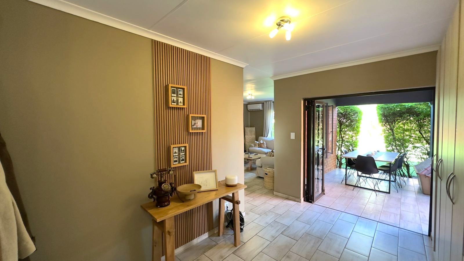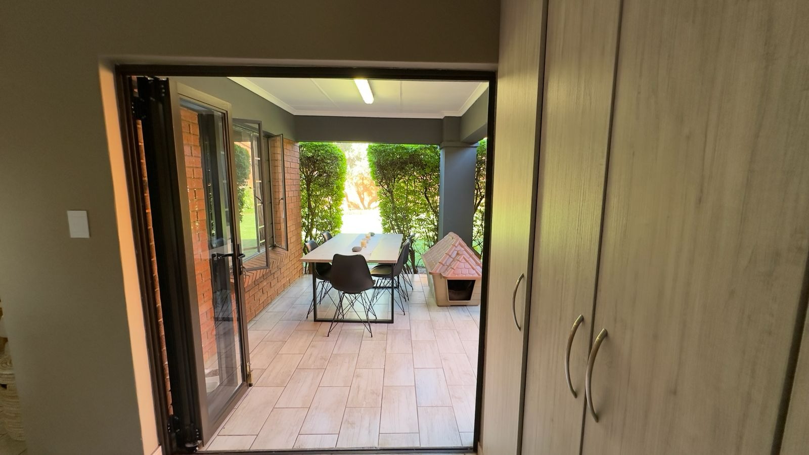 Folding doors open from the living area onto a covered patio that overlooks a large, wrap-around garden, perfect for relaxing, entertaining, or enjoying time with family and pets.