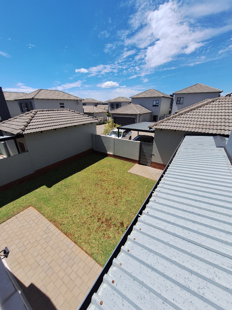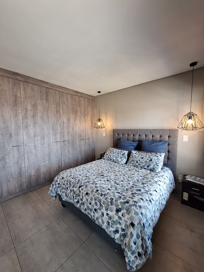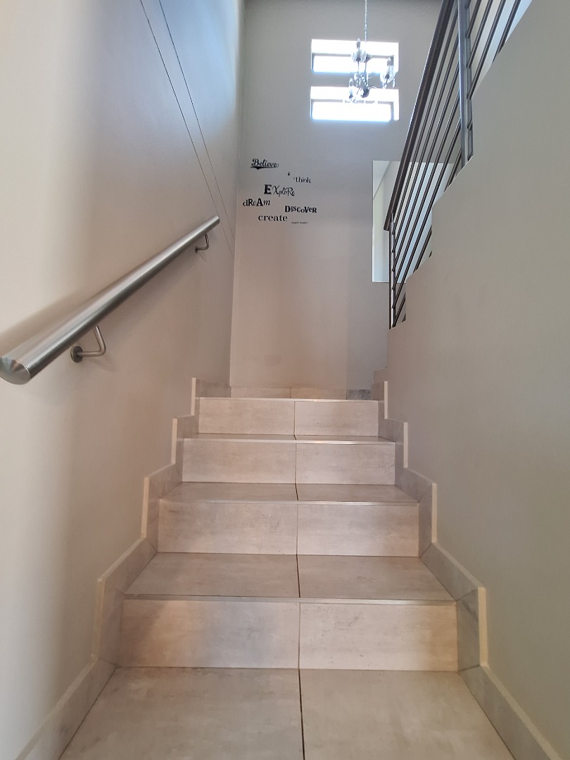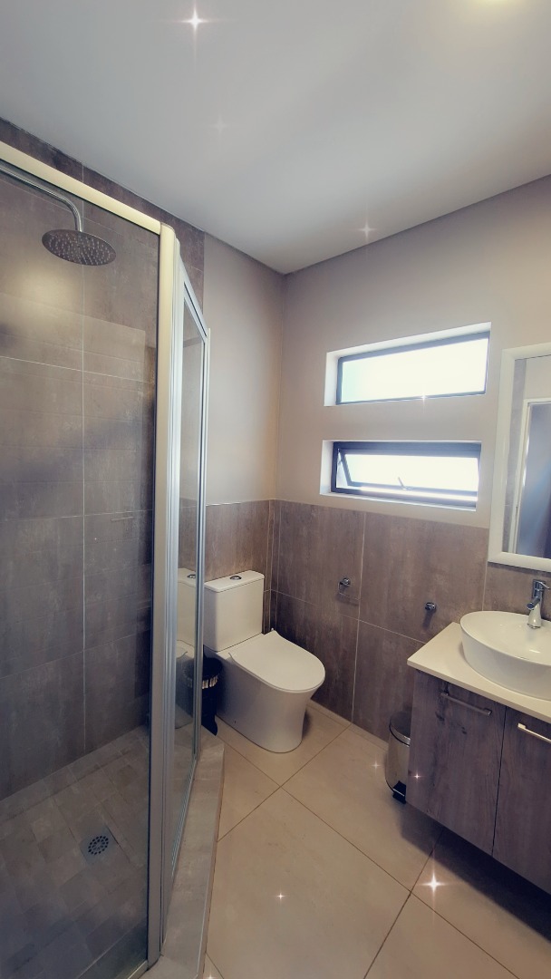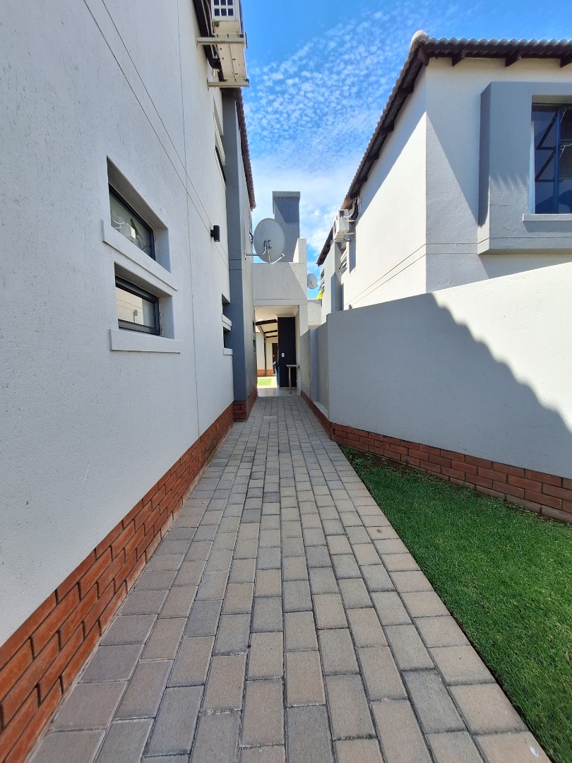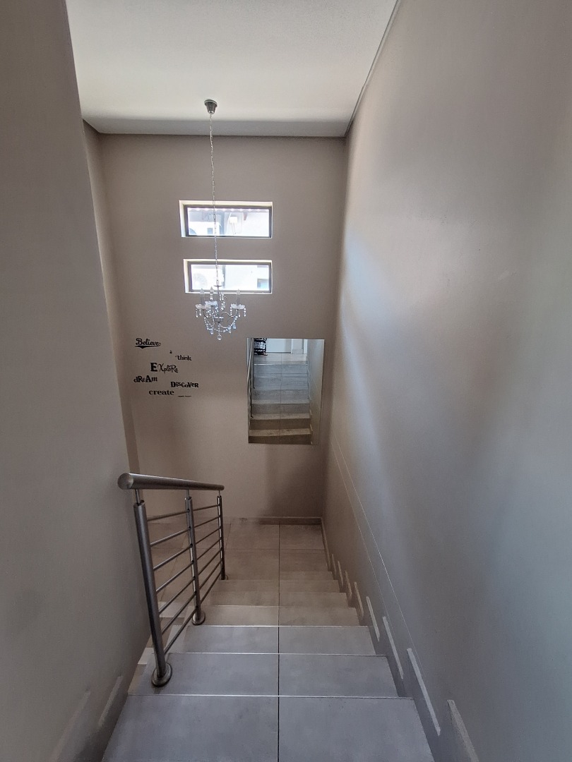 Discover an exquisite modern residence nestled within a prestigious security estate in Equestria, Pretoria. This contemporary two-story home immediately captivates with its sleek architectural lines, sophisticated grey and light grey exterior, and inviting covered patio and upper-level balcony, offering refined outdoor living. Paved walkways elegantly frame the property, leading to a private garden that promises serene moments. Step inside to a world of seamless design, where an open-plan layout effortlessly connects the living and kitchen areas. Abundant natural light bathes the interiors, highlighting contemporary ceiling design with recessed lighting and a stylish pendant fixture. Durable tiled flooring extends throughout, creating a cohesive aesthetic. The heart of this home is its modern kitchen, a culinary haven featuring bespoke two-tone cabinetry in rich wood-grain and high-gloss white, complemented by integrated stainless steel appliances. A generous kitchen island serves as both a practical workspace and a chic breakfast bar. A dedicated utility room offers convenience with a modern washing machine and ample counter space. Ascend the elegant staircase, boasting light-colored tile steps and sleek stainless steel handrails, to discover three well-appointed bedrooms. The residence offers two luxurious bathrooms, including a private en-suite, alongside a convenient guest toilet. Each bathroom exudes a modern, clean aesthetic with neutral palettes, high-set windows ensuring natural light and privacy, and contemporary fixtures that elevate daily routines. Beyond the interiors, this secure estate provides an unparalleled lifestyle. Enjoy the tranquility of your private garden or entertain guests on the covered patio. With a single garage and an additional parking space, convenience is paramount. The estate benefits from 24-hour security, a dedicated security post, and access gates, ensuring peace of mind. Furthermore, the property is fibre-ready, catering to modern connectivity, and welcomes pets, making it an ideal family sanctuary. **Key Features:** * Three Luxurious Bedrooms * Two Modern Bathrooms (One En-suite) * Open-Plan Living & Contemporary Kitchen * Private Balcony & Covered Patio * Secure Estate with 24-Hour Security * Fibre Connectivity * Pet-Friendly Garden * Single Garage & Additional Parking