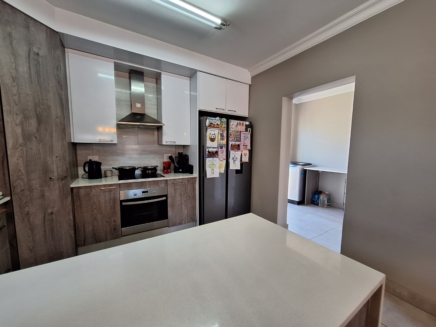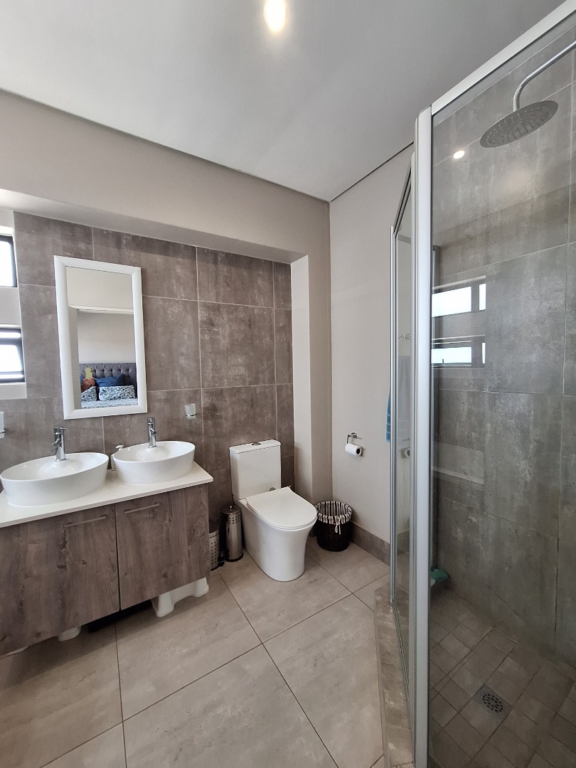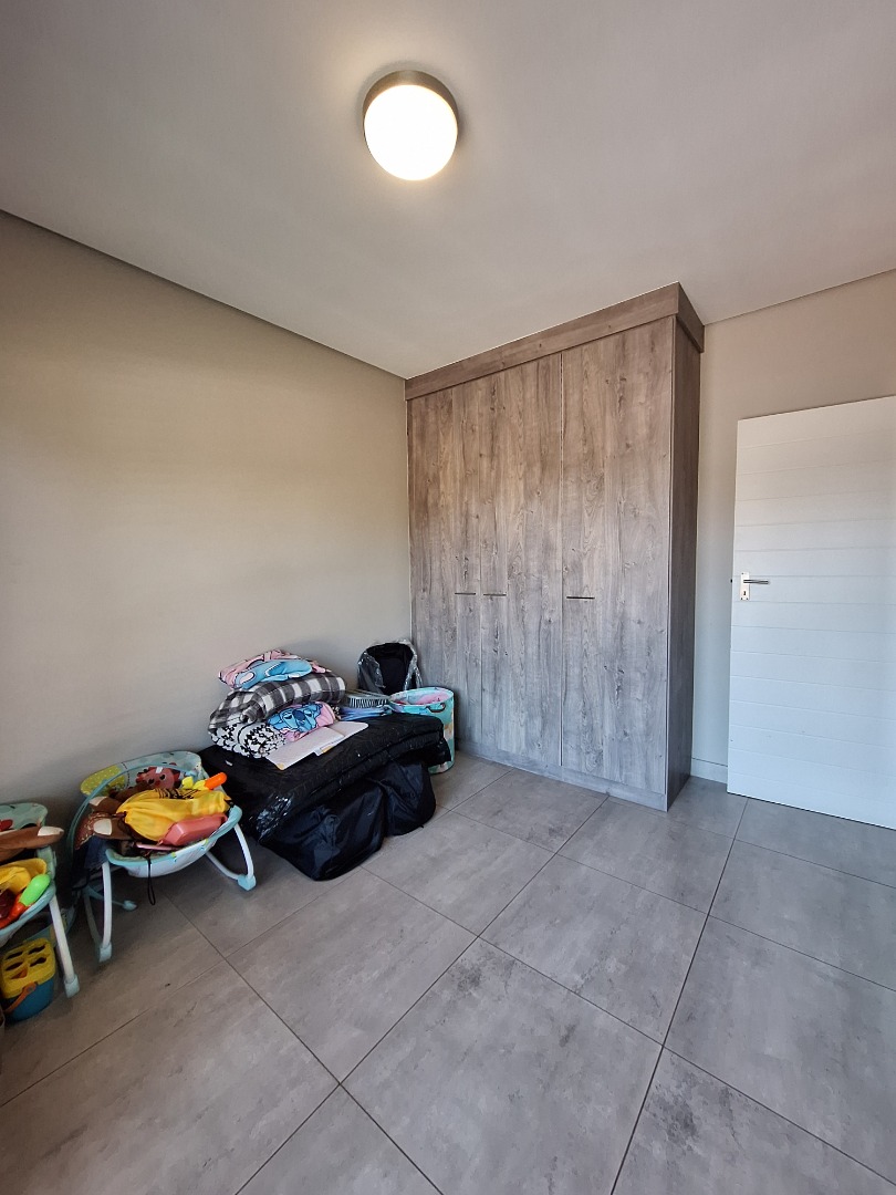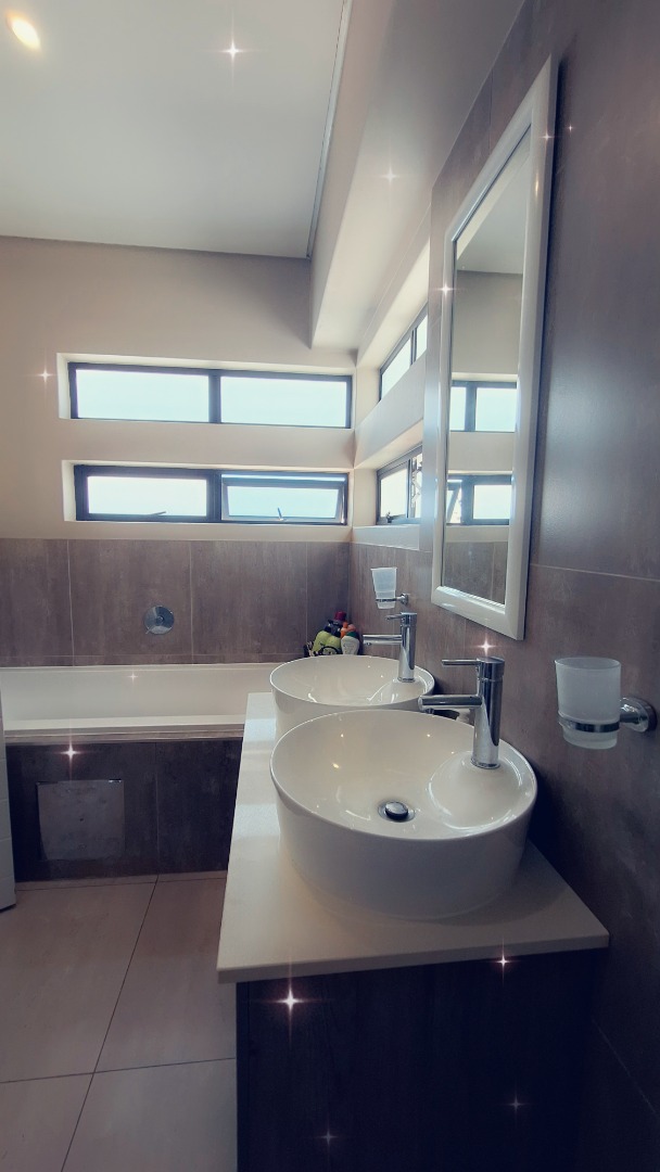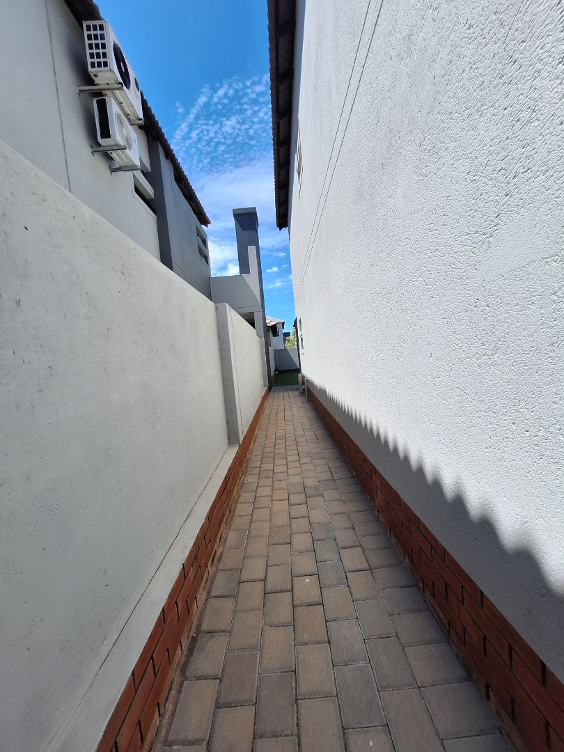Discover an exquisite modern residence nestled within a prestigious security estate in Equestria, Pretoria. This contemporary two-story home immediately captivates with its sleek architectural lines, sophisticated grey and light grey exterior, and inviting covered patio and upper-level balcony, offering refined outdoor living. Paved walkways elegantly frame the property, leading to a private garden that promises serene moments. Step inside to a world of seamless design, where an open-plan layout effortlessly connects the living and kitchen areas. Abundant natural light bathes the interiors, highlighting contemporary ceiling design with recessed lighting and a stylish pendant fixture. Durable tiled flooring extends throughout, creating a cohesive aesthetic. The heart of this home is its modern kitchen, a culinary haven featuring bespoke two-tone cabinetry in rich wood-grain and high-gloss white, complemented by integrated stainless steel appliances. A generous kitchen island serves as both a practical workspace and a chic breakfast bar. A dedicated utility room offers convenience with a modern washing machine and ample counter space. Ascend the elegant staircase, boasting light-colored tile steps and sleek stainless steel handrails, to discover three well-appointed bedrooms. The residence offers two luxurious bathrooms, including a private en-suite, alongside a convenient guest toilet. Each bathroom exudes a modern, clean aesthetic with neutral palettes, high-set windows ensuring natural light and privacy, and contemporary fixtures that elevate daily routines. Beyond the interiors, this secure estate provides an unparalleled lifestyle. Enjoy the tranquility of your private garden or entertain guests on the covered patio. With a single garage and an additional parking space, convenience is paramount. The estate benefits from 24-hour security, a dedicated security post, and access gates, ensuring peace of mind. Furthermore, the property is fibre-ready, catering to modern connectivity, and welcomes pets, making it an ideal family sanctuary. **Key Features:** * Three Luxurious Bedrooms * Two Modern Bathrooms (One En-suite) * Open-Plan Living & Contemporary Kitchen * Private Balcony & Covered Patio * Secure Estate with 24-Hour Security * Fibre Connectivity * Pet-Friendly Garden * Single Garage & Additional Parking
