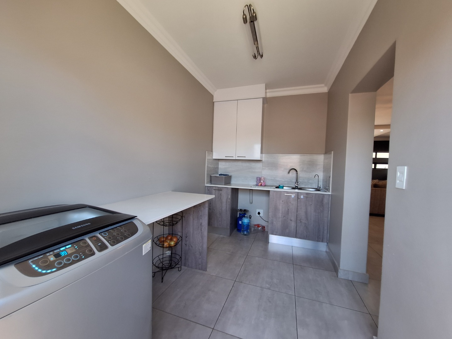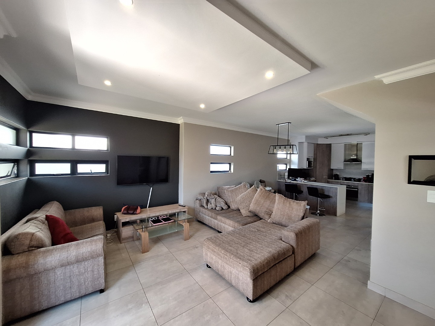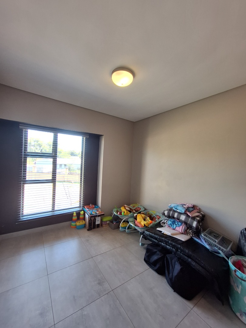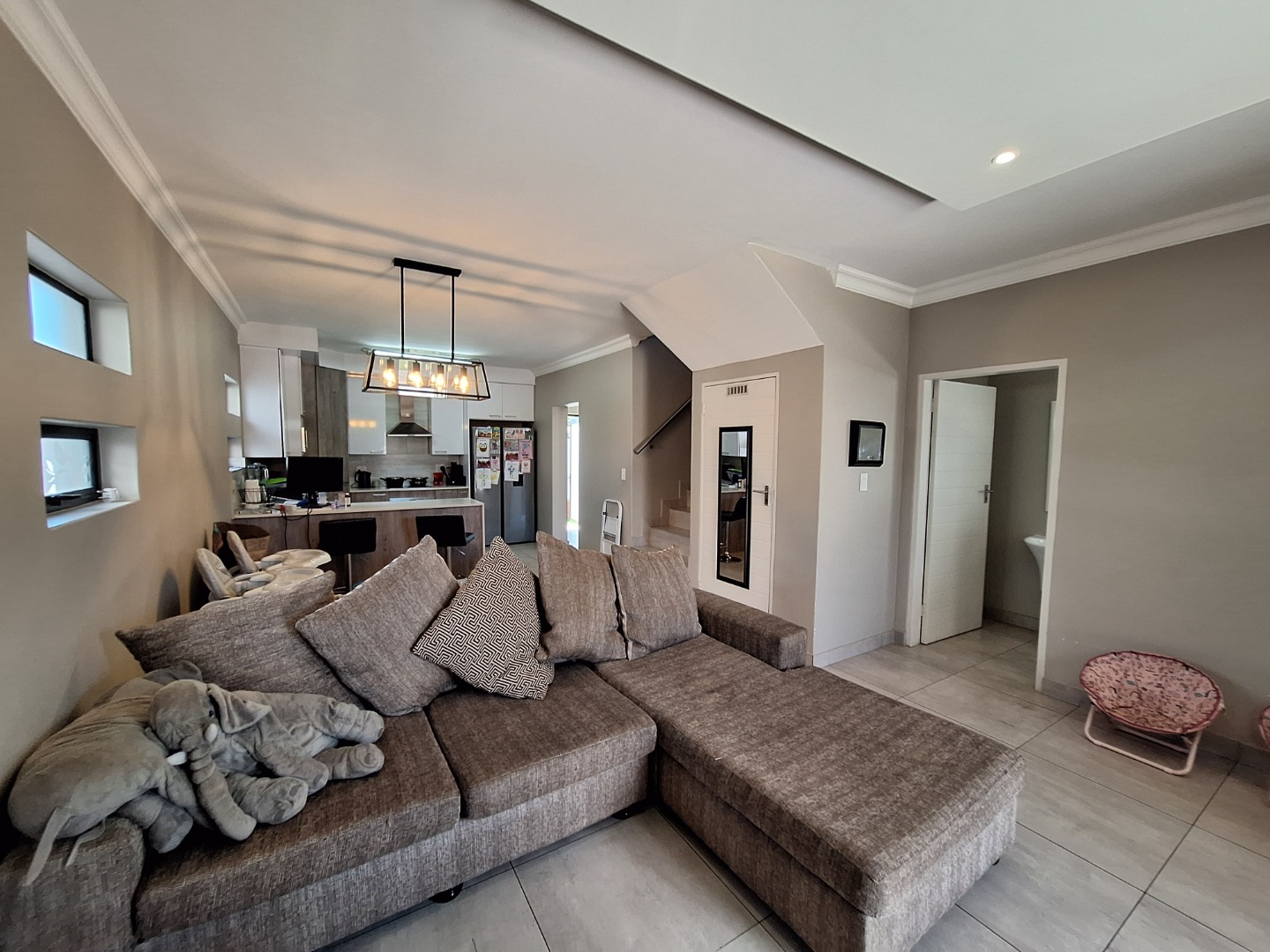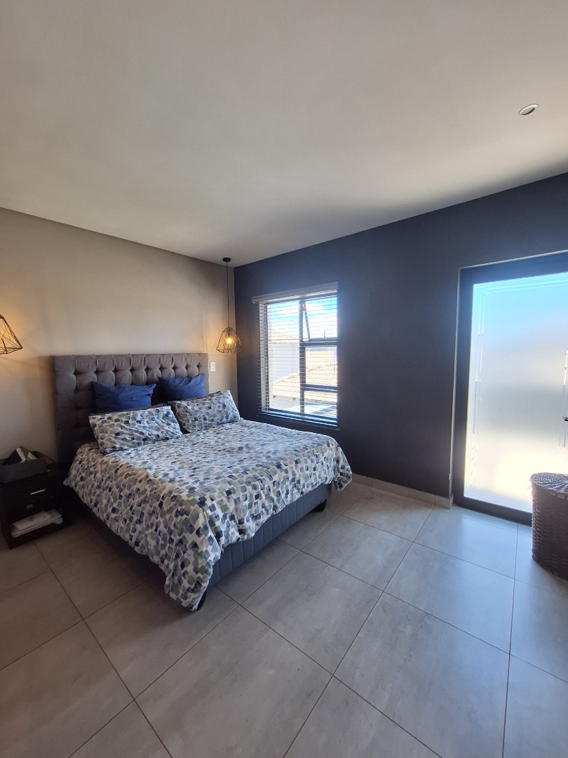 Discover an exquisite modern residence nestled within a prestigious security estate in Equestria, Pretoria. This contemporary two-story home immediately captivates with its sleek architectural lines, sophisticated grey and light grey exterior, and inviting covered patio and upper-level balcony, offering refined outdoor living. Paved walkways elegantly frame the property, leading to a private garden that promises serene moments. Step inside to a world of seamless design, where an open-plan layout effortlessly connects the living and kitchen areas. Abundant natural light bathes the interiors, highlighting contemporary ceiling design with recessed lighting and a stylish pendant fixture. Durable tiled flooring extends throughout, creating a cohesive aesthetic. The heart of this home is its modern kitchen, a culinary haven featuring bespoke two-tone cabinetry in rich wood-grain and high-gloss white, complemented by integrated stainless steel appliances. A generous kitchen island serves as both a practical workspace and a chic breakfast bar. A dedicated utility room offers convenience with a modern washing machine and ample counter space. Ascend the elegant staircase, boasting light-colored tile steps and sleek stainless steel handrails, to discover three well-appointed bedrooms. The residence offers two luxurious bathrooms, including a private en-suite, alongside a convenient guest toilet. Each bathroom exudes a modern, clean aesthetic with neutral palettes, high-set windows ensuring natural light and privacy, and contemporary fixtures that elevate daily routines. Beyond the interiors, this secure estate provides an unparalleled lifestyle. Enjoy the tranquility of your private garden or entertain guests on the covered patio. With a single garage and an additional parking space, convenience is paramount. The estate benefits from 24-hour security, a dedicated security post, and access gates, ensuring peace of mind. Furthermore, the property is fibre-ready, catering to modern connectivity, and welcomes pets, making it an ideal family sanctuary. **Key Features:** * Three Luxurious Bedrooms * Two Modern Bathrooms (One En-suite) * Open-Plan Living & Contemporary Kitchen * Private Balcony & Covered Patio * Secure Estate with 24-Hour Security * Fibre Connectivity * Pet-Friendly Garden * Single Garage & Additional Parking