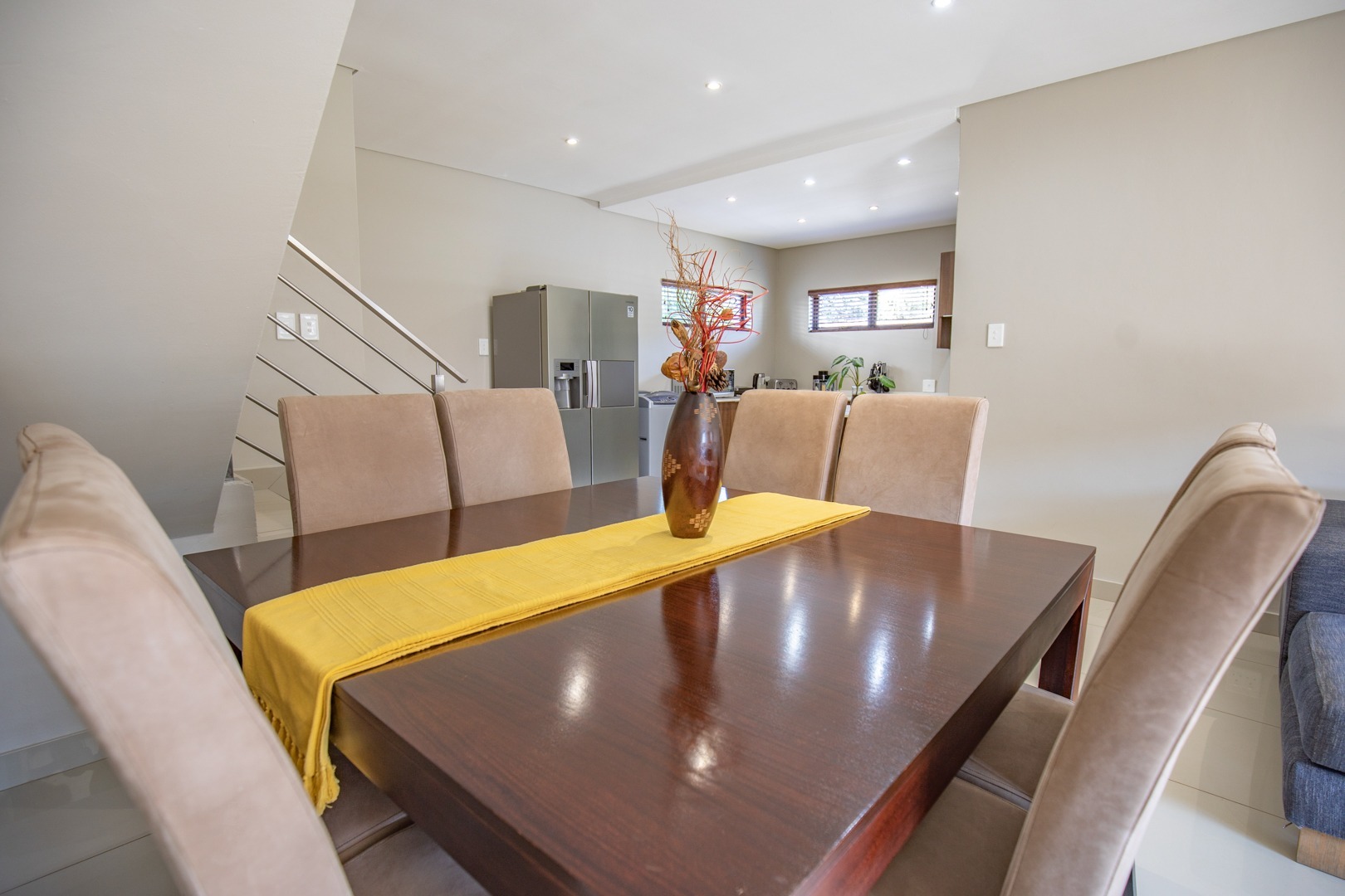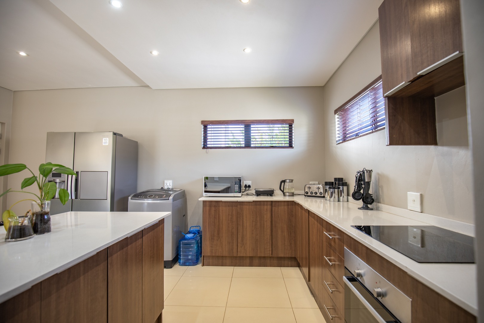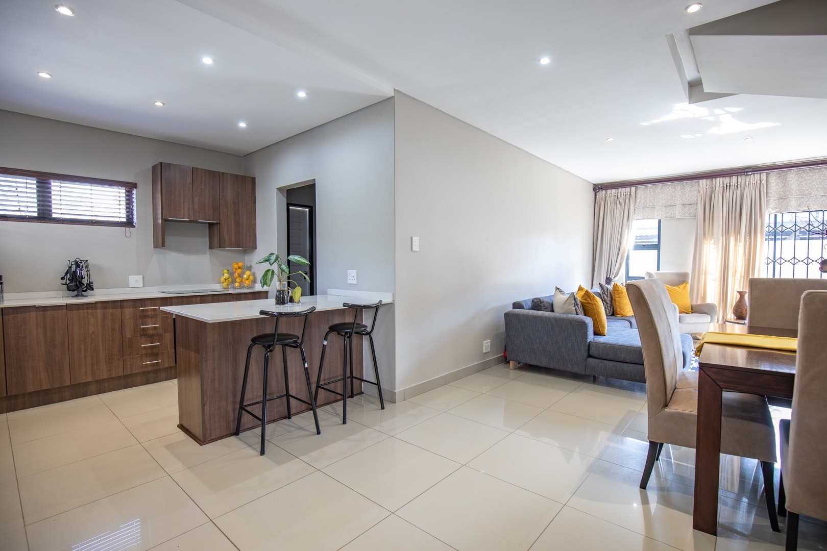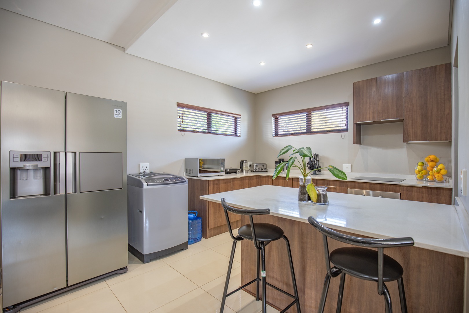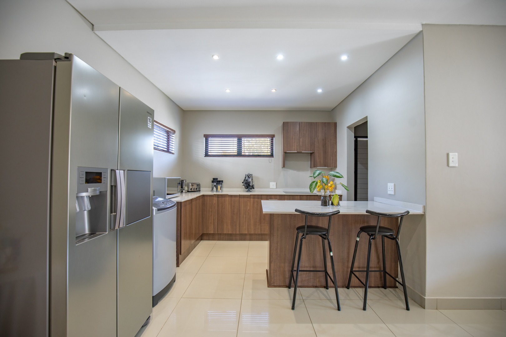 The modern kitchen is fitted with quality finishes, ample cupboard space, and a separate scullery with space for two under-counter appliances, adding both convenience and practicality. The master bedroom includes an en-suite for added comfort.