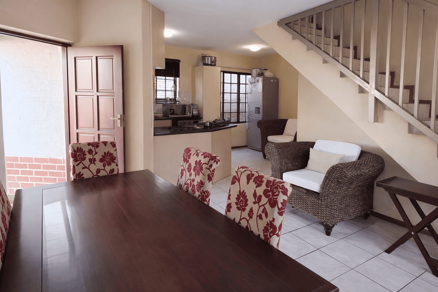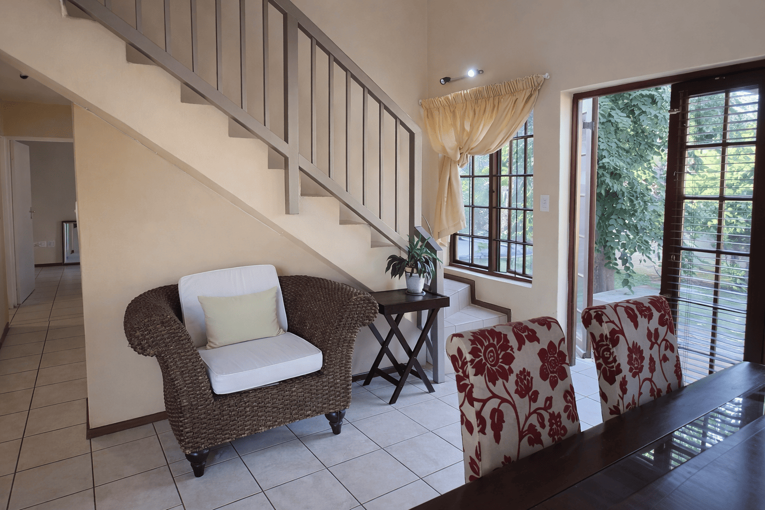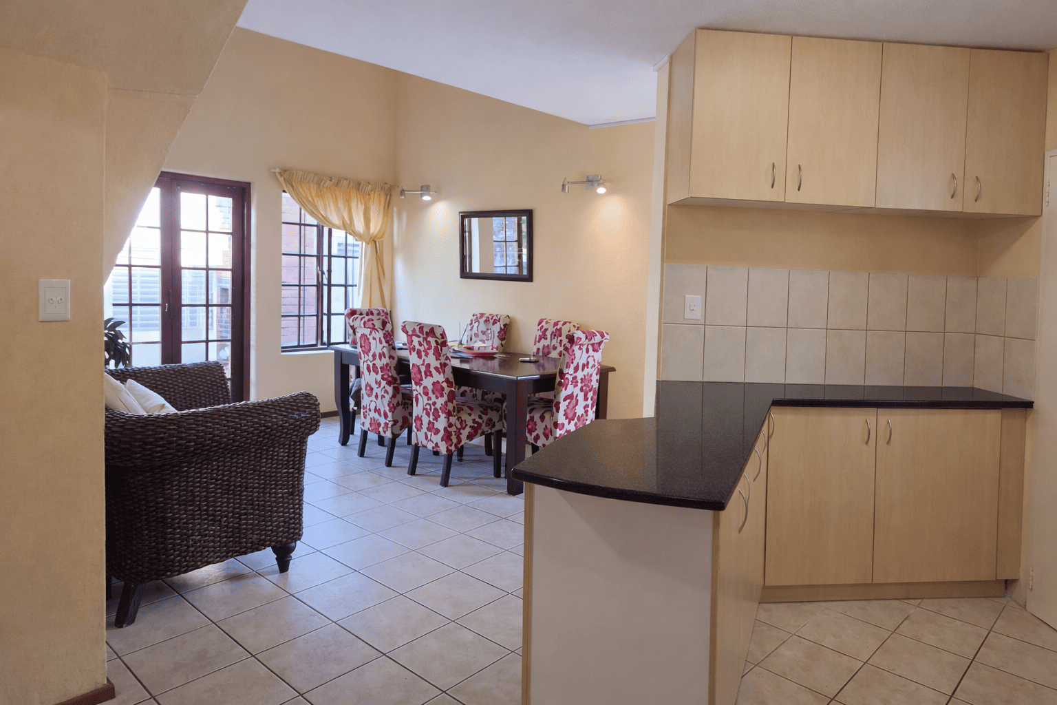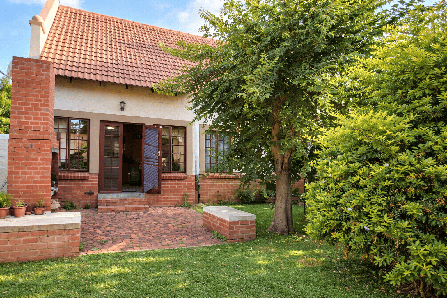 This charming detached unit in Pretoria boasts inviting kerb appeal with its traditional red tiled roof and private brick patio. French doors open to a well-maintained grassy yard featuring mature trees and a built-in braai area, ideal for outdoor entertaining. Two garages provide secure parking. Step inside to a bright, open-plan layout seamlessly connecting the kitchen, dining, and living areas. Abundant natural light fills the space through large windows and glass doors. The functional kitchen is equipped with light wood cabinetry, dark granite countertops, tiled backsplash, and an integrated washing machine. Durable tiled flooring extends throughout the home, complemented by a prominent staircase. The residence offers three comfortable bedrooms and two bathrooms, including a convenient en-suite. Bedrooms are well-lit, with some featuring charming sloped ceilings and ample built-in storage. Situated within a secure complex in Equestria, residents benefit from 24-hour security, electric fencing, and a security gate, ensuring peace of mind. Fibre-ready connectivity is also available. This sought-after suburb is known for its family-friendly environment and convenient access to amenities. Key Features: * 3 Bedrooms, 2 Bathrooms (1 en-suite) * Open-plan living, dining, and kitchen * Private garden with built-in braai * Secure complex with 24-hour security * Two garages * Fibre-ready connectivity * Tiled flooring throughout