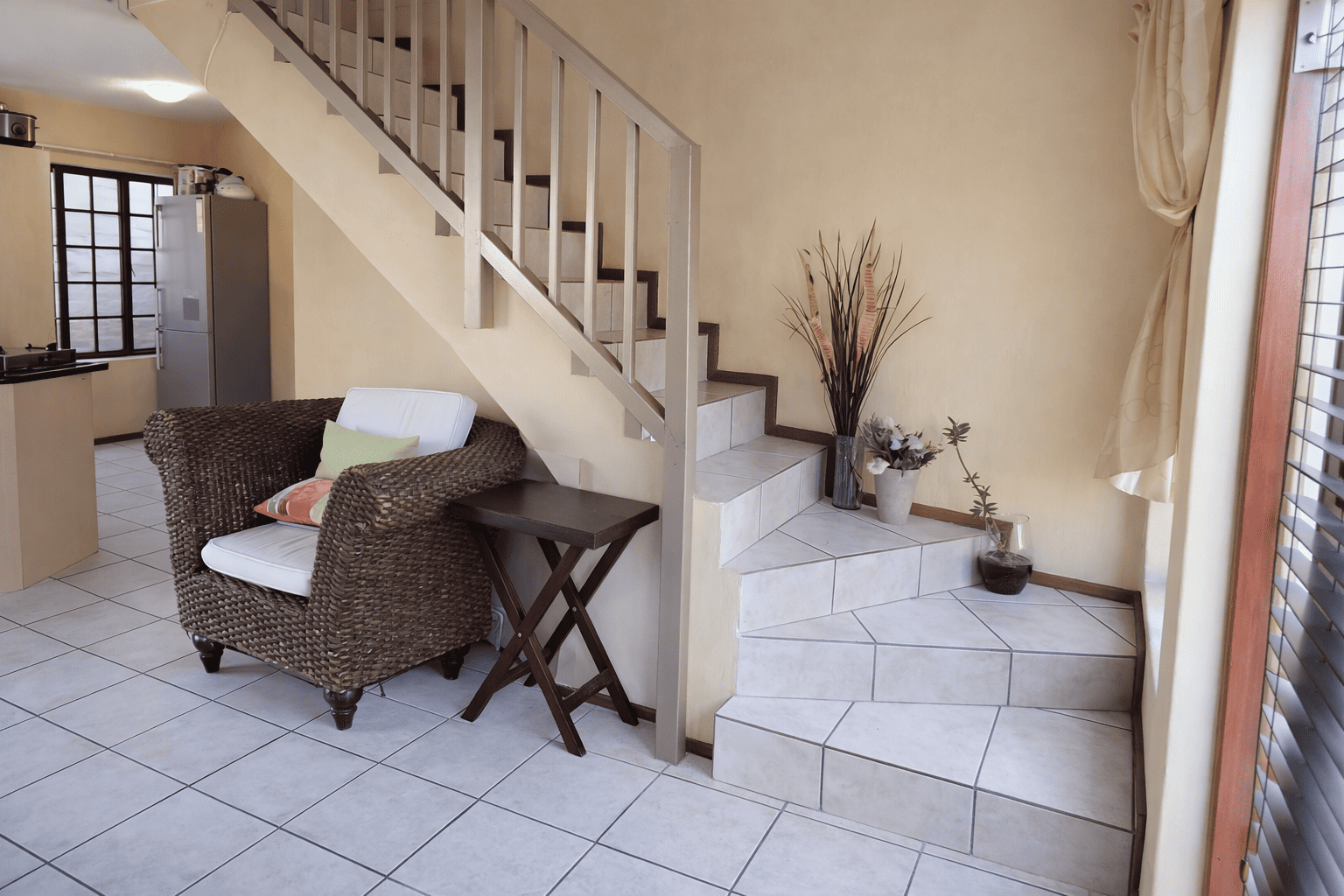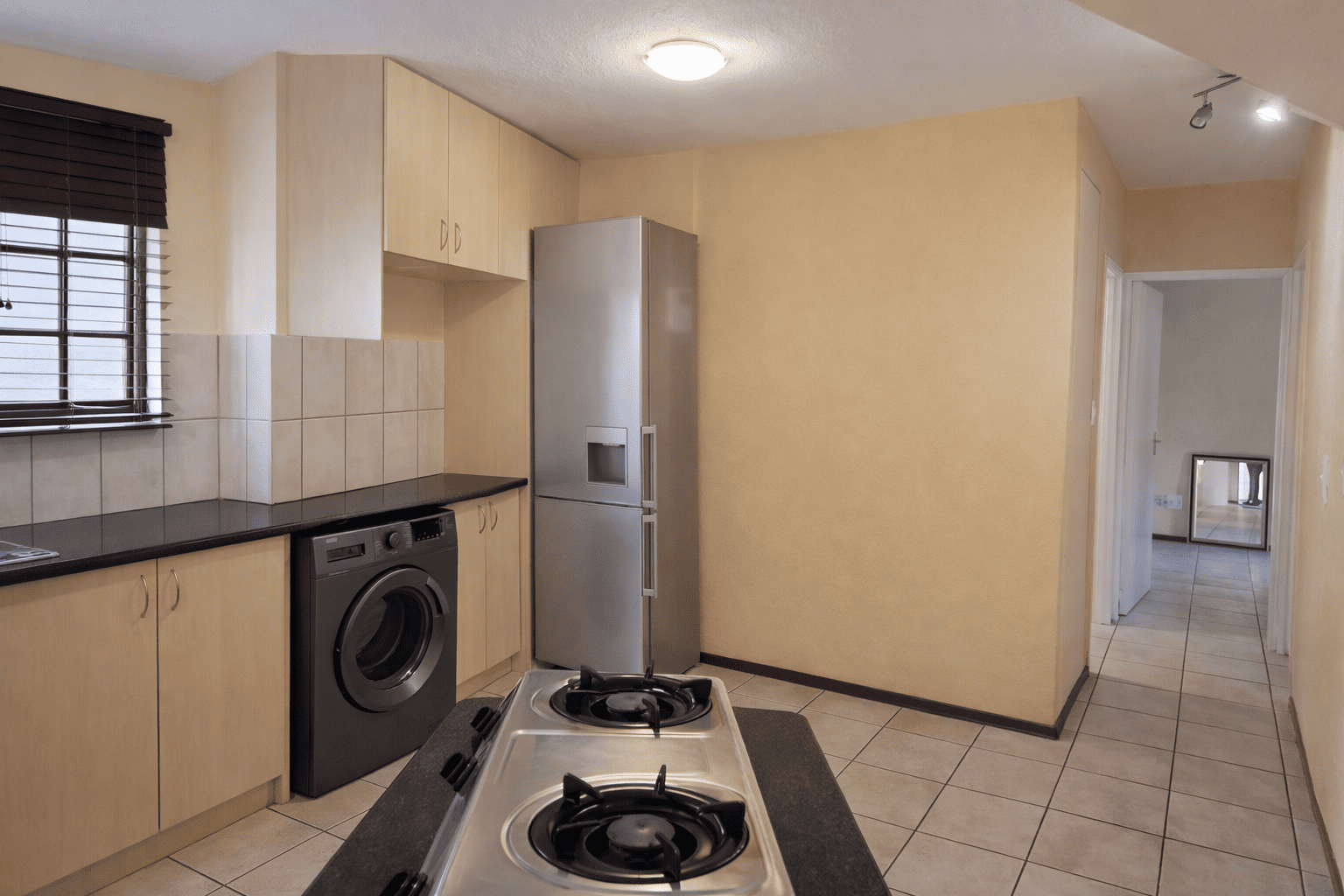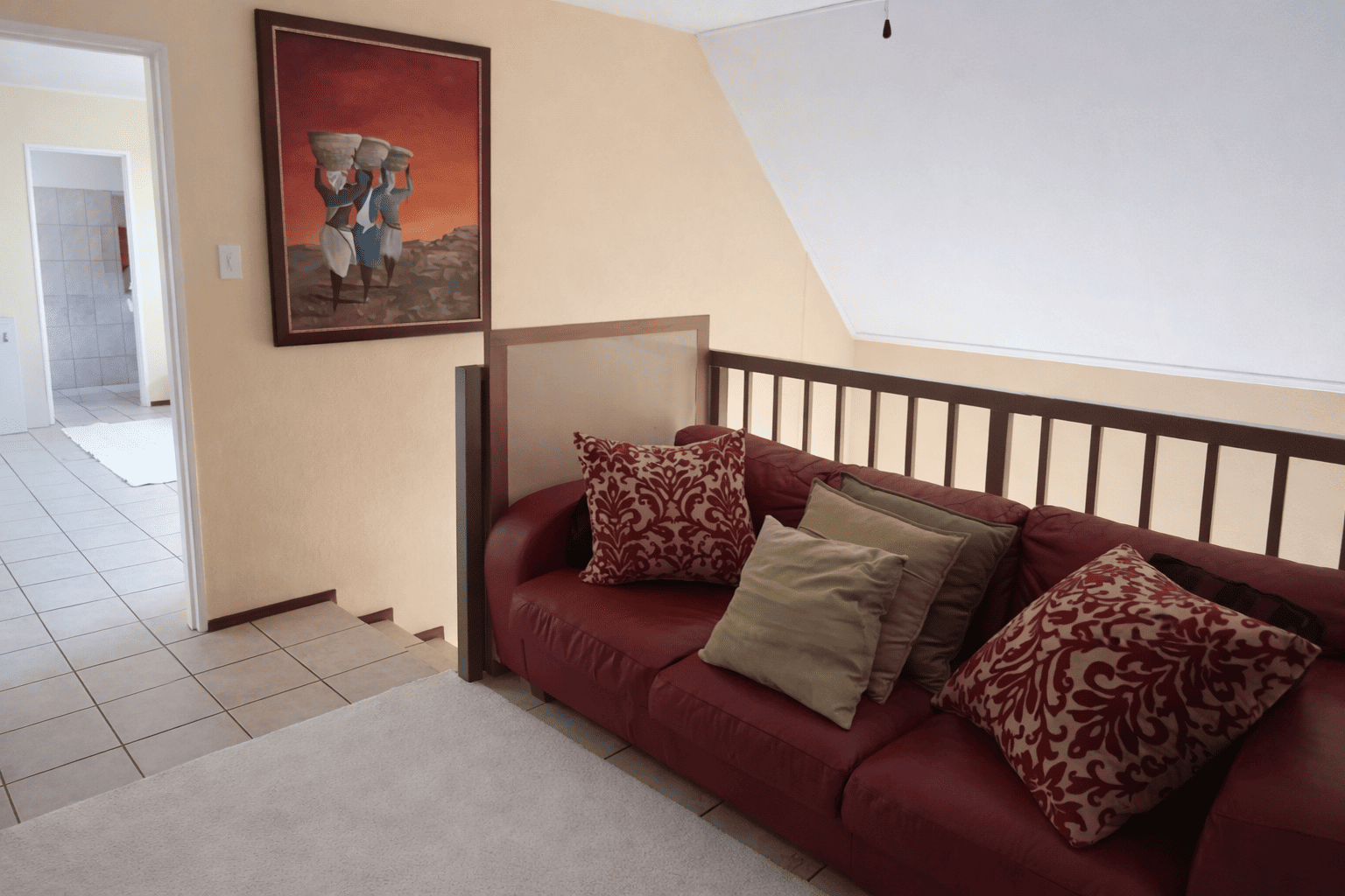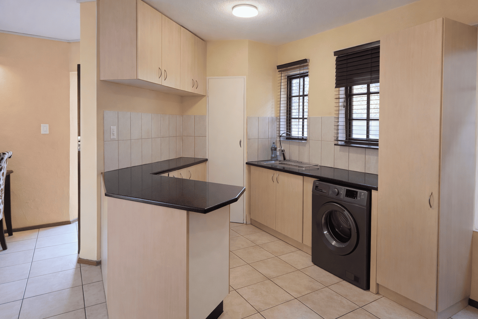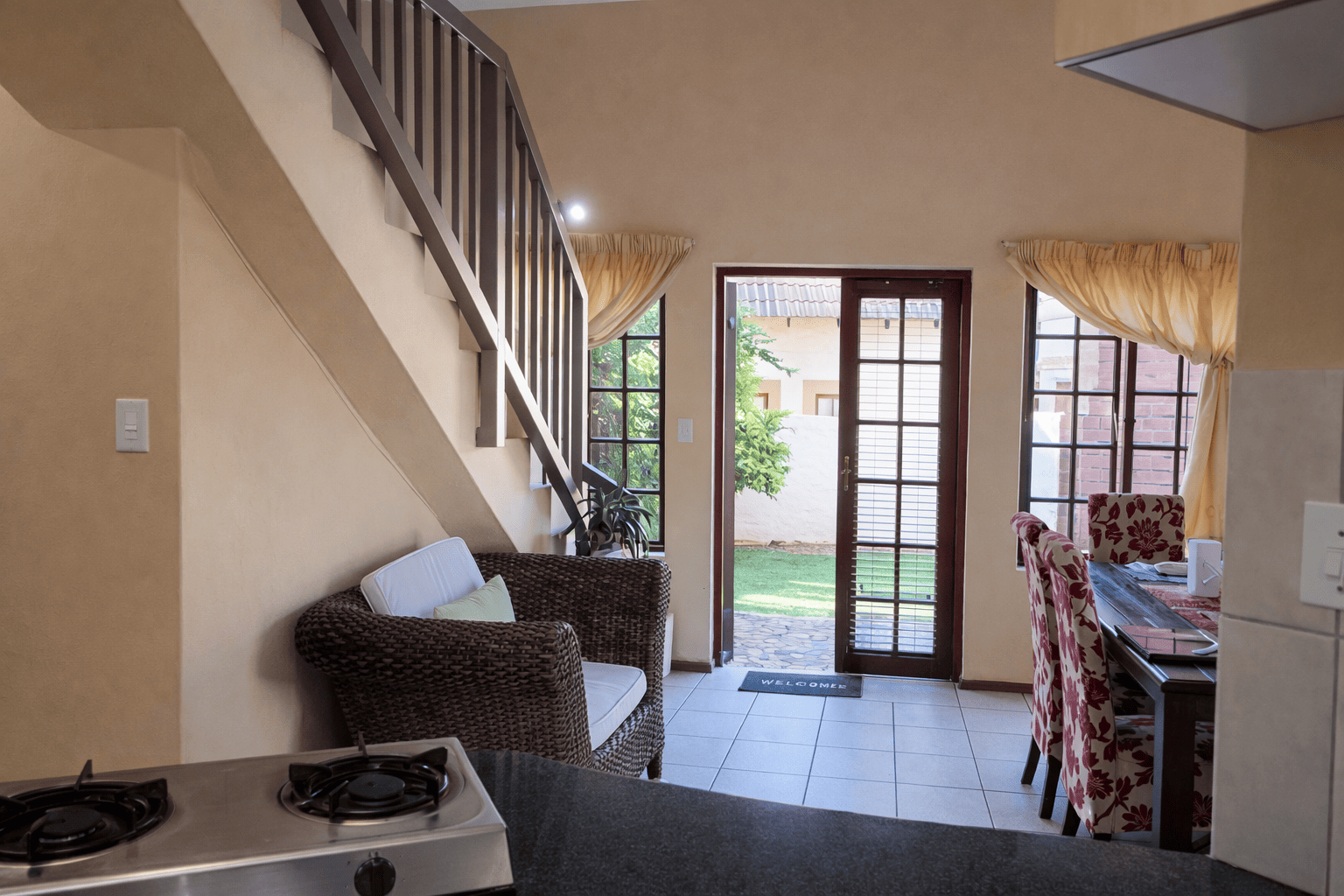 This charming detached unit in Pretoria boasts inviting kerb appeal with its traditional red tiled roof and private brick patio. French doors open to a well-maintained grassy yard featuring mature trees and a built-in braai area, ideal for outdoor entertaining. Two garages provide secure parking. Step inside to a bright, open-plan layout seamlessly connecting the kitchen, dining, and living areas. Abundant natural light fills the space through large windows and glass doors. The functional kitchen is equipped with light wood cabinetry, dark granite countertops, tiled backsplash, and an integrated washing machine. Durable tiled flooring extends throughout the home, complemented by a prominent staircase. The residence offers three comfortable bedrooms and two bathrooms, including a convenient en-suite. Bedrooms are well-lit, with some featuring charming sloped ceilings and ample built-in storage. Situated within a secure complex in Equestria, residents benefit from 24-hour security, electric fencing, and a security gate, ensuring peace of mind. Fibre-ready connectivity is also available. This sought-after suburb is known for its family-friendly environment and convenient access to amenities. Key Features: * 3 Bedrooms, 2 Bathrooms (1 en-suite) * Open-plan living, dining, and kitchen * Private garden with built-in braai * Secure complex with 24-hour security * Two garages * Fibre-ready connectivity * Tiled flooring throughout