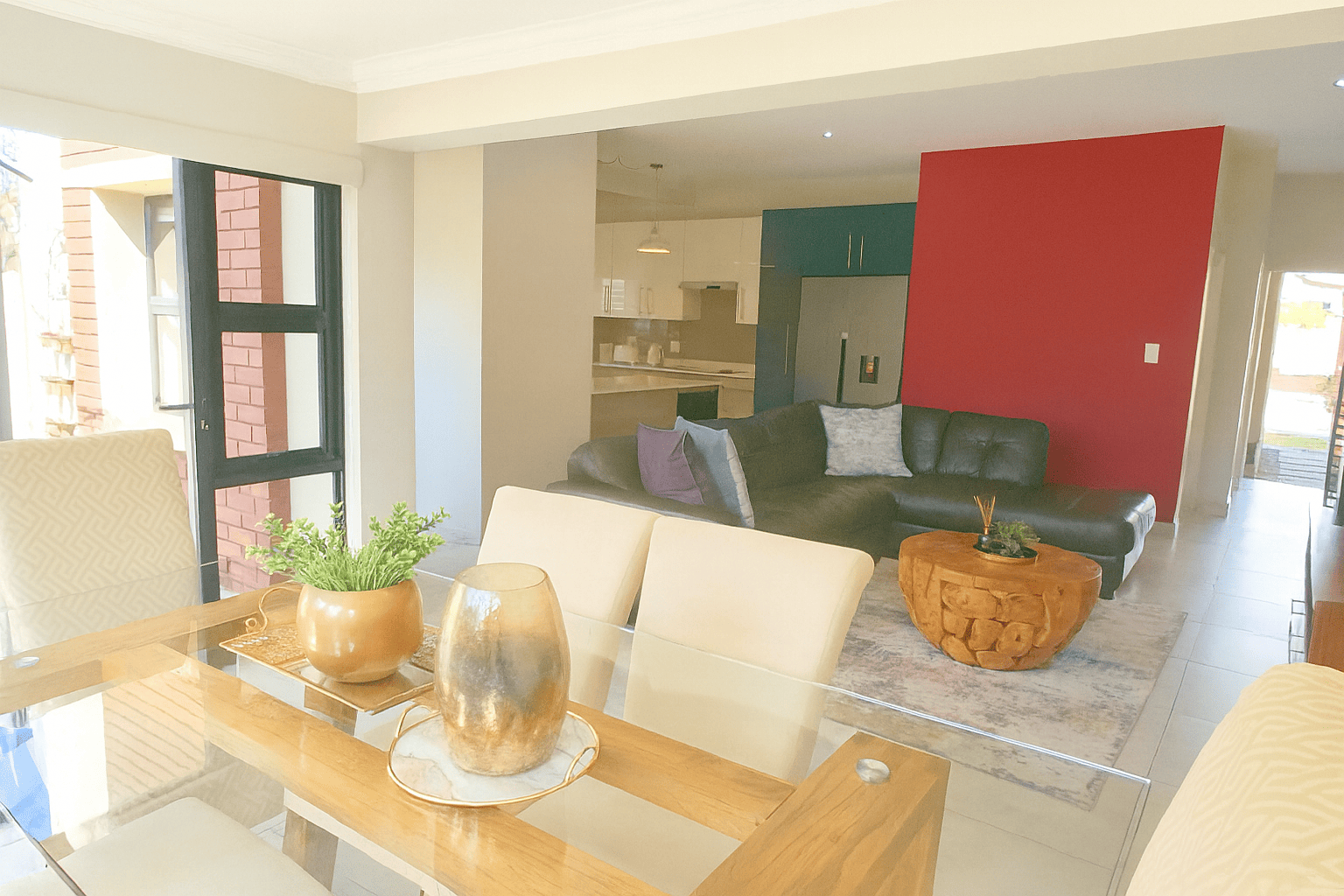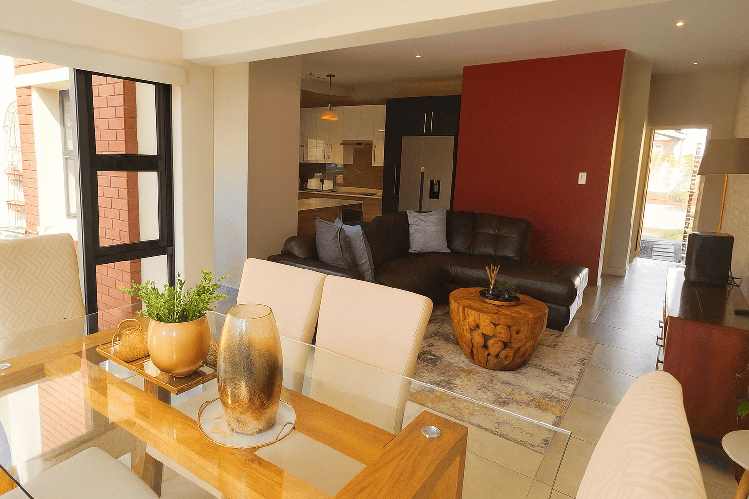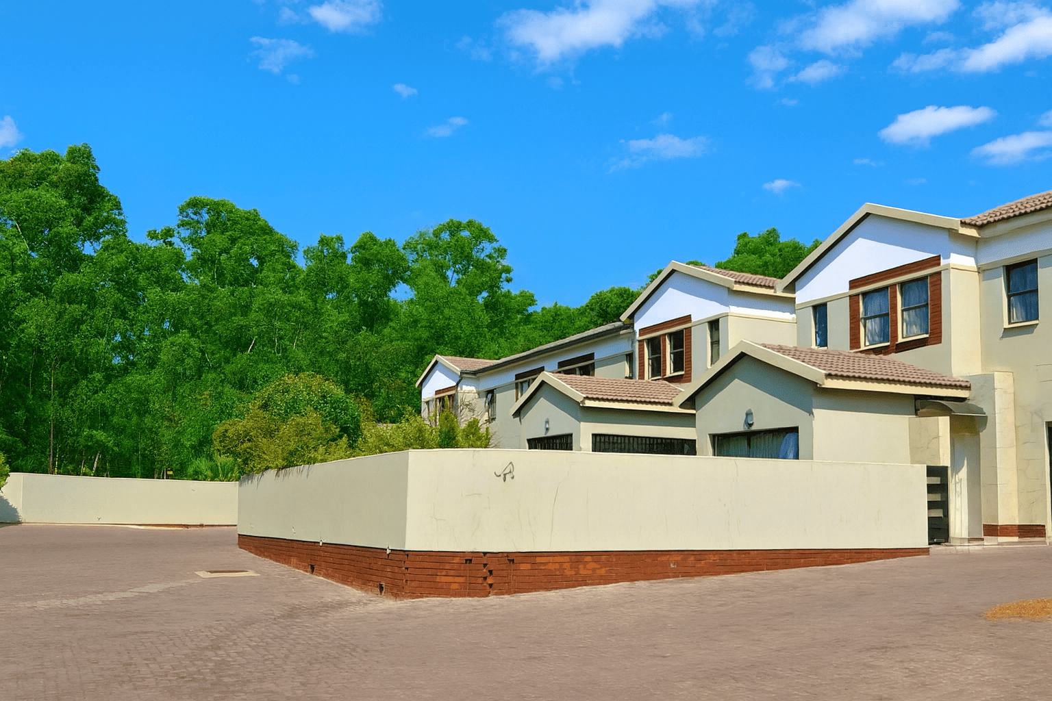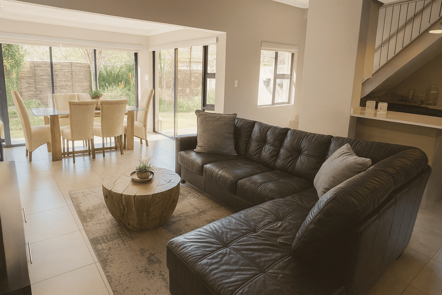 Discover this modern 4-bedroom residence nestled within a secure complex in Equestria, Pretoria. The property impresses with its contemporary architectural design, featuring a light-colored facade and a paved driveway leading to a spacious double garage. Inside, an inviting open-plan layout seamlessly connects the living, dining, and kitchen areas, fostering spaciousness. Abundant natural light floods these areas through large windows and sliding doors, complementing sleek tiled flooring. The contemporary kitchen boasts white cabinetry, perfectly integrated into the home's stylish aesthetic, with distinct accent walls adding character.